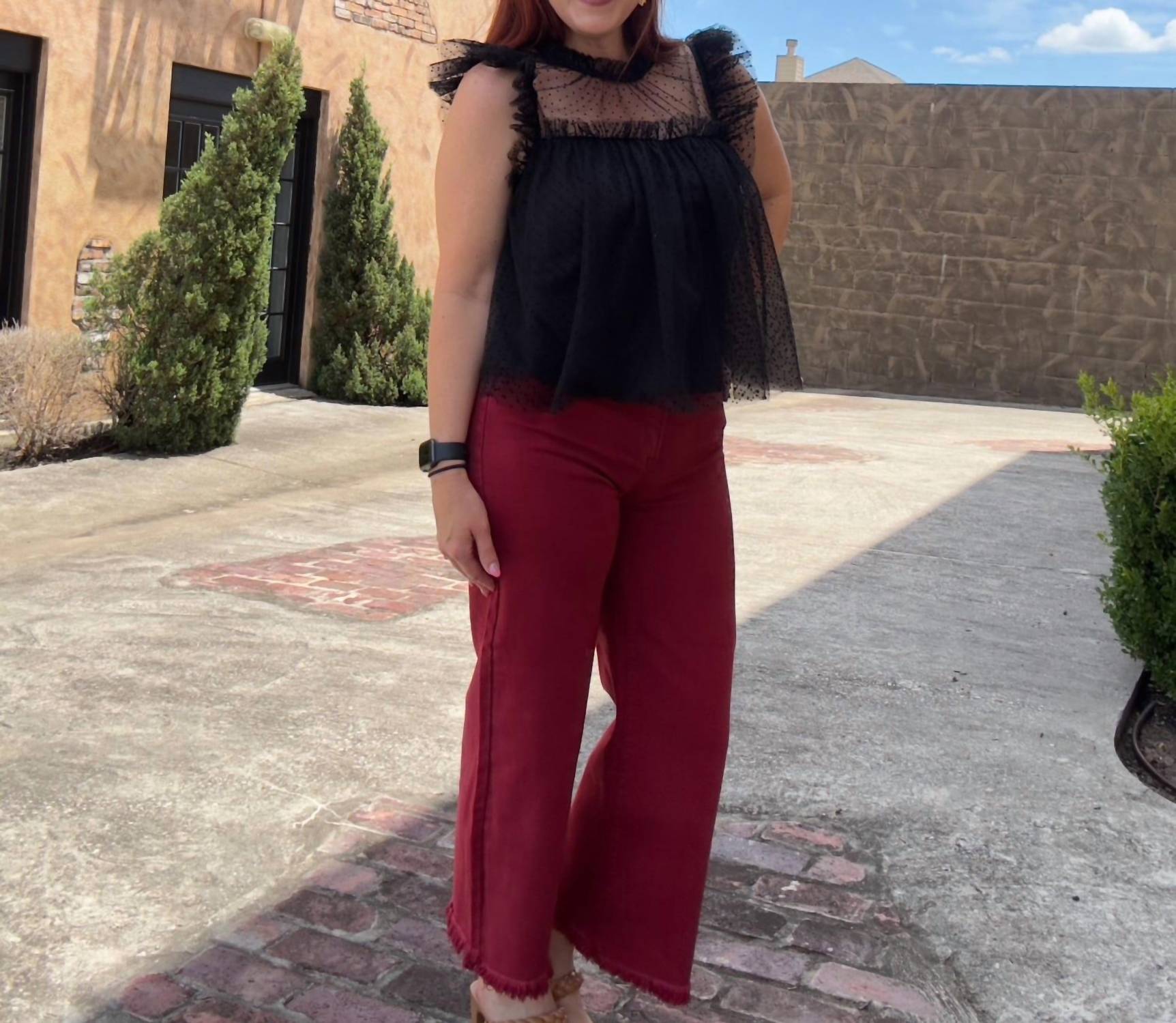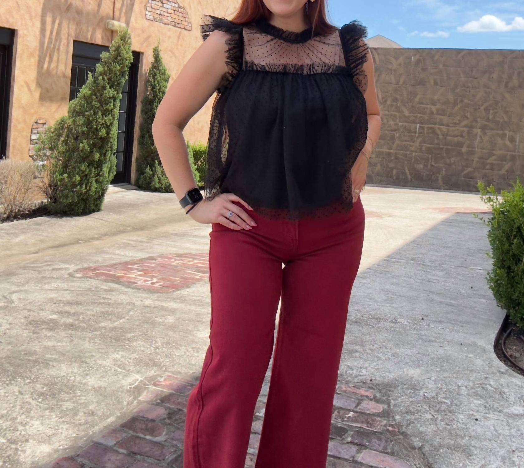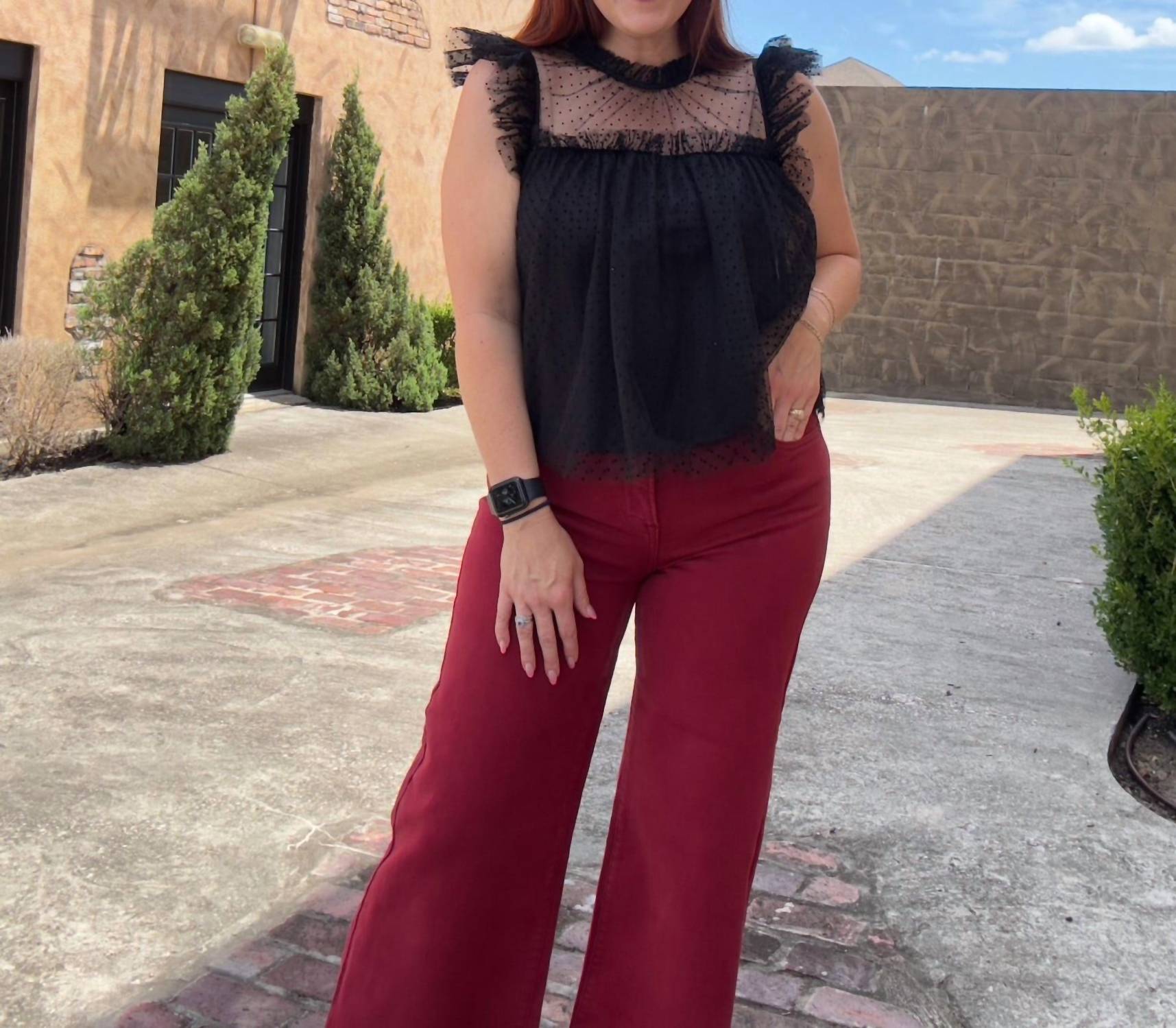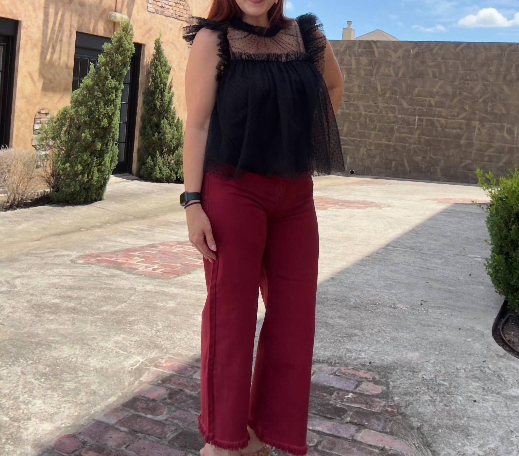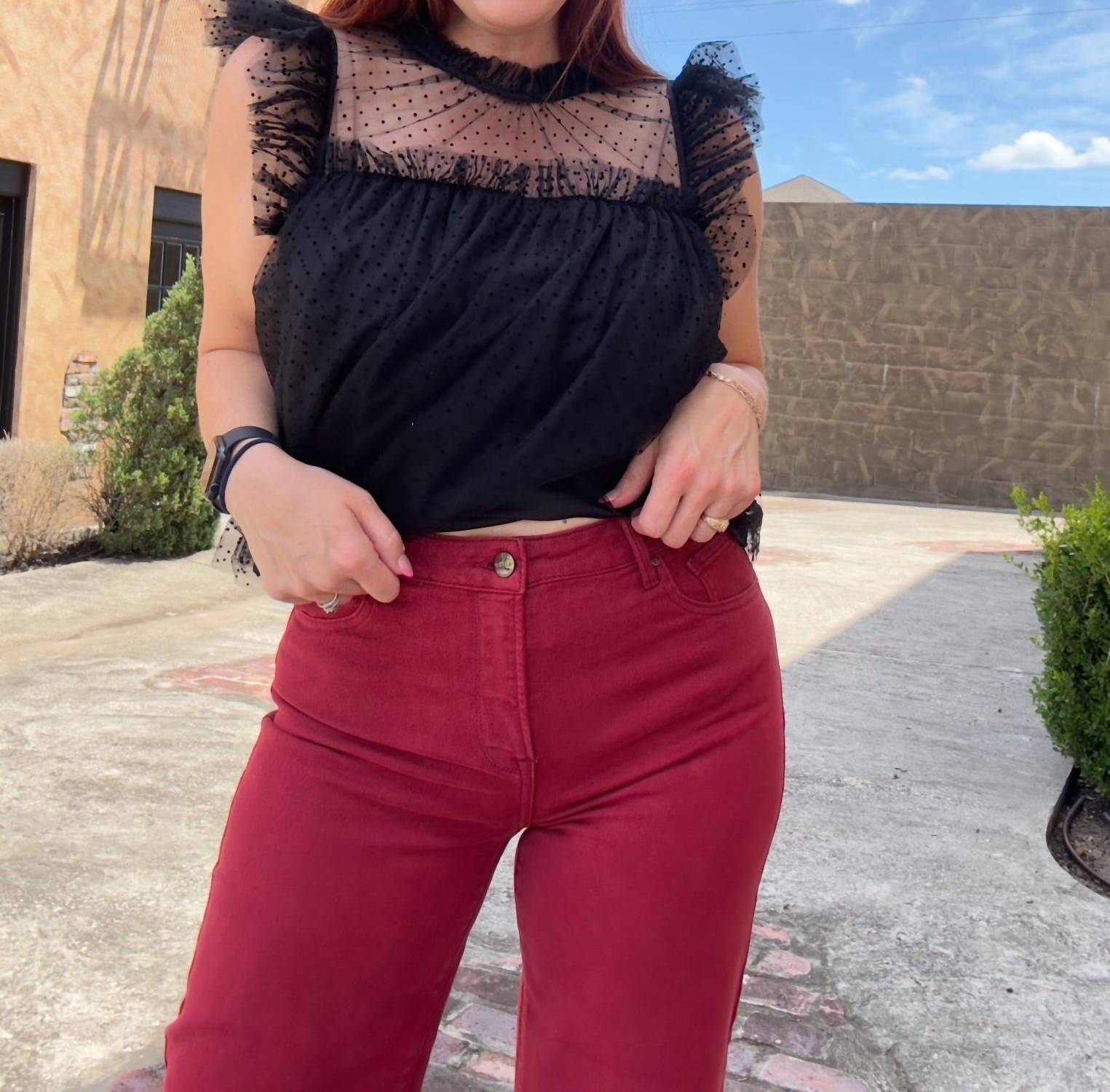 Just as cute as they are comfortable. Designed for the fashion-forward traveler. Wide-leg jeans feature a relaxed fit with a button closure, perfect for streetwear-inspired ensembles. Crafted in a solid deep red hue, offer a comfortable stretch and classic pocket detailing. Care for them easily with machine wash and tumble dry instructions.