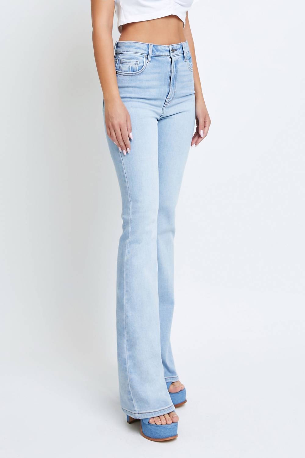 Pair these wide leg jeans with mules, slides or your favorite strappy sandals. Elevate your denim collection with the HIDDEN Happi High Rise Flare Straight Denim Jeans in a versatile light wash. Designed with a relaxed fit, these jeans combine a high rise and classic flared leg for a flattering silhouette. Crafted from a comfortable cotton blend with a touch of stretch, they feature a 34" inseam and an 11 1/2" front rise, perfect for chic dinner parties or capturing Y2K summer vibes. Closure: Zip closure. Care: Machine wash, tumble dry. Available in sizes 24 to 31, with model wearing a size 26.