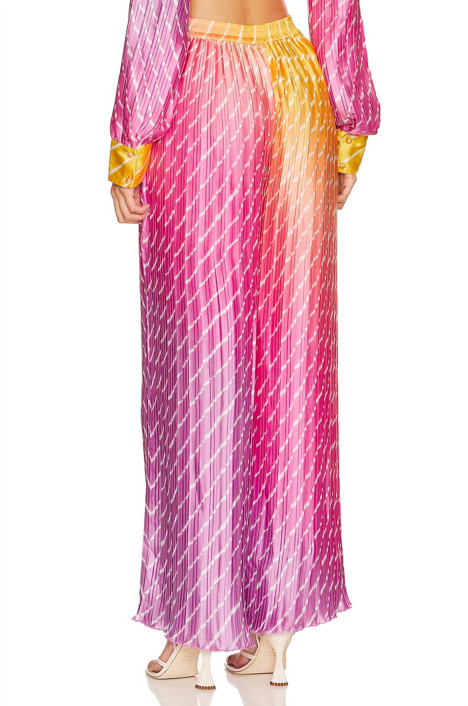 100% polyester. Made in India. Dry clean only. Hidden side zipper closure. Pleated satin fabric. Item not sold as a set. 69 cm at the knee breaks to 76 cm at the leg opening.