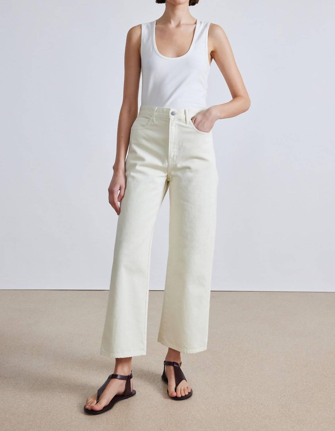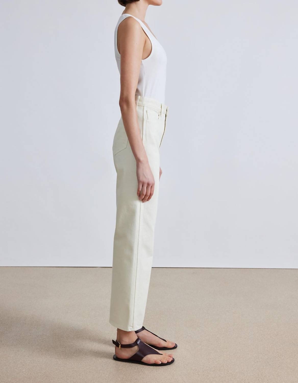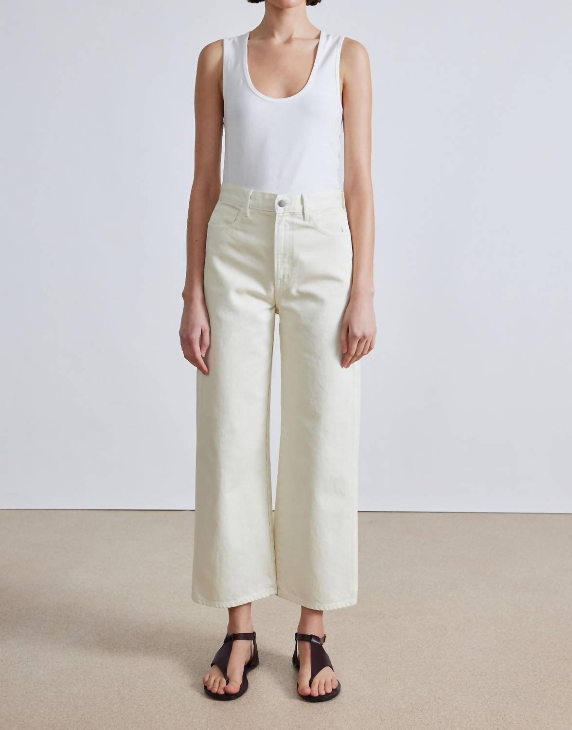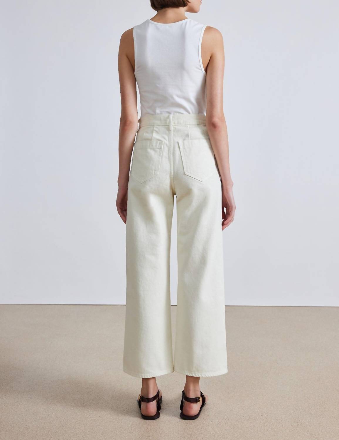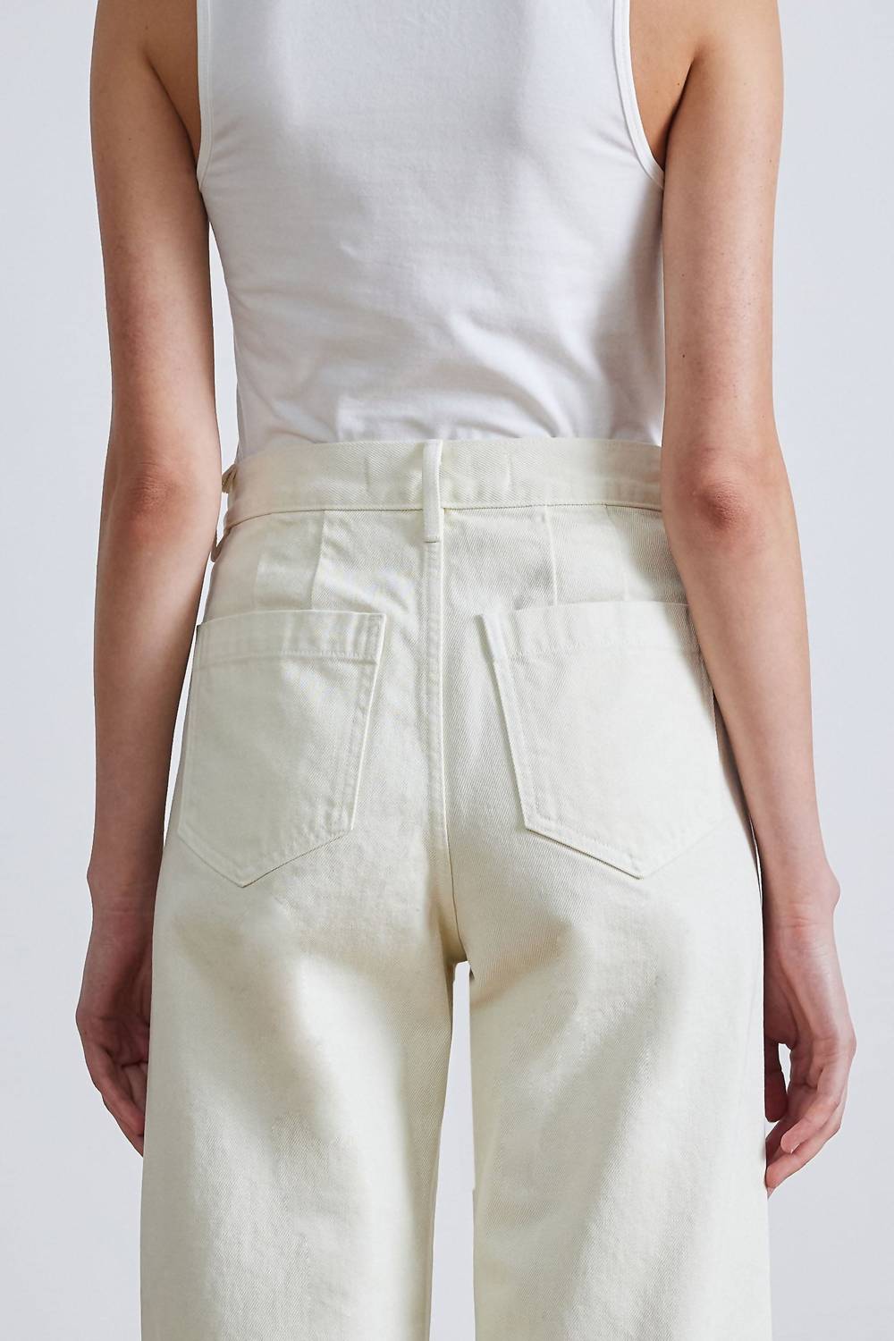 Just as cute as they are comfortable. Meet the Merida Jean by APIECE APART, a chic addition to your wardrobe in a versatile ECRU color. These high-waisted, cropped kick flare jeans offer a sleek silhouette with a fitted hip design and feature practical front scoop pockets and back patch pockets. Crafted from a blend of 79% organic cotton, 20% recycled cotton, and 1% lycra, they are made in Los Angeles and include a zipper closure for a snug fit. Care is a breeze with machine wash cold inside out, with specific inseam of 27.5" and a front rise of 11.5". Model is 5'10" and wearing a size 26; consider sizing up as they run small.