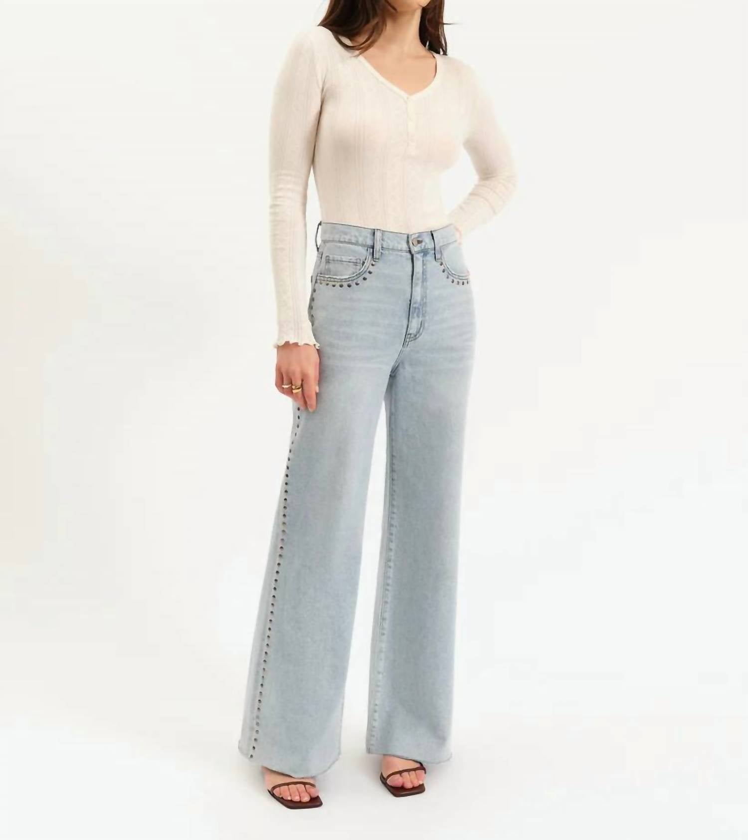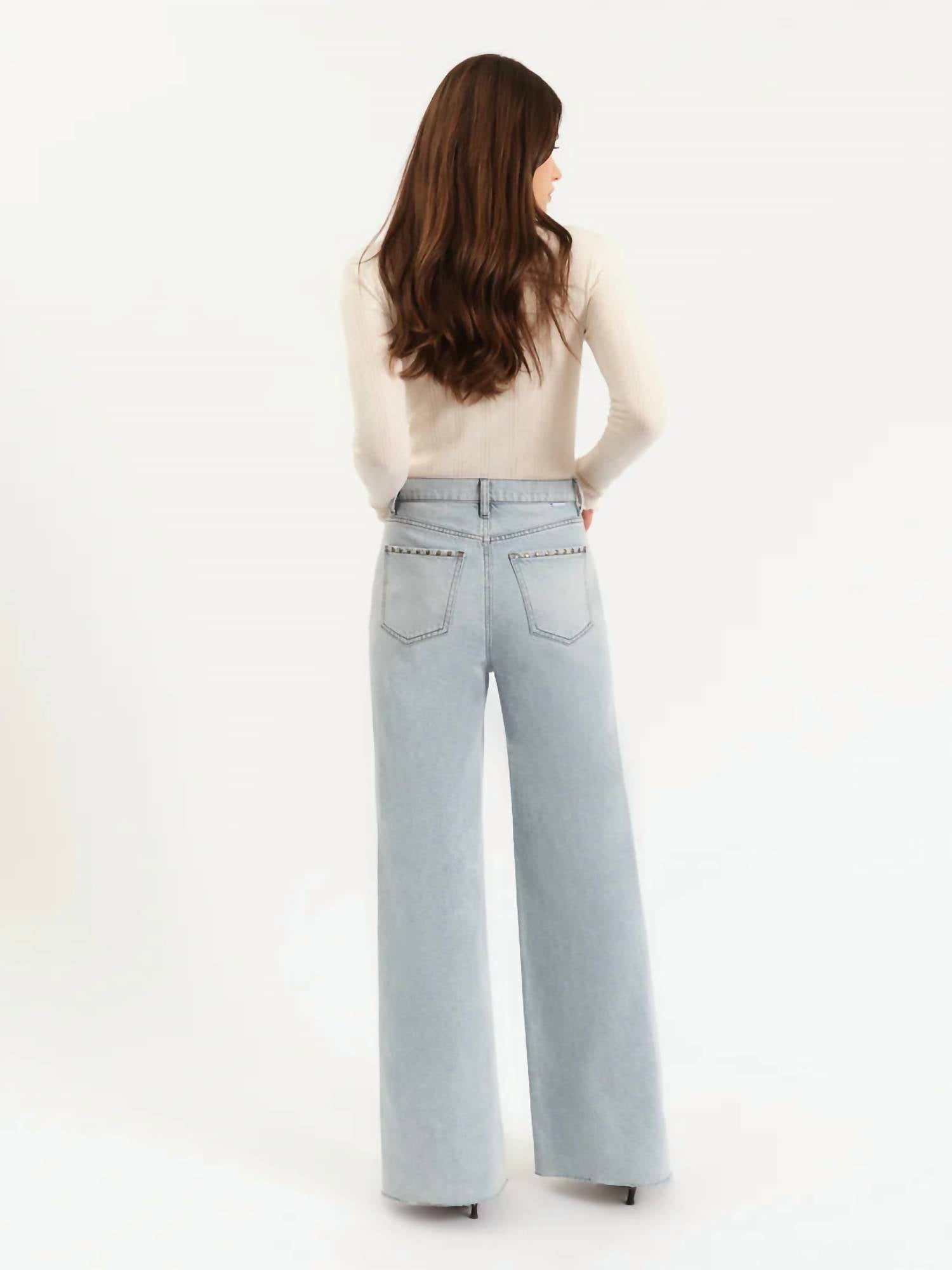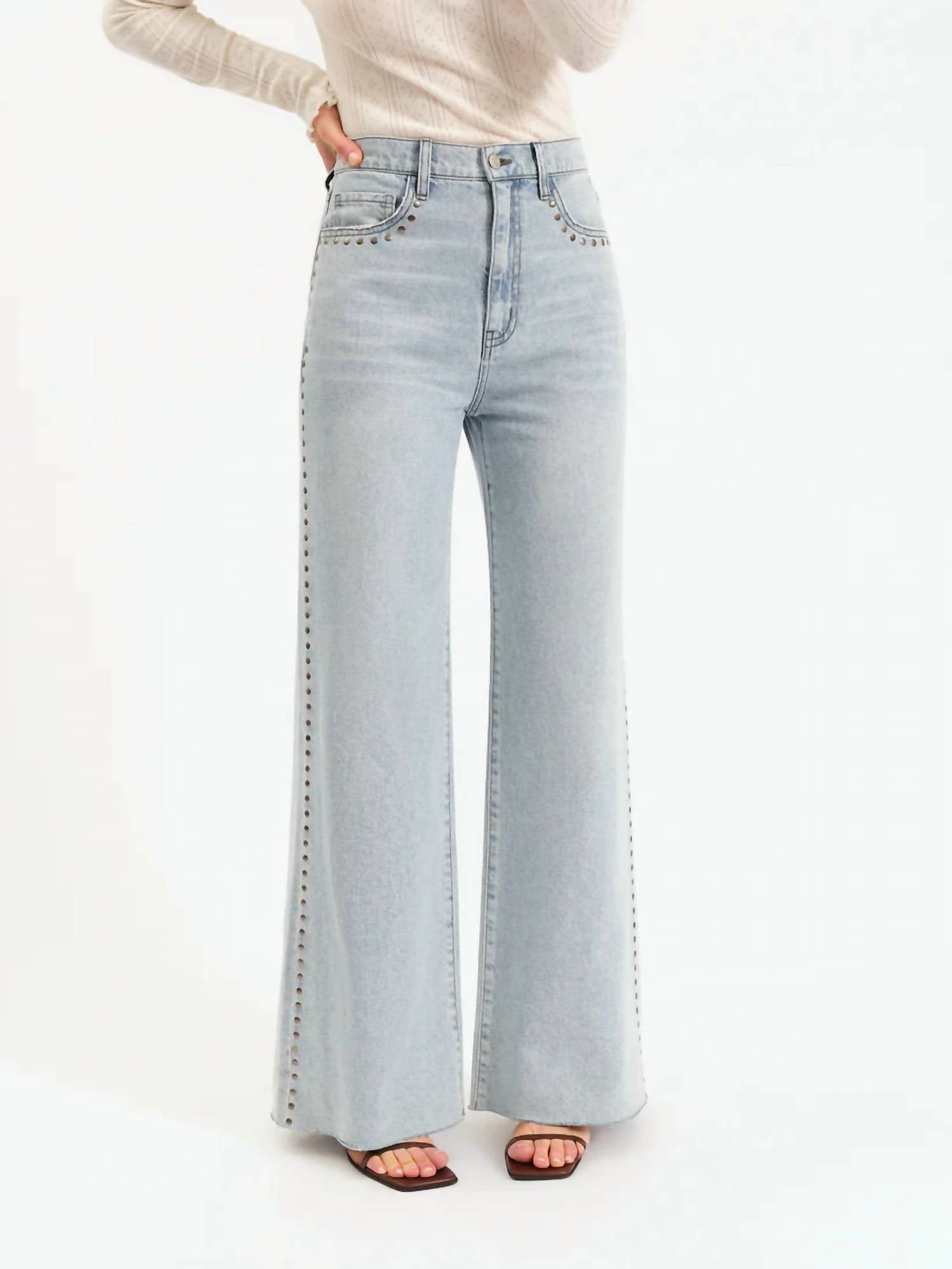 A flattering silhouette that's suprisingly versatile. Elevate your streetwear collection with the Far Out High Rise Wide Leg Jeans by DAZE, a summer staple in a light blue denim wash. Crafted from 100% cotton, these jeans feature a distinctive high-rise waist and a 12" garment length, finished with stylish studs along the side seams for a striking look. Designed for a regular fit, the wide leg style comes with a 32" inseam and 23.5" leg opening, and includes functional pockets. Closure: Button closure. Care: Machine wash cold, lay flat to dry.
