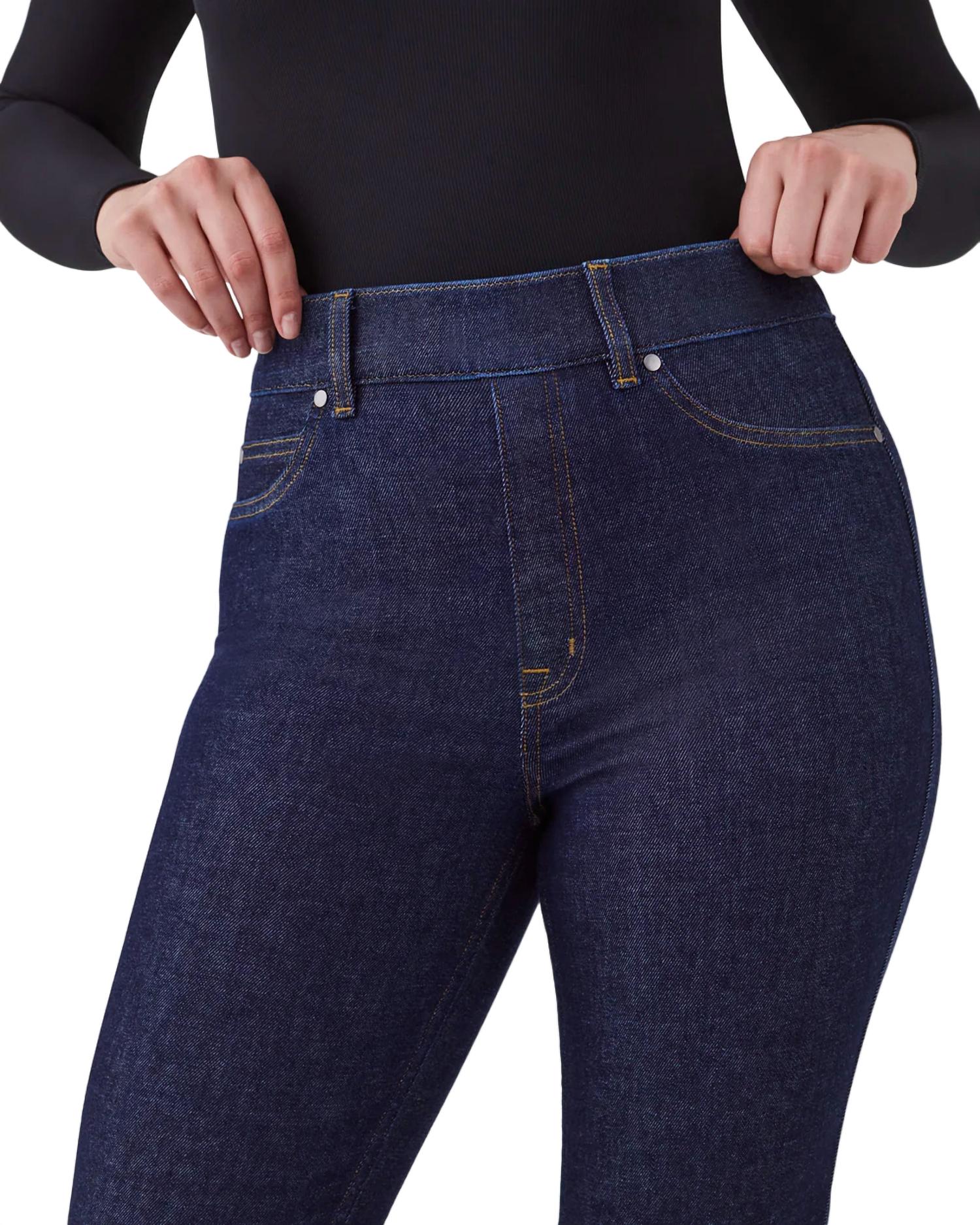 Designed with premium stretch denim, high-rise coverage, a pull-on design and hidden core shaping technology. Ankle length with a slightly flared leg. Pull-on styling. Body: 87% Cotton, 11% Polyester, 2% Elastane. Lining: 80% Polyester, 20% Cotton. Machine wash cold.