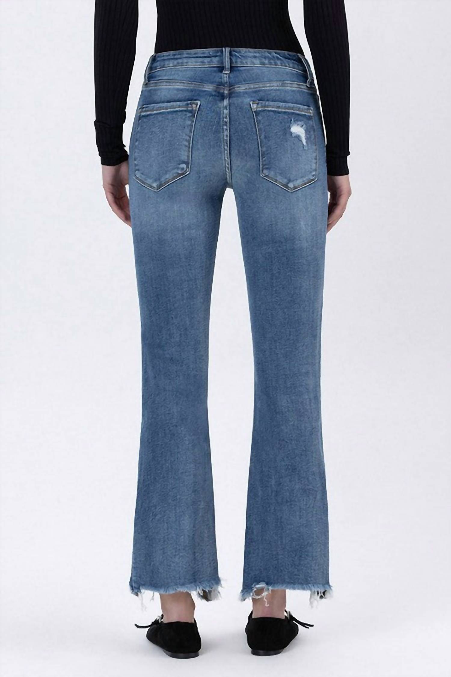 Just as cute as they are comfortable. Elevate your summer wardrobe with the Women's Mid Rise Ankle Jeans by LOVERVET, featuring a comfortable stretch denim composition and a medium wash for a relaxed streetwear vibe. These jeans boast a mid-rise waist and a chic frayed hem, with an ankle-length bootcut fit that adds a modern twist to the classic flare and wide-leg style. The jeans include a convenient zip closure and are accented with distressed detailing, providing a laid-back textured look. With a front rise of 9", an inseam measuring 27.5", and a 16" leg opening, these jeans are perfect for vacation outings or everyday wear, effortlessly combining style and comfort.