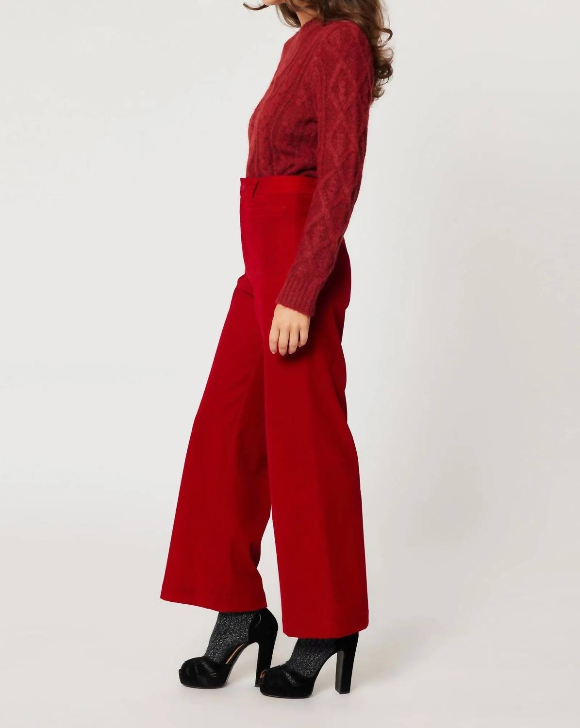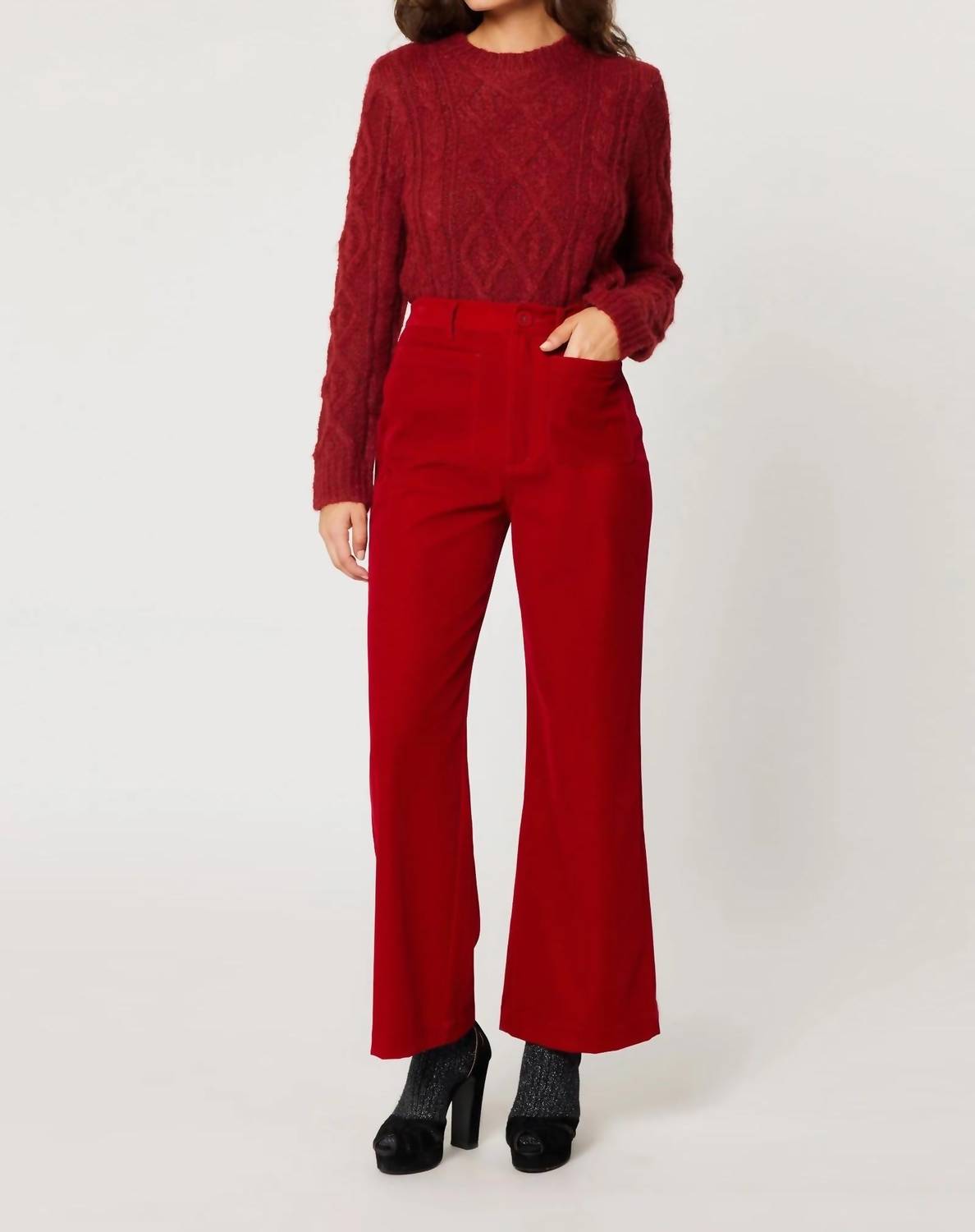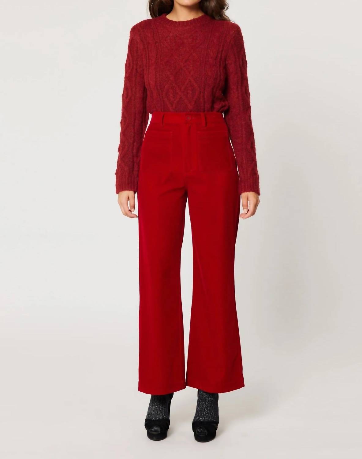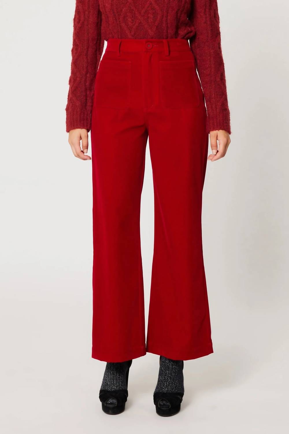 Just as cute as they are comfortable. Elevate your ensemble with the ROLLA'S Sailor High Rise Velvet Jean in a striking ruby shade, perfect for those dinner parties and New Year's Eve gatherings. These super high rise jeans offer a slim fit with a stylish wide leg and feature signature sailor patch pockets for a unique touch. Made with luxurious velvet material, they boast Rolla's vintage logo button and trims, accentuating the ankle-length design. Closure: Zip closure. Care: Machine wash.