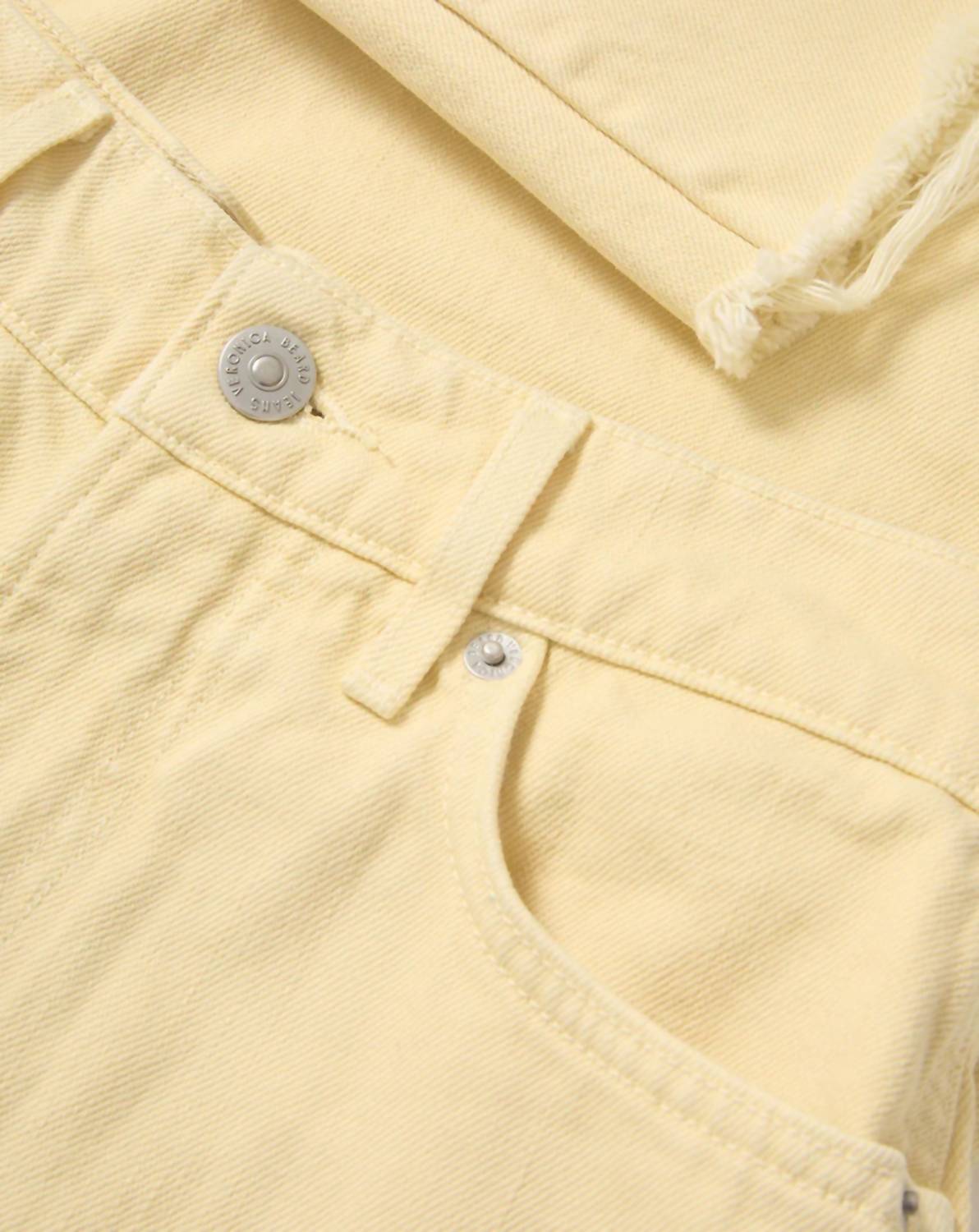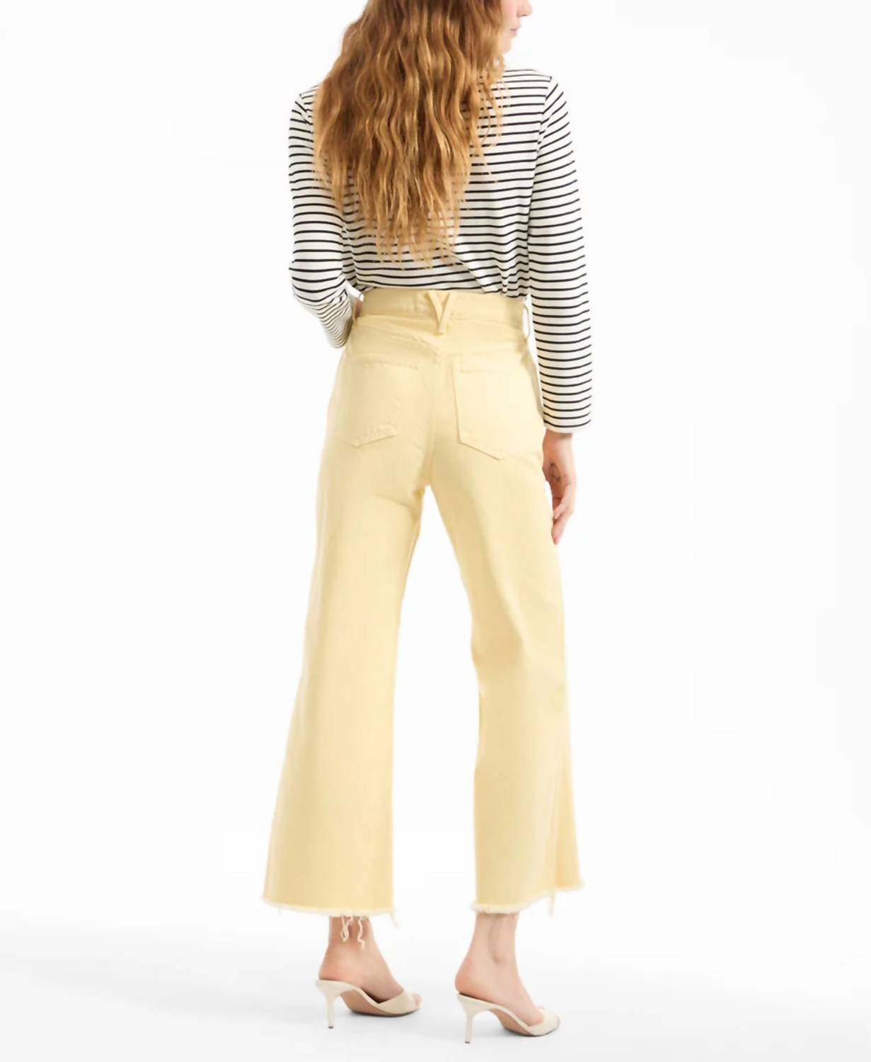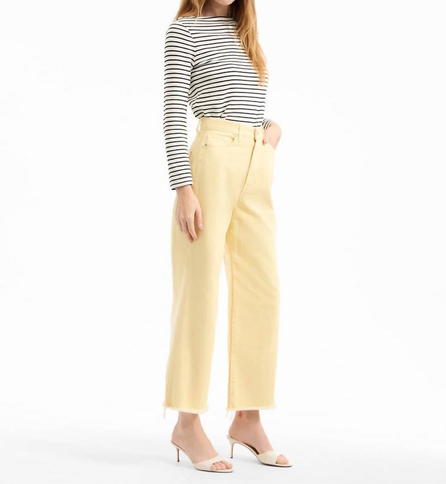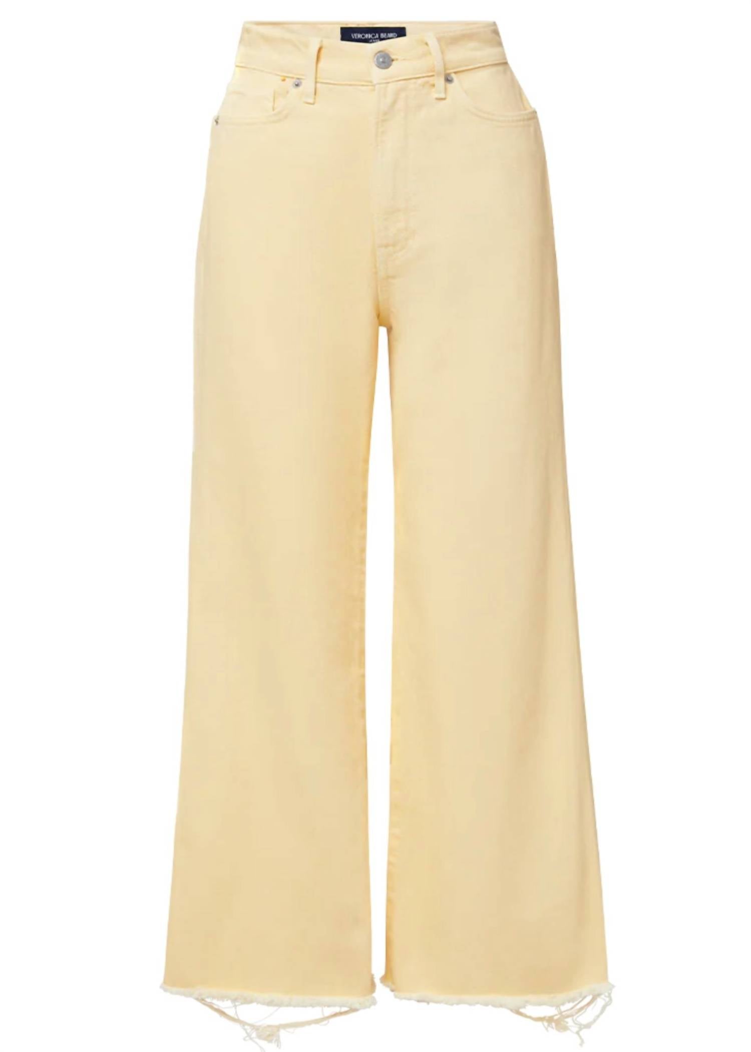 Just as cute as they are comfortable. Introducing the Taylor Cropped Wide Leg Jeans by Veronica Beard, now available in a trending butter yellow hue for a chic update. Crafted from 100% premium non-stretch Japanese cotton denim, these high-rise jeans feature a relaxed, wide-leg silhouette with a 27" inseam and a 22” leg opening. Made in the USA, the stylish cropped ankle design is perfect for showcasing your favorite shoes. The zip closure ensures a secure fit, and these jeans are easy to care for: simply turn them inside out, machine wash cold, and hang to dry. Model is 5'10" and wears a size 26 with a 12" rise.