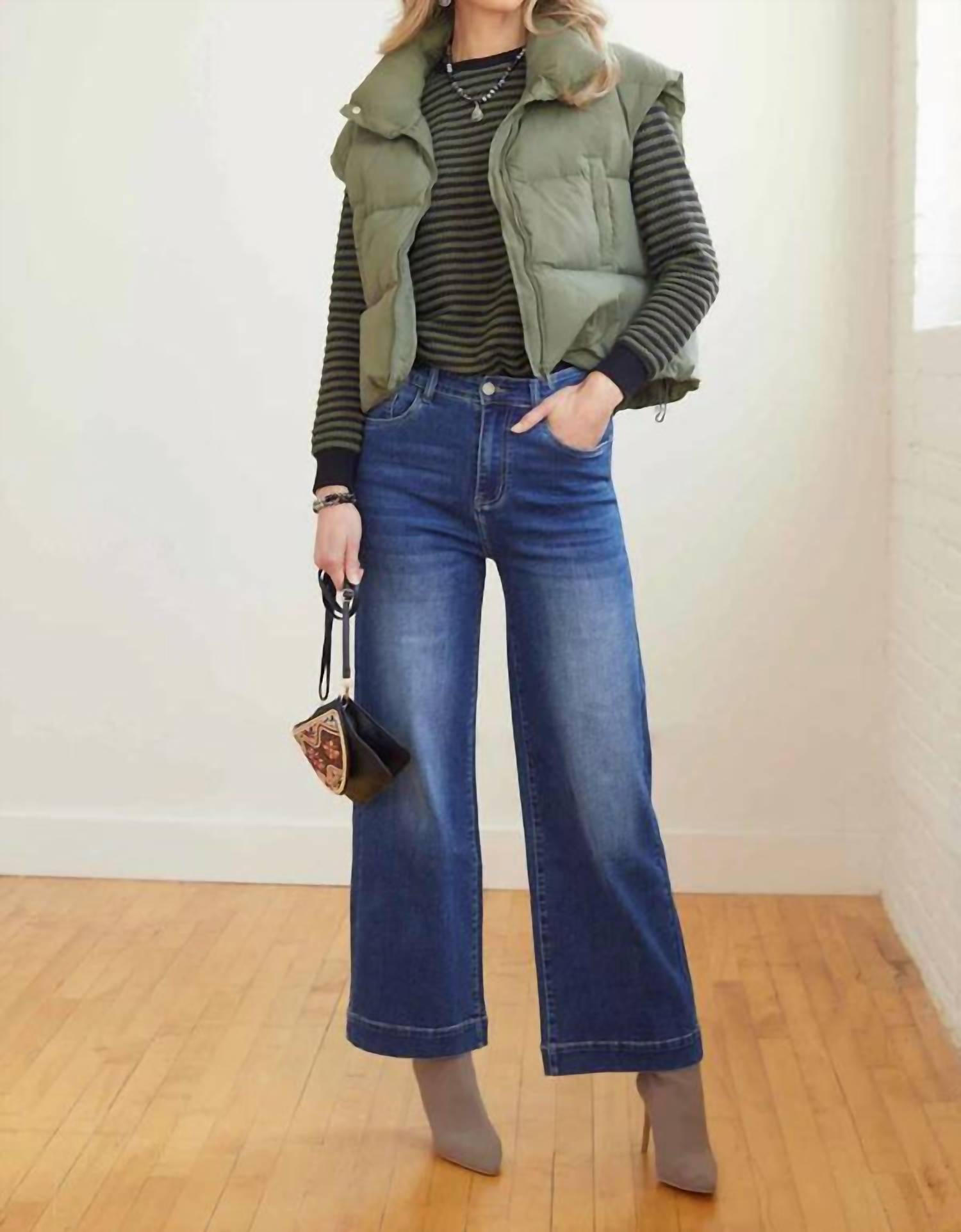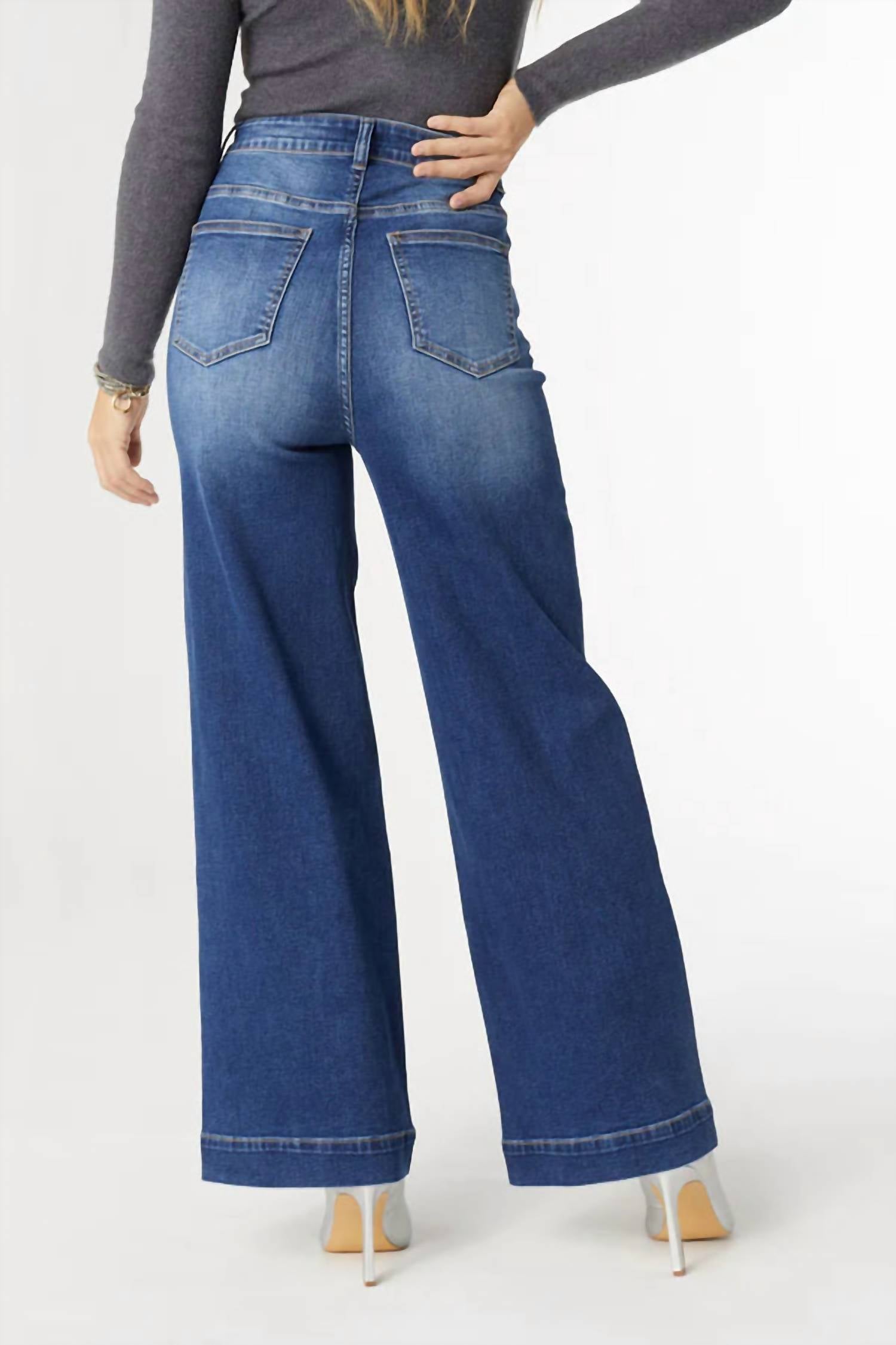 Pair these wide leg jeans with mules, slides or your favorite strappy sandals. Introducing the COCO + CARMEN Everstretch Hi Rise Wide Leg Pants in a striking blue, the perfect choice for your next holiday party. These women’s pants feature a regular fit with a wide leg style and high rise waist, ensuring both comfort and elegance. Made from a blend of polyester and spandex, they offer a luxuriously soft touch and gentle stretch, complemented by an elastic back and smooth front. Enhancing functionality, these pants come with practical pockets and a secure zip closure.