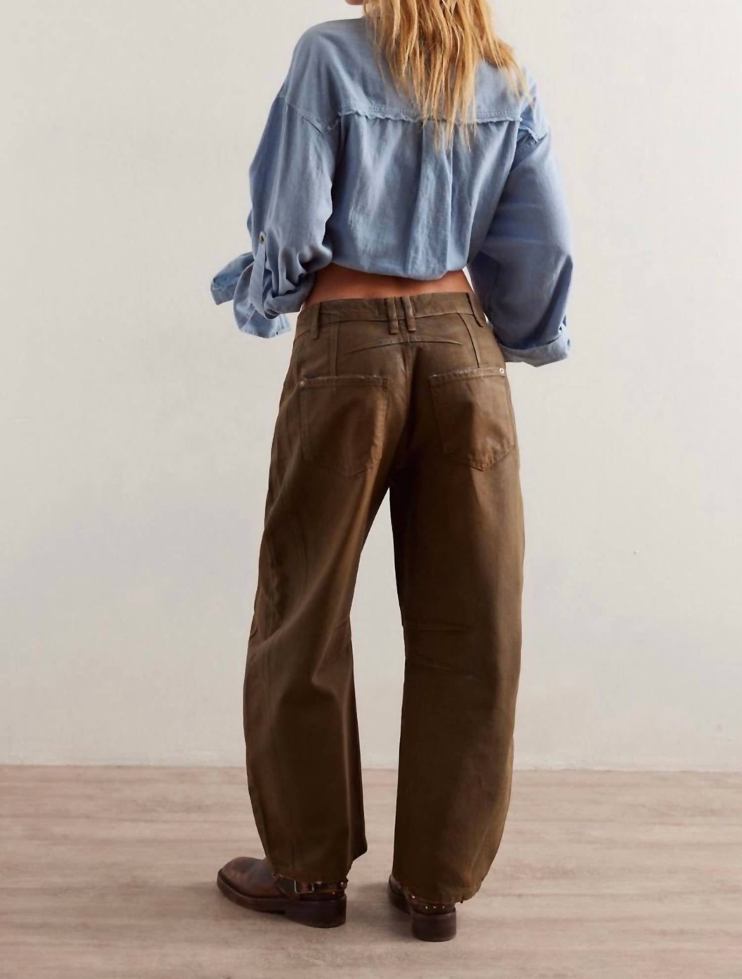 A flattering silhouette that's suprisingly versatile. Experience the effortlessly chic style of the Good Luck Coated Barrel Jeans by Free People, offered in the striking New Moon hue. These jeans, composed of 43% Lyocell and 57% Cotton, present a mid-rise and tapered barrel silhouette that perfectly complements their wide-leg design. Featuring a button-fly closure, sleek coated fabrication, and a functional four-pocket design, these jeans are ideal for a versatile wardrobe. Easy to maintain with a machine wash cold, these imported jeans are a staple from the We The Free label, ideal for music festivals and summer adventures.
