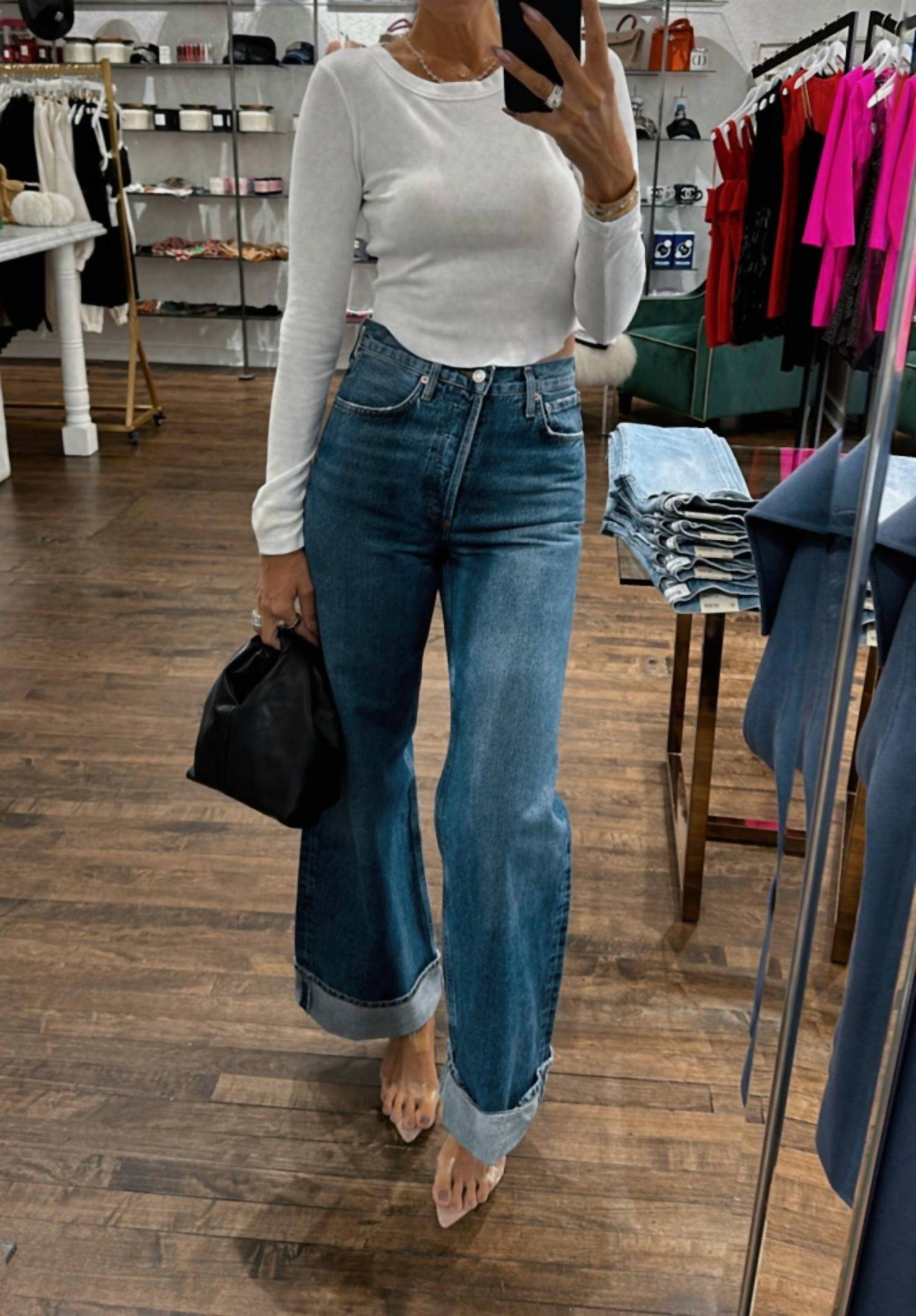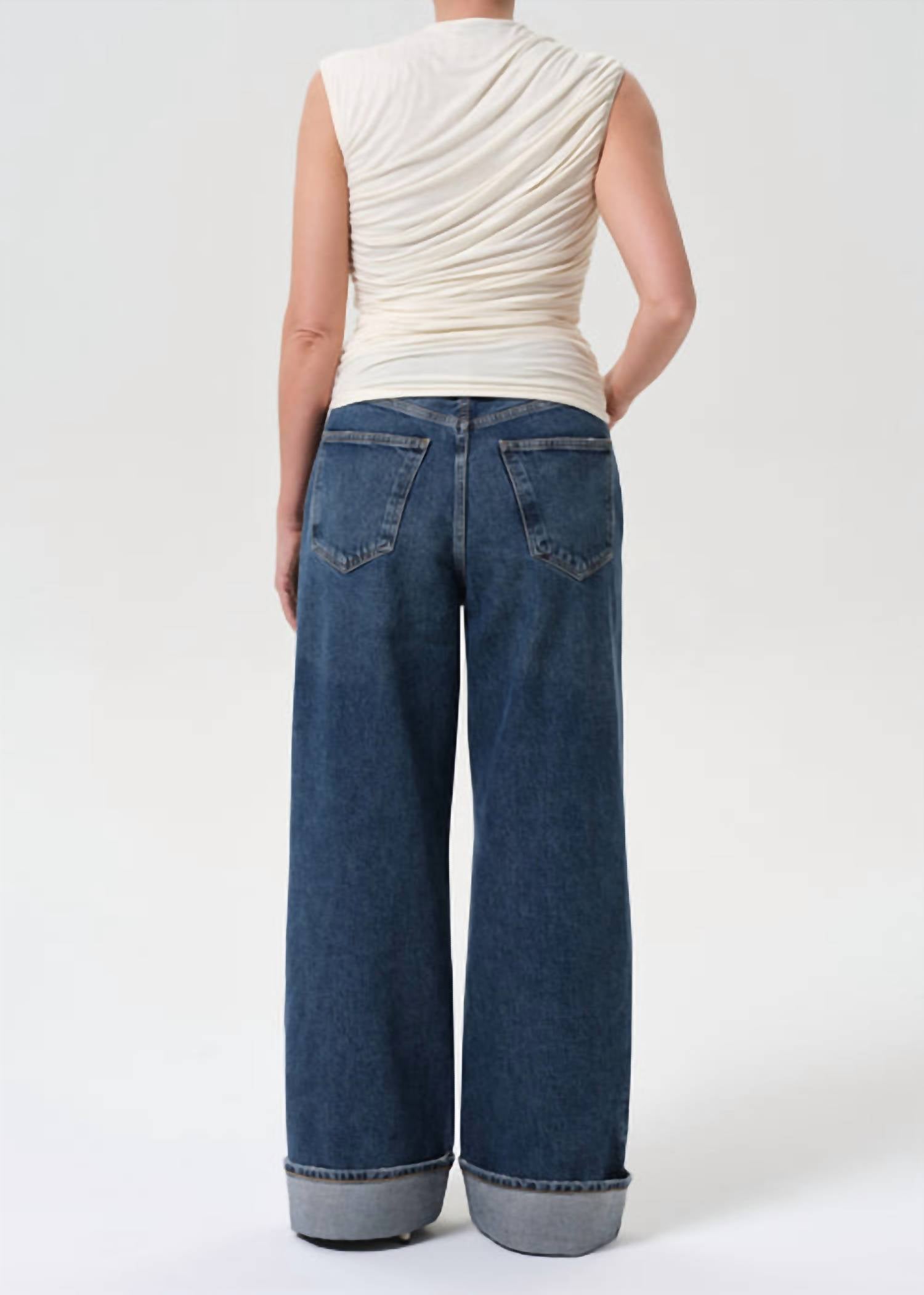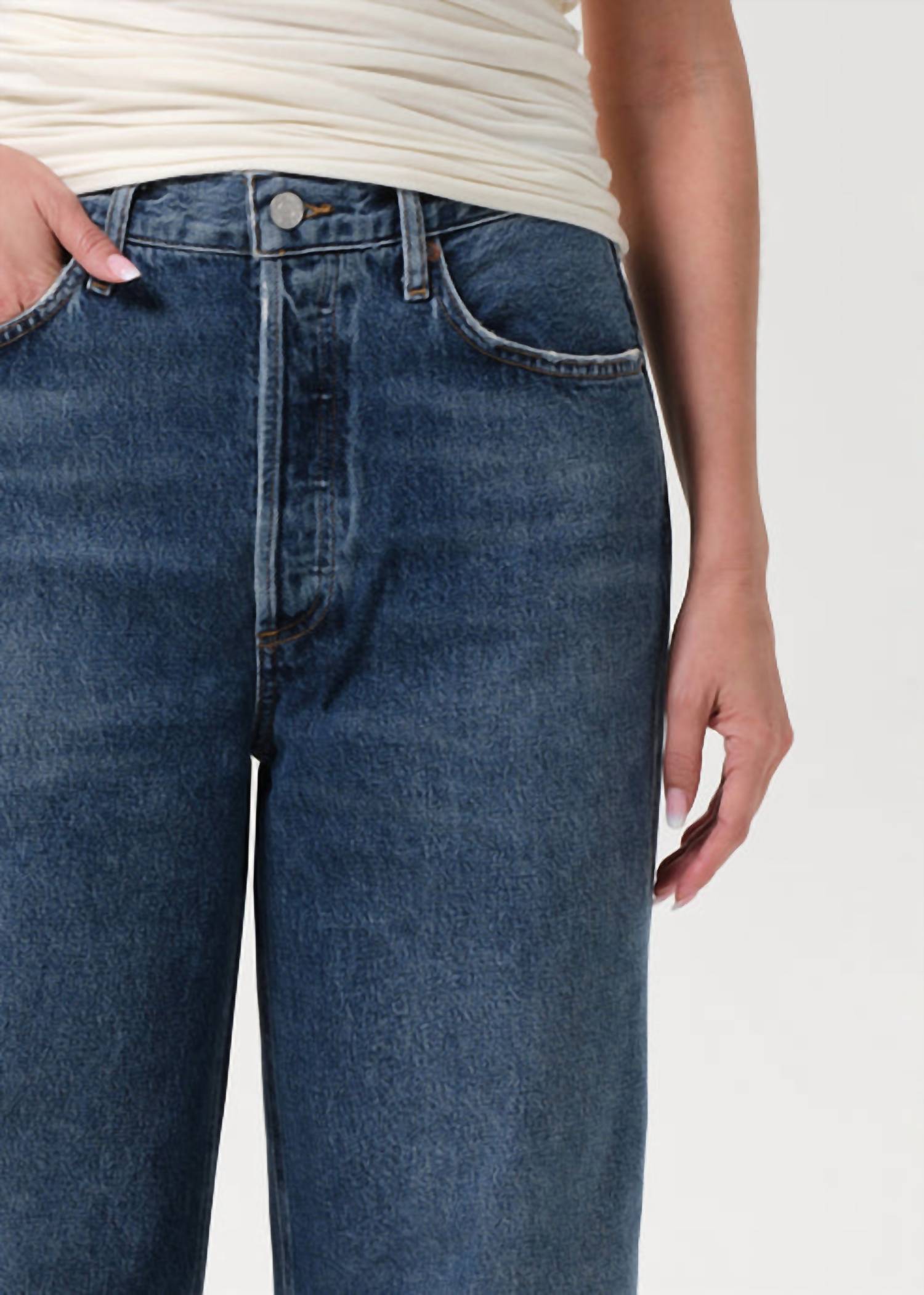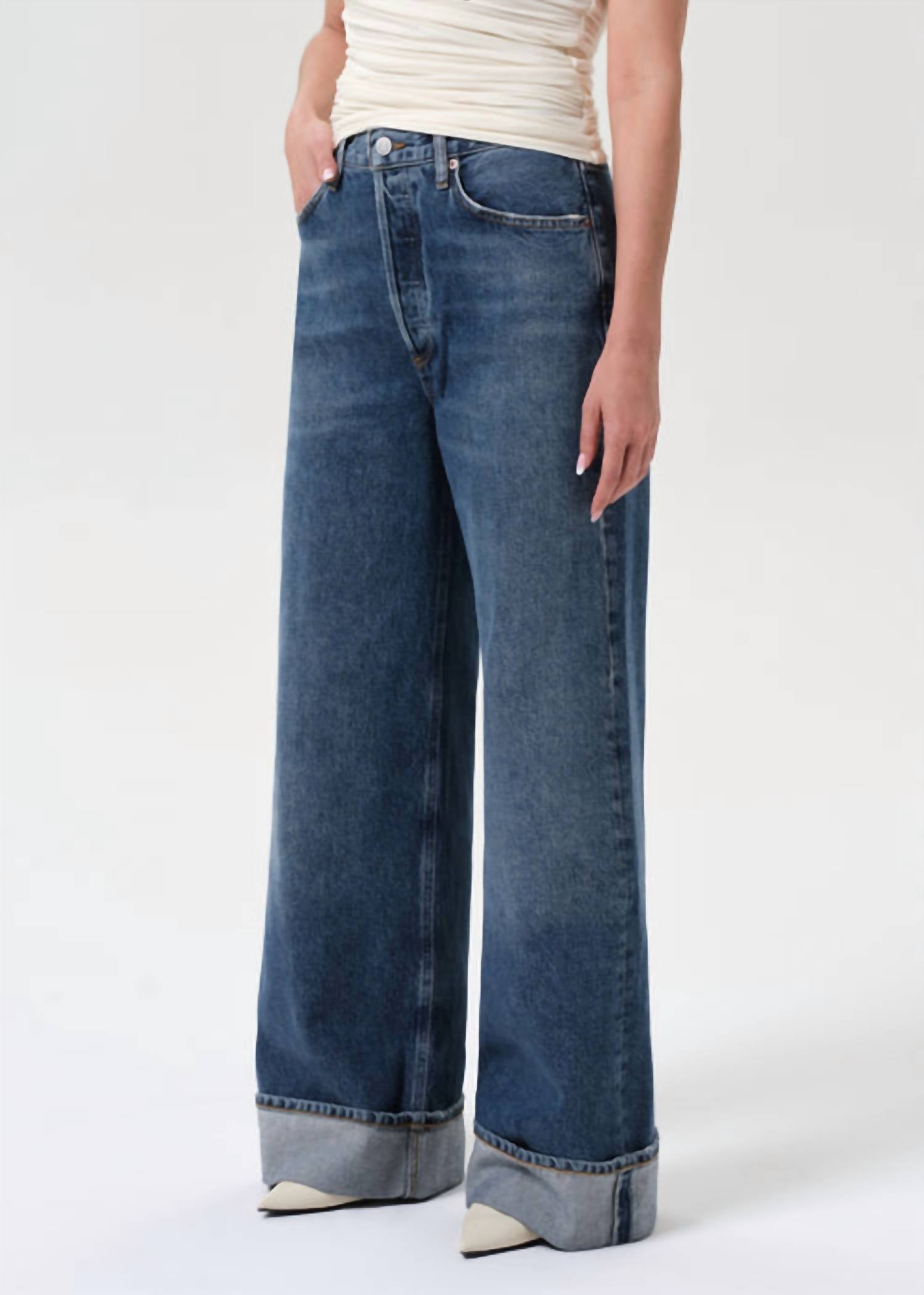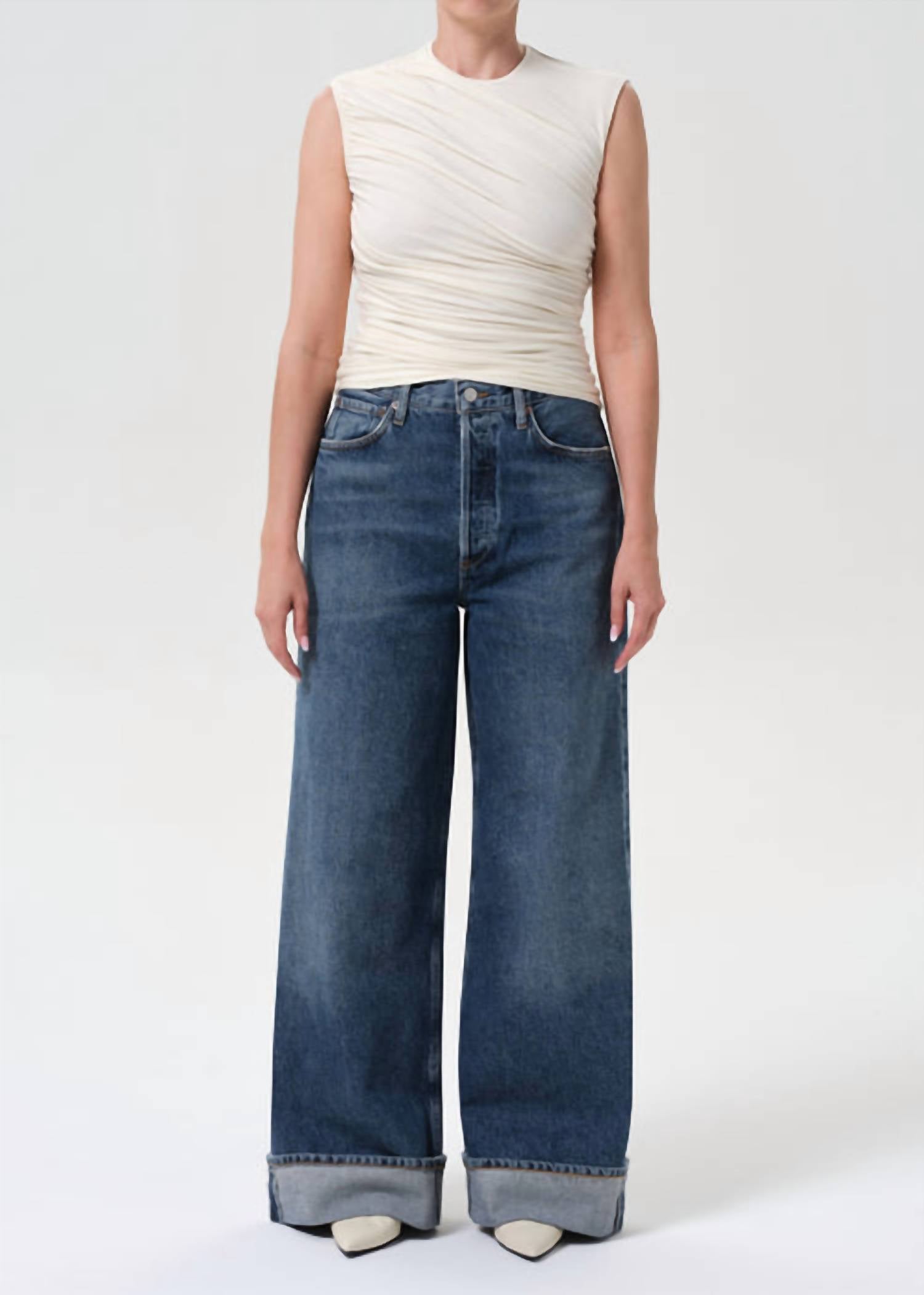 A flattering silhouette that's suprisingly versatile. Discover the AGOLDE Dame High Rise Wide Leg Petite Jeans in Control, a chic addition to any wardrobe with a flattering high-rise design and wide leg silhouette. Crafted from 100% organic cotton, these jeans offer a comfortable regular fit and feature a textured pattern. The button fly closure adds a classic touch, while the inseam measures 29.5" with a 25" leg opening for a fashionable summer look. Made in Turkey, they are easy to care for with machine wash instructions and tumble dry capabilities. Model is 5'10" and is wearing a size 27 with a rise of 12.5".