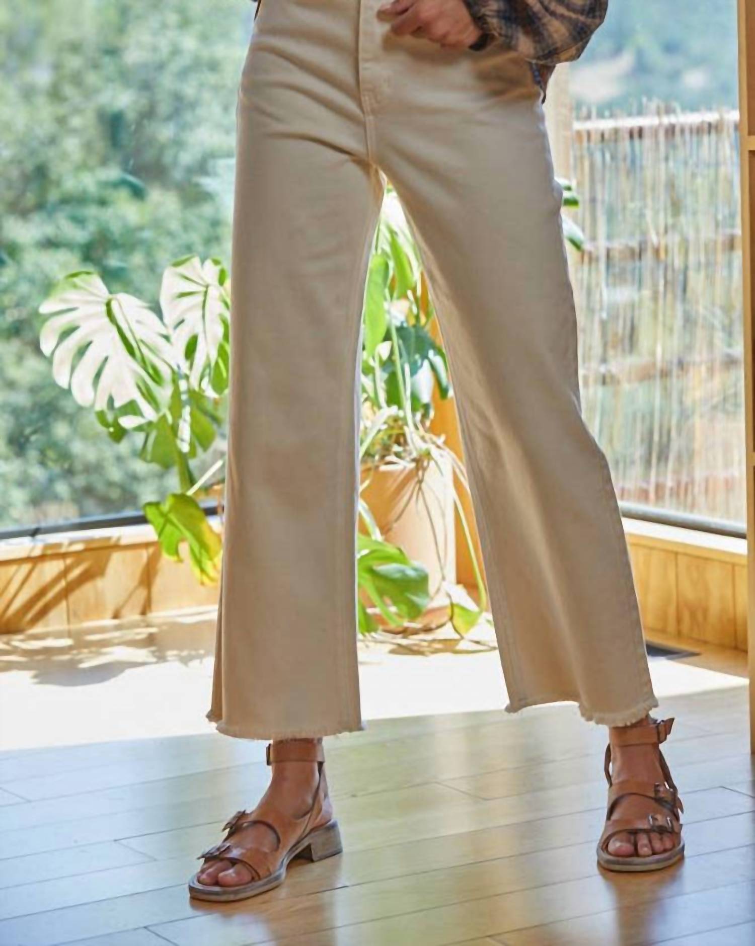 A flattering silhouette that's suprisingly versatile. Introducing the Brayden High Waisted Jeans by By Together, a stylish staple for your wardrobe. These cream-colored, wide-leg jeans are made from a comfortable cotton blend with a composition of 97% Cotton and 3% Spandex. Designed with a high-rise button closure, the jeans feature a relaxed fit and a raw-cut fray hem for a playful 90s fashion vibe. Perfect for travel and spring occasions, these solid-patterned jeans include pockets and are machine washable for easy care.