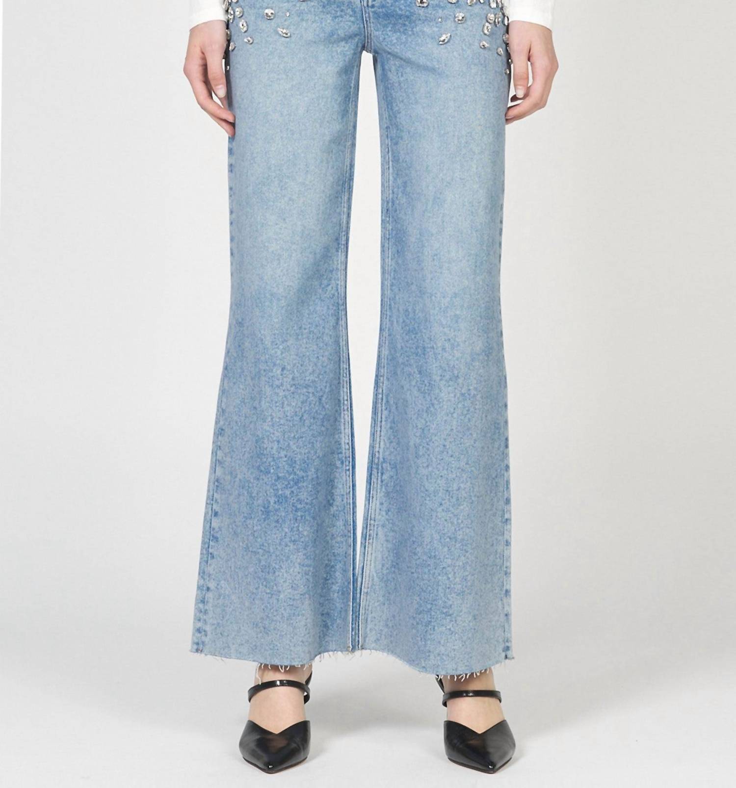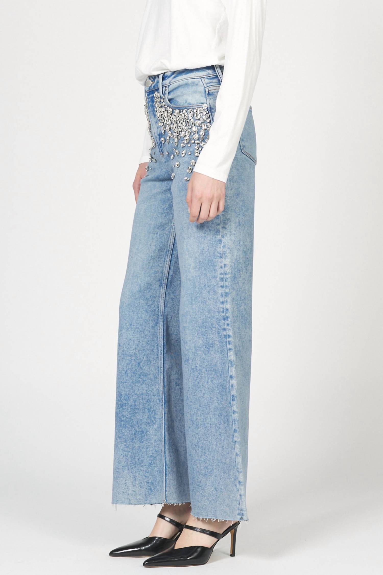 Pair these wide leg jeans with mules, slides or your favorite strappy sandals. Embrace elegance with the Fiona Wide Leg Jeans by DEAR JOHN DENIM, a sparkling addition to any wardrobe. These high rise jeans in a blue sparkle design feature a regular fit with a wide leg, ensuring comfort and style. Crafted from a cotton blend of 94% Cotton, 4% Polyester, and 2% Spandex, they boast dimensions of an 11.5" rise and a 31" inseam for a polished look. Closure: Button closure. Care: Machine wash cold, tumble dry low. Perfect for streetwear fashion and the Thanksgiving holiday party season.