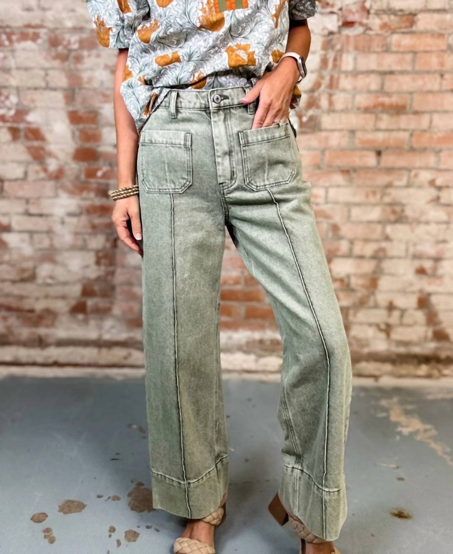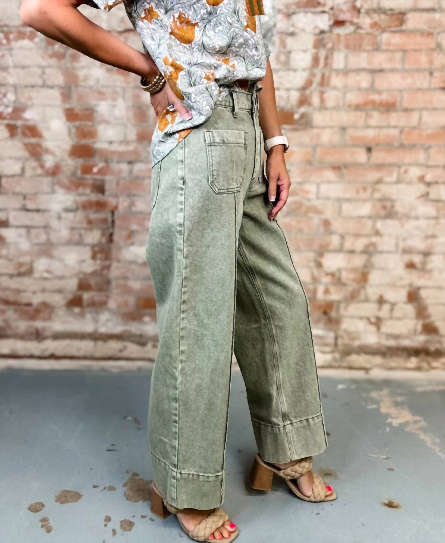 A flattering silhouette that's suprisingly versatile. Introducing the Entro Olive Green Wide Leg Jeans, a stylish essential for the modern woman's wardrobe. These jeans feature a comfortable relaxed fit with a high rise and a 27-inch inseam, ideal for both playful and laid-back days. Crafted from an 80% Cotton and 20% Polyester blend, they offer a vibrant texture in a medium wash, complete with functional pockets and a secure button closure. Care is a breeze with machine wash instructions, making these jeans a practical choice for effortless style this spring and beyond.