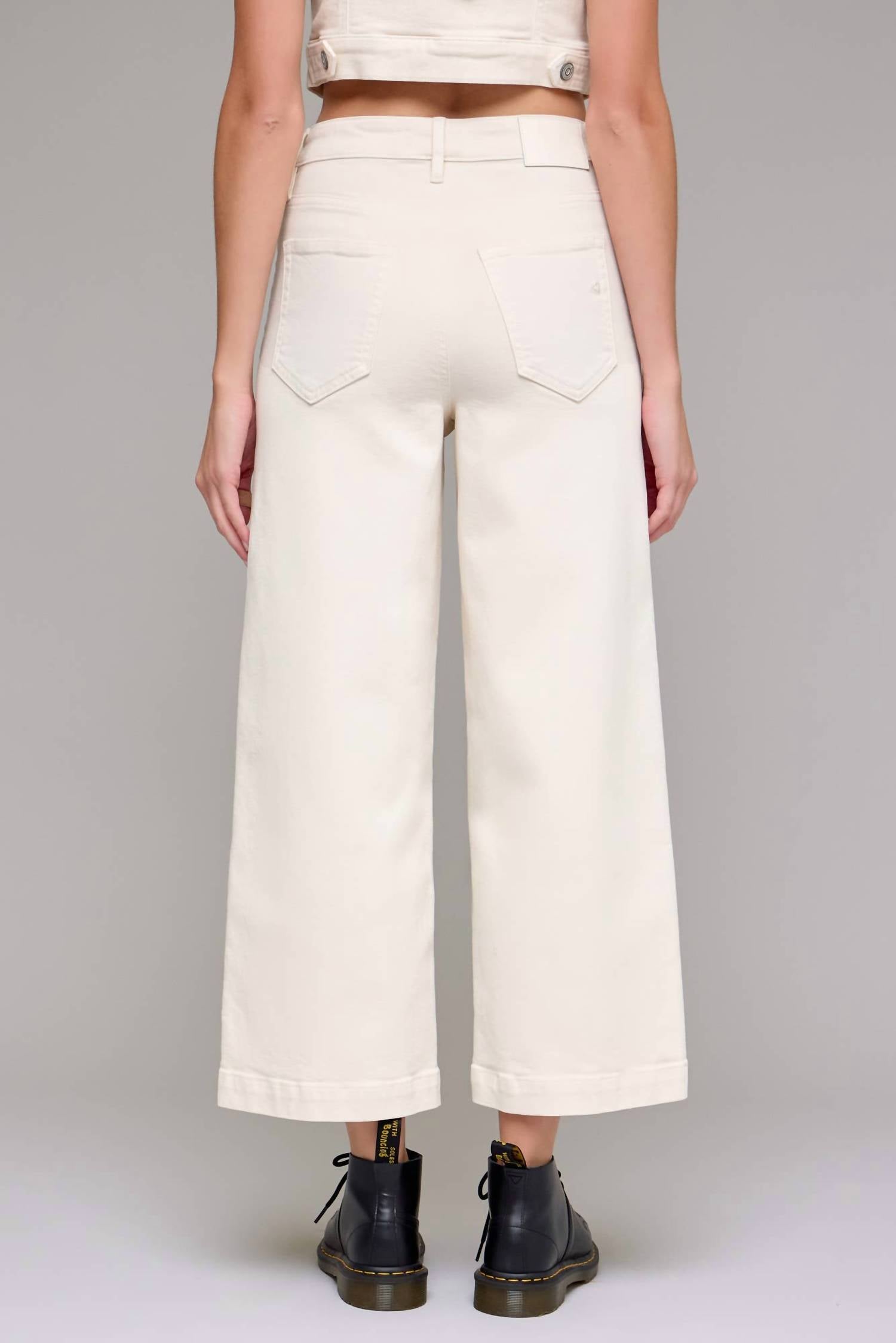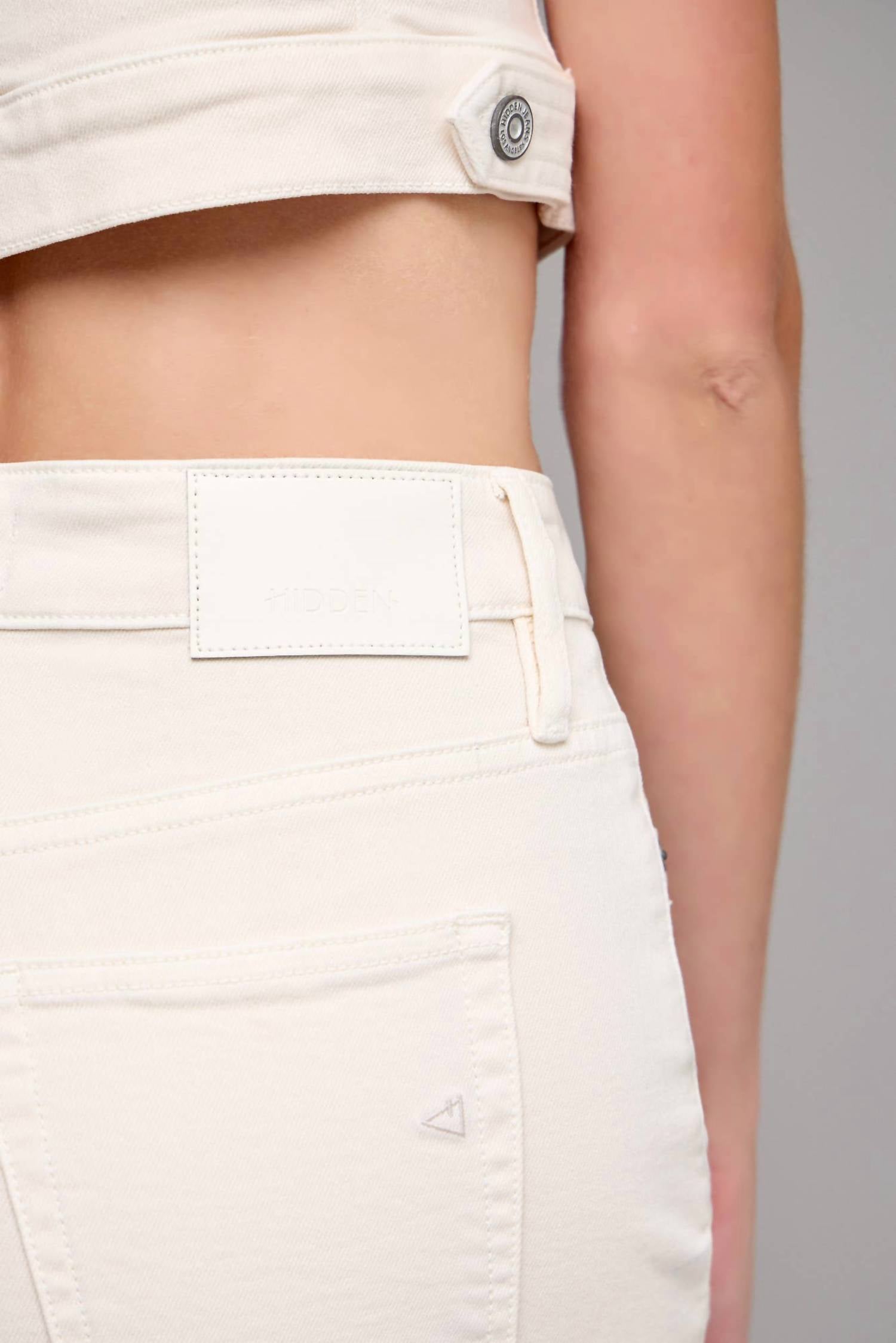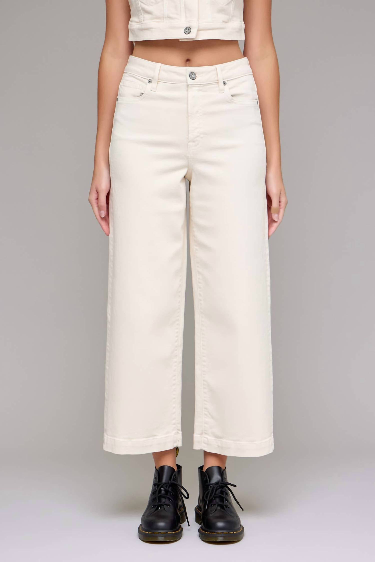 Pair these wide leg jeans with mules, slides or your favorite strappy sandals. Introducing the HIDDEN Cropped Wide Leg Jeans in elegant Off White, perfect for a summer vacation or trendy workwear look. These women's jeans feature a high-rise fit with an 11.5" rise and a 26" inseam, designed to flatter with a button closure and handy pockets. Made from a comfortable cotton blend of 74% Cotton, 25% Recycled Poly, and 1% Spandex, they offer a regular fit with a wide leg style. Care for these solid pattern jeans is effortless with machine wash and tumble dry instructions.