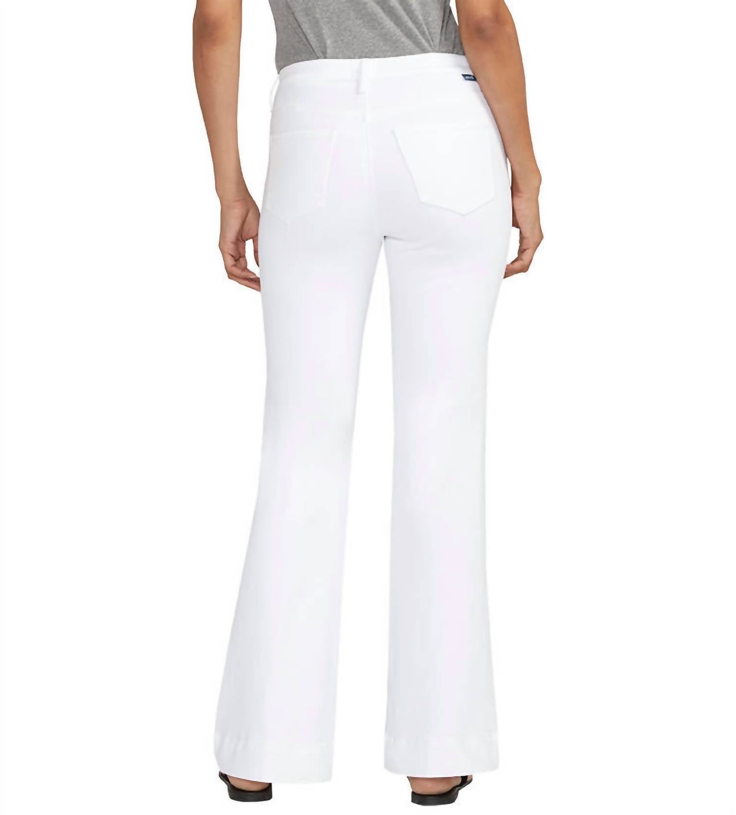 Just as cute as they are comfortable. Meet the Kait Mid Rise Flare Jean by JAG, your new wardrobe staple for versatile styling. Crafted from a cotton blend, these white flare jeans offer a flattering mid-rise fit with a 10" front rise and a zip fly with button closure. Designed with a 30" inseam, they feature a wide leg with a bottom opening of 22 3/8" and a 5-pocket styling for practicality and style. Care for them easily with machine wash instructions. Experience the perfect blend of function and fashion with these minimalist jeans tailored for any occasion.