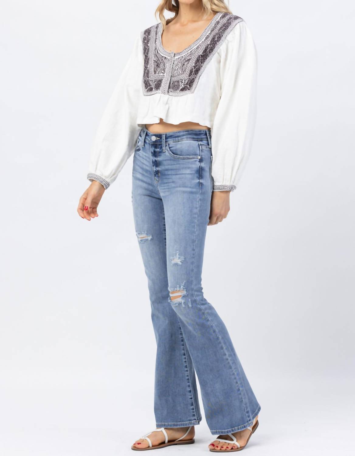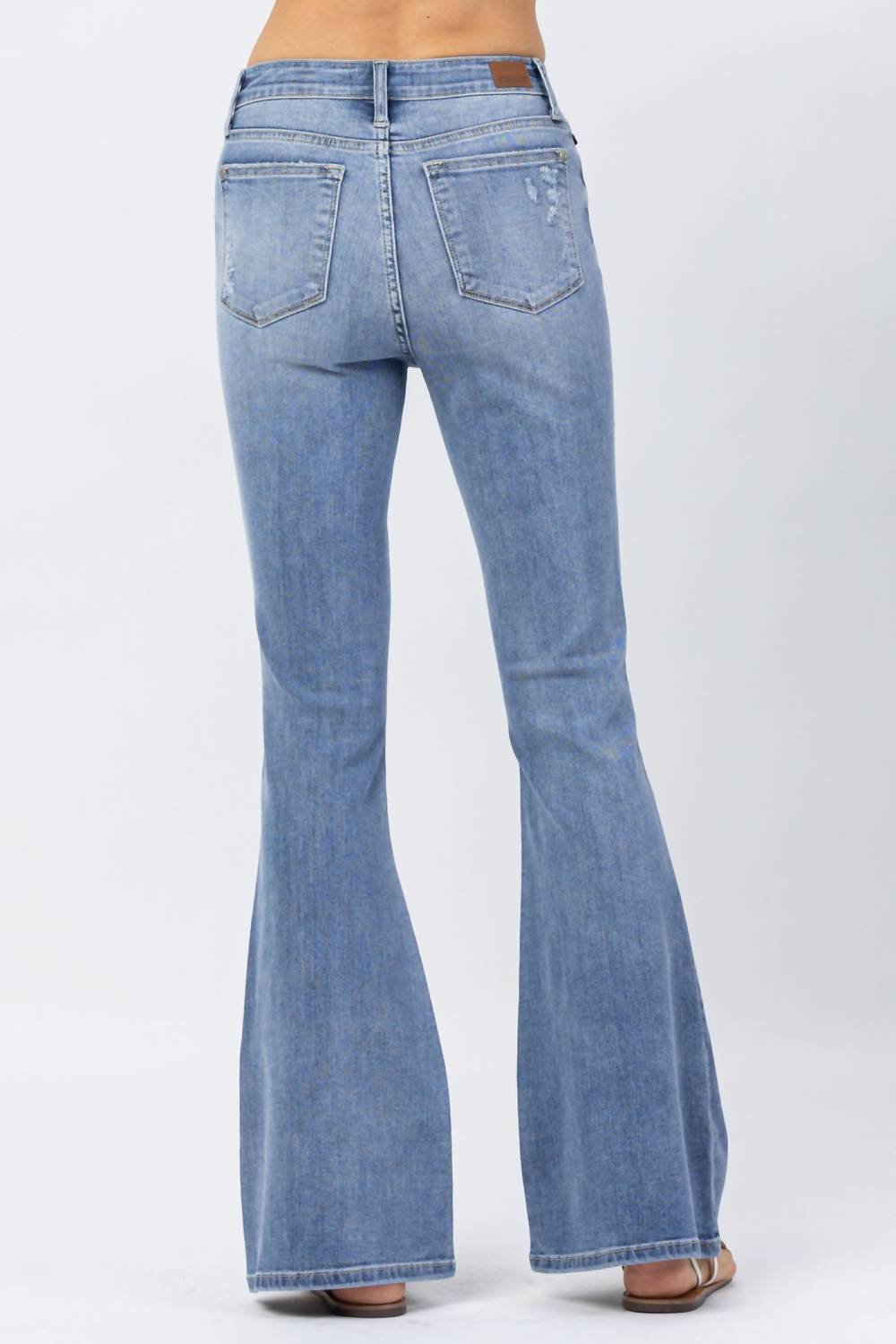 Discover the Hi-rise Destroyed Flare Jeans by Judy Blue, the epitome of comfort and timeless 90s fashion. These blue, high-rise jeans feature a flared leg and classic fit, offering unmatched stretch with a 66% Cotton, 21% Polyester, 11% Rayon, and 2% Spandex blend. The medium wash denim ensures a standout look, complete with a 10.5" front rise and 33" inseam for a flattering fit. Closure: Zip closure. Care: Machine wash, tumble dry.