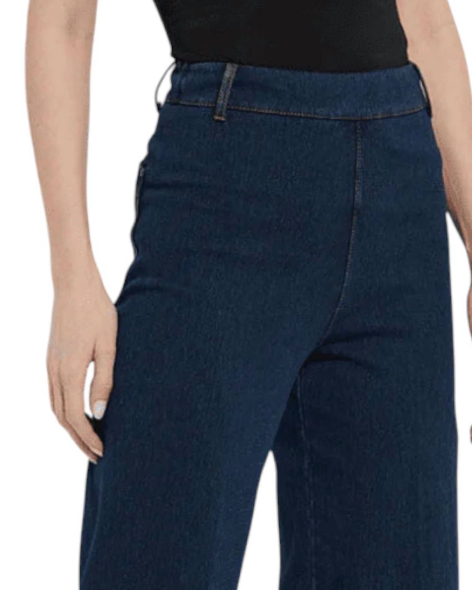 Just as cute as they are comfortable. Elevate your wardrobe with the Erin Wide Knit Denim Jeans by Lysse, crafted from 95% cotton and 5% spandex for ultimate comfort. These high-rise, indigo solid jeans feature a 4-way stretch knit denim, a concealed patented pull-on waistband, and a 28" inseam showcasing a wide-leg, flared style. The jeans are designed with practical back patch pockets adorned with gunmetal studs, belt loops, and a fashion-forward raw-edge hem for a cropped, ankle-length finish. Originating from a place of high-quality craftsmanship, they ensure ease with machine wash and tumble dry care instructions, making them a perfect choice for your summer workwear collection.