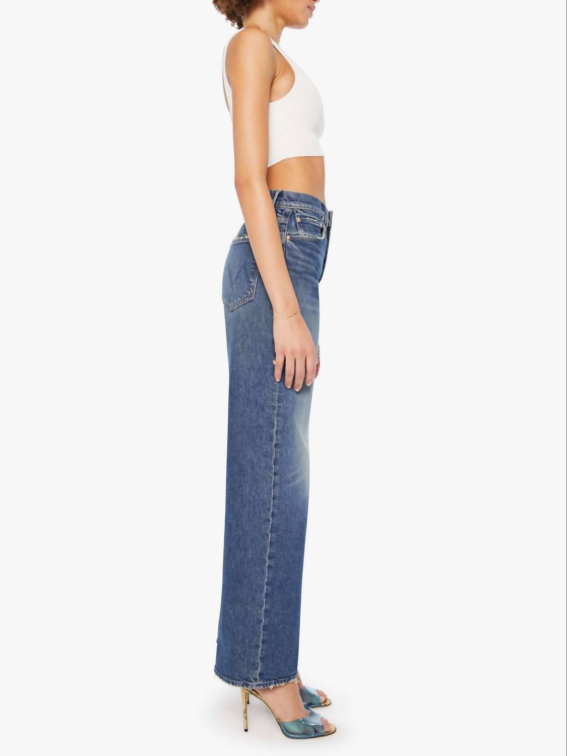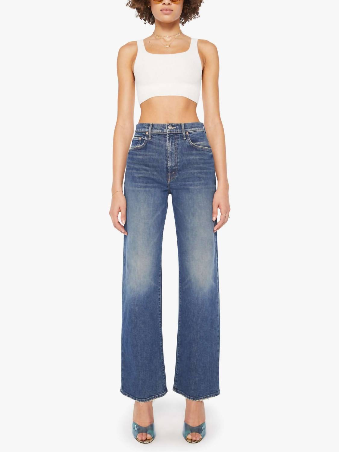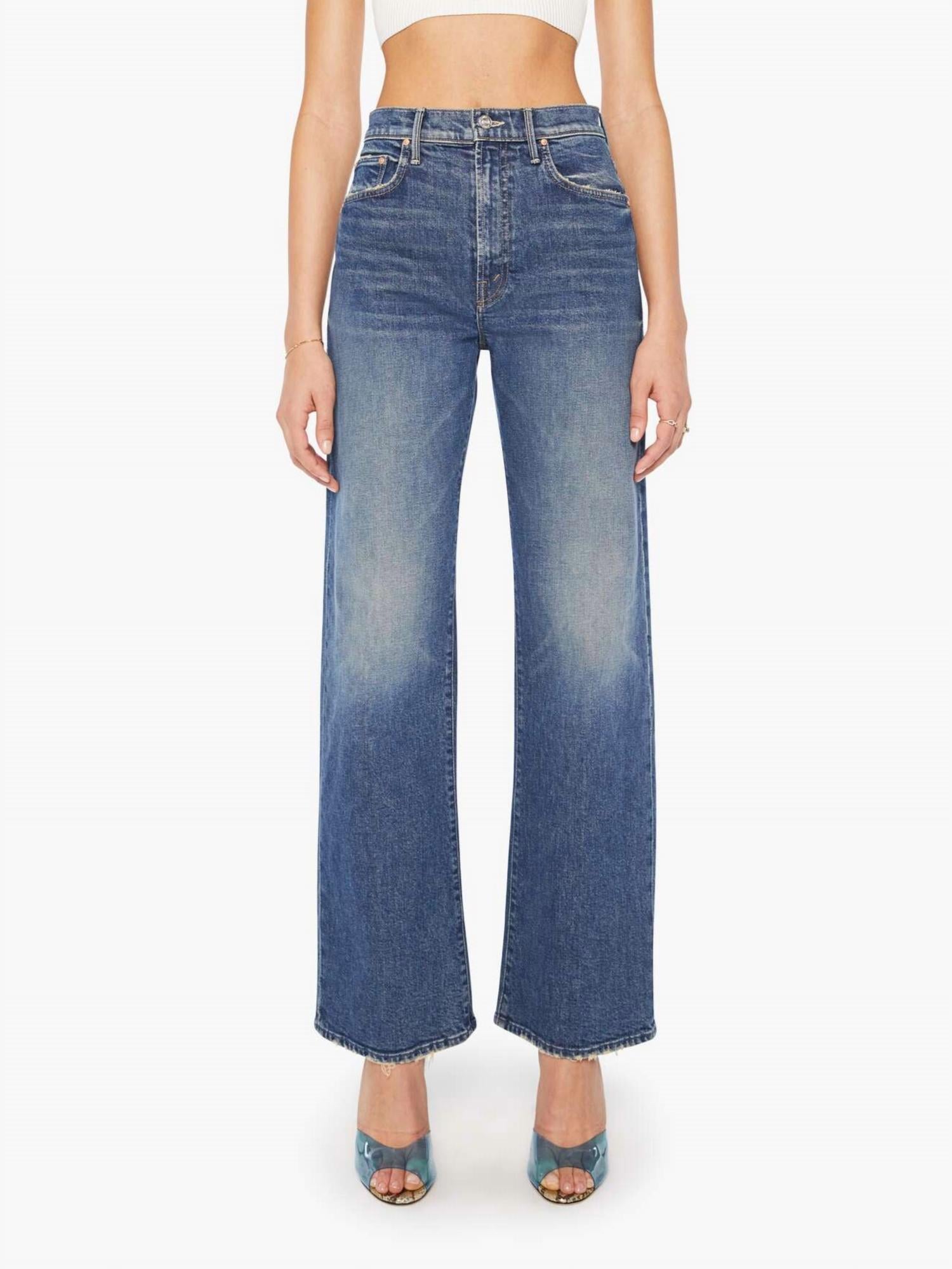 A flattering silhouette that's suprisingly versatile. Introducing The Lasso Sneak Punk by Mother, crafted in a Punk Nouveau water that embodies effortless style. These wide-leg jeans feature a high rise and a 32-inch inseam with a clean hem, delivering a true-to-size fit with a zip fly closure. Made from a comfortable blend of 98% Cotton and 2% Elastane, they offer a semi-rigid feel that gradually molds to your body.