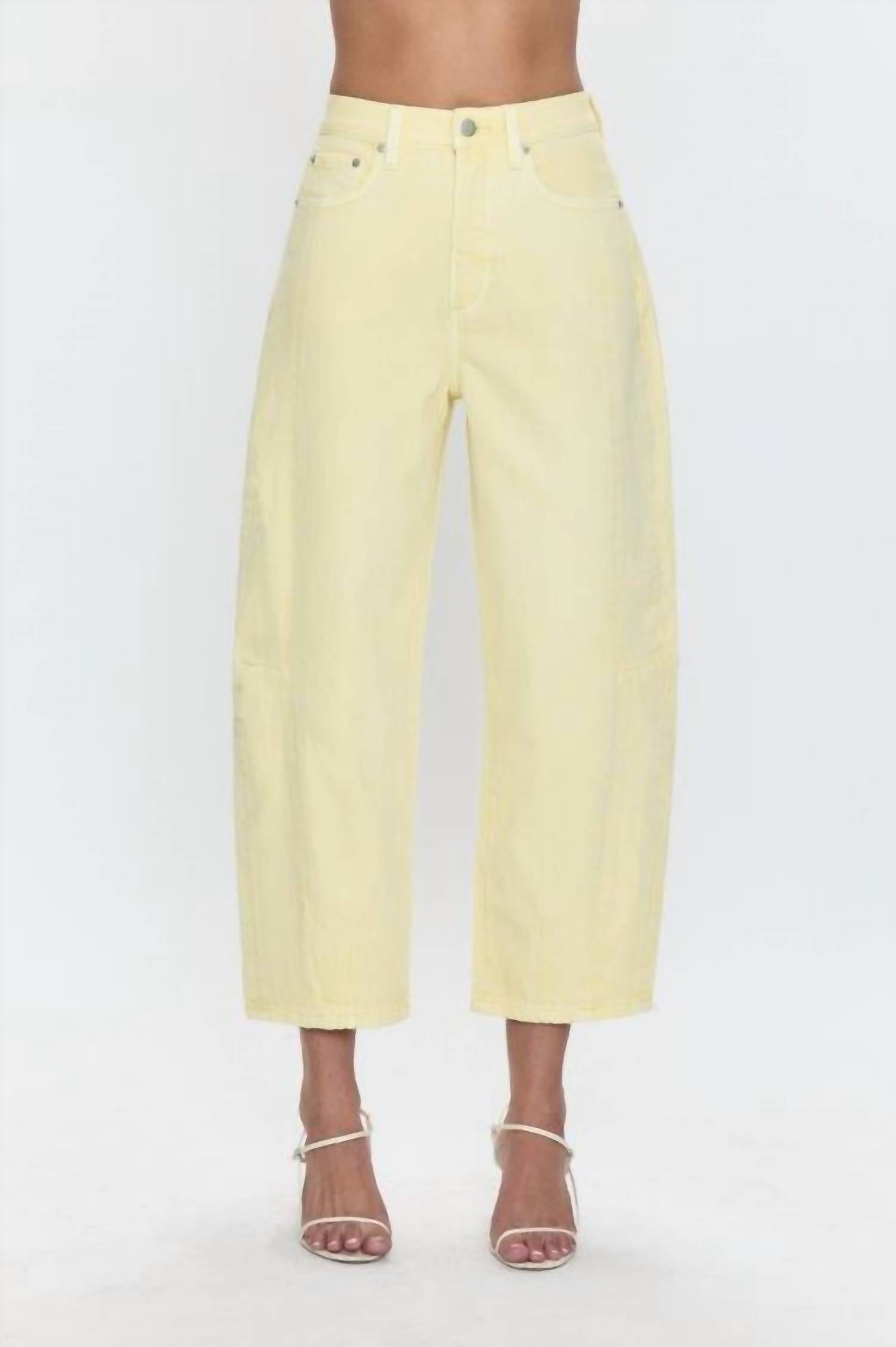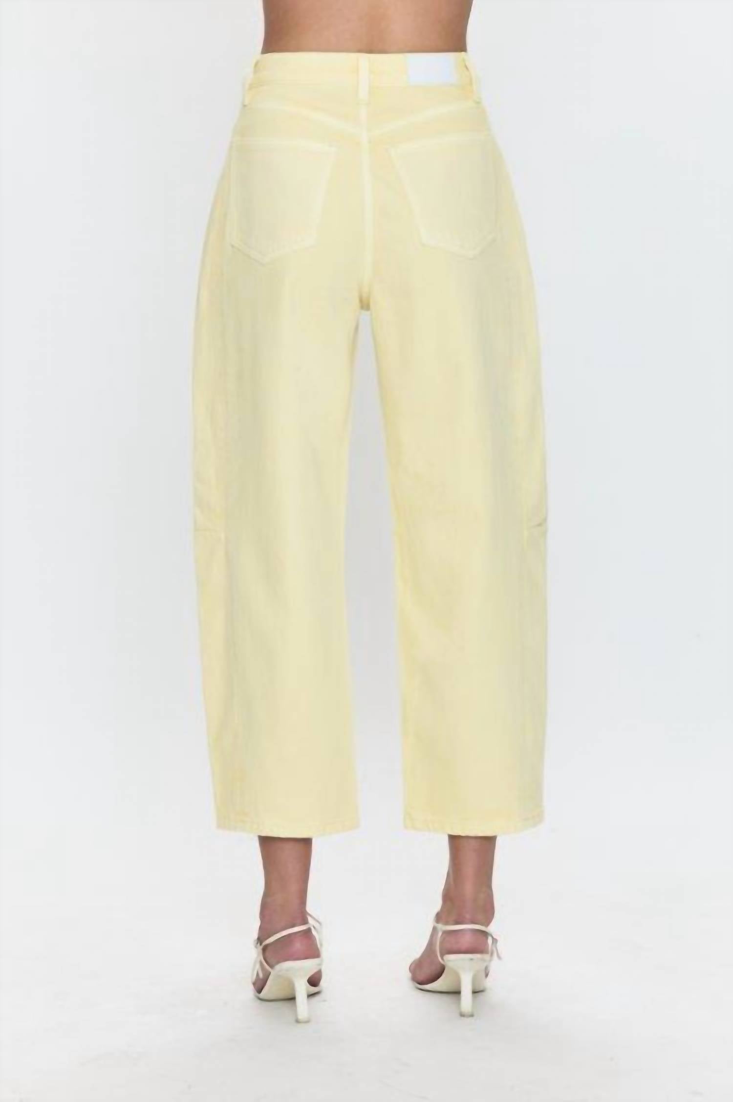 Pair these wide leg jeans with mules, slides or your favorite strappy sandals. The Eli High Rise Barrel Jeans by PISTOLA offer a modern twist on classic denim with a relaxed, wide-leg style perfect for any summer vacation. Made in a soft buttercup hue, these jeans feature a flattering 12.5” rise and 26" inseam, with a leg opening of 16.5” for an effortlessly chic look. Crafted from a comfortable cotton blend of 99% Cotton and 1% Spandex, they are designed for all-day wear. Closure: Button closure. Care: Machine wash. Model is 5'9" wearing size 26.