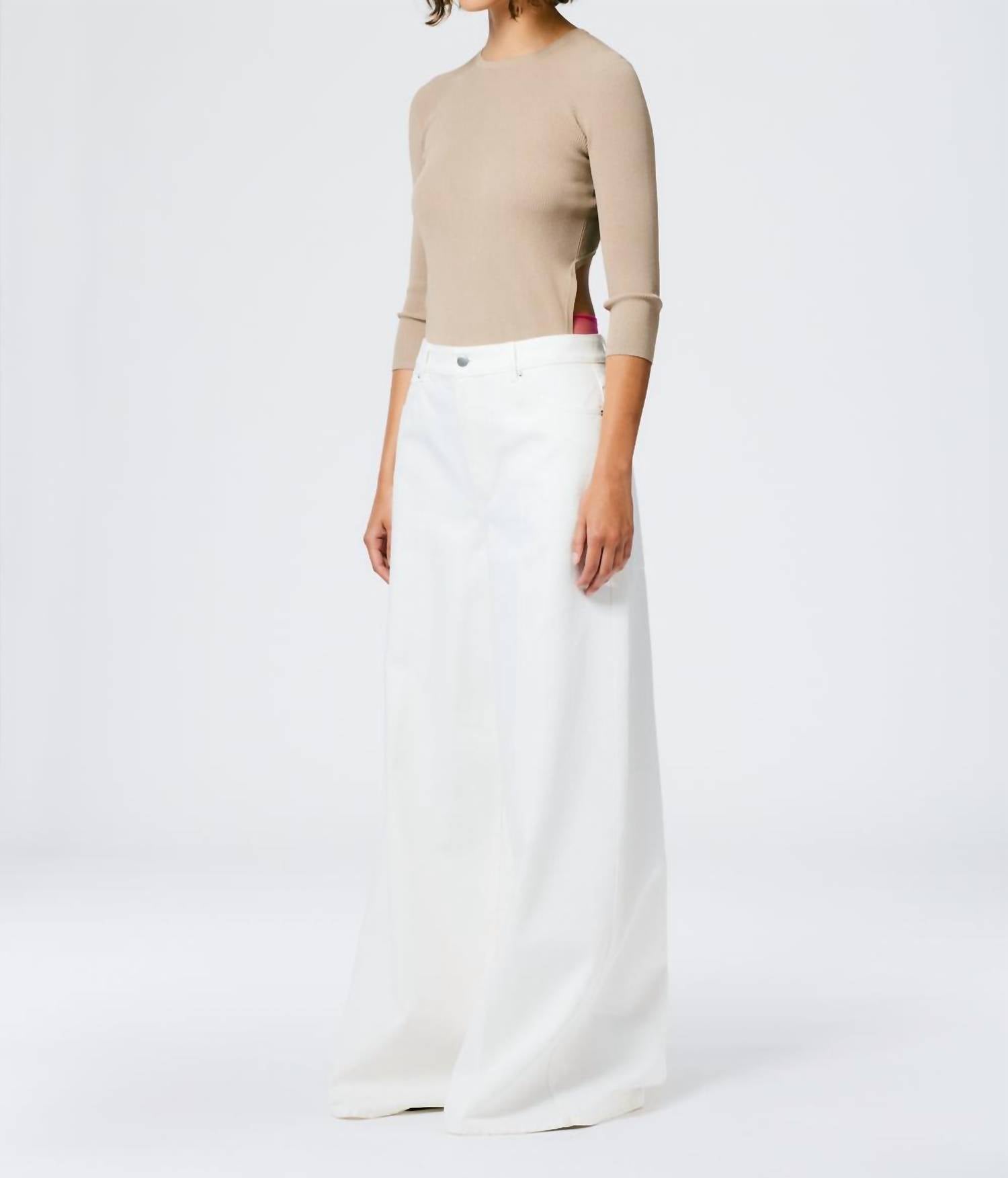 Just as cute as they are comfortable. This wide-leg jean offers a flattering fit for those under 5’5”. Crafted from 100% cotton in a crisp seasonal white, the silhouette features a full-length leg that subtly flares toward the hem, enhanced by an elongating vertical seam that creates a streamlined, lengthened effect. Versatile and statement-ready, these jeans pair effortlessly with bold tops and elevated accessories for a modern, joyful look.