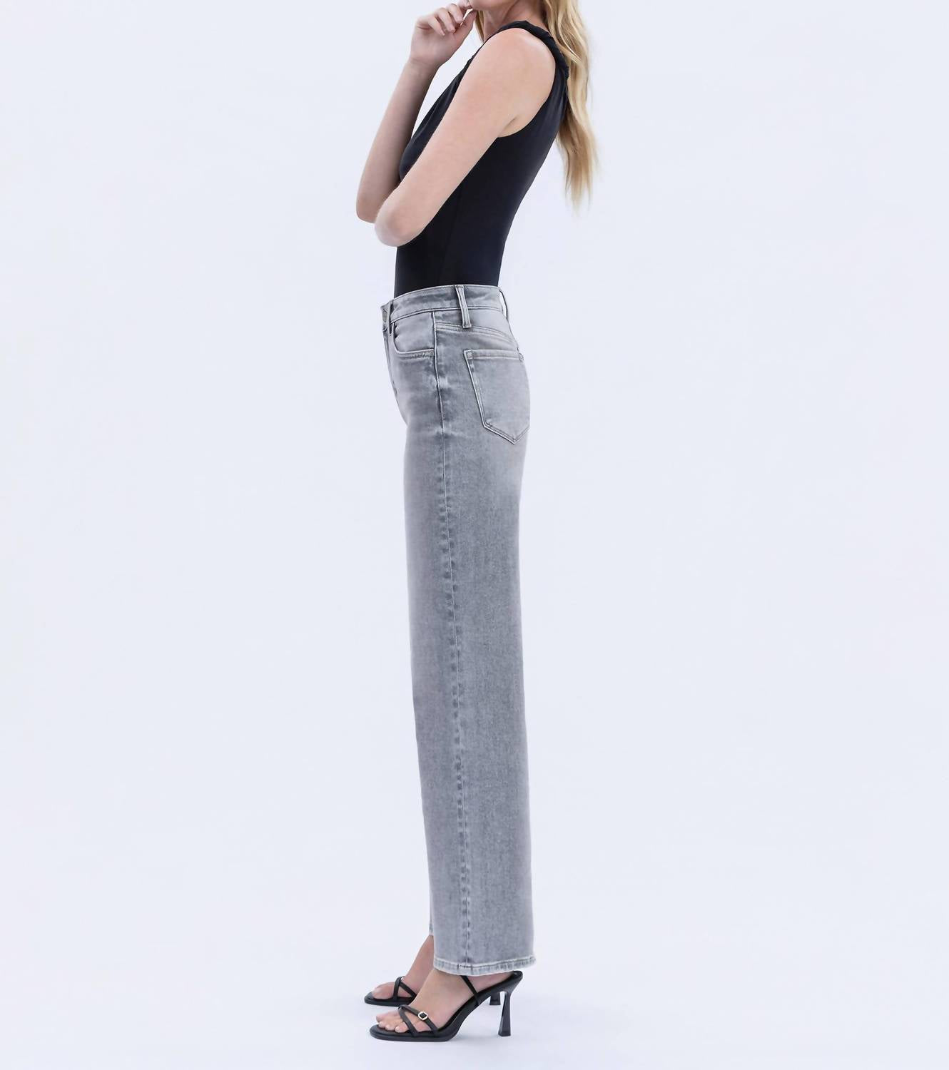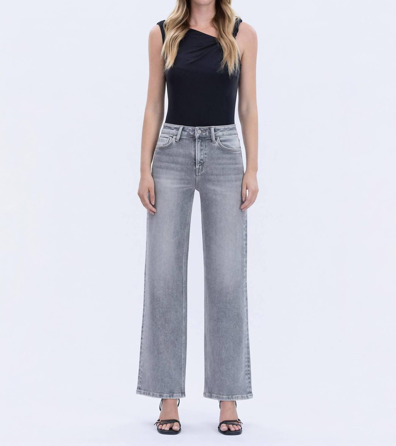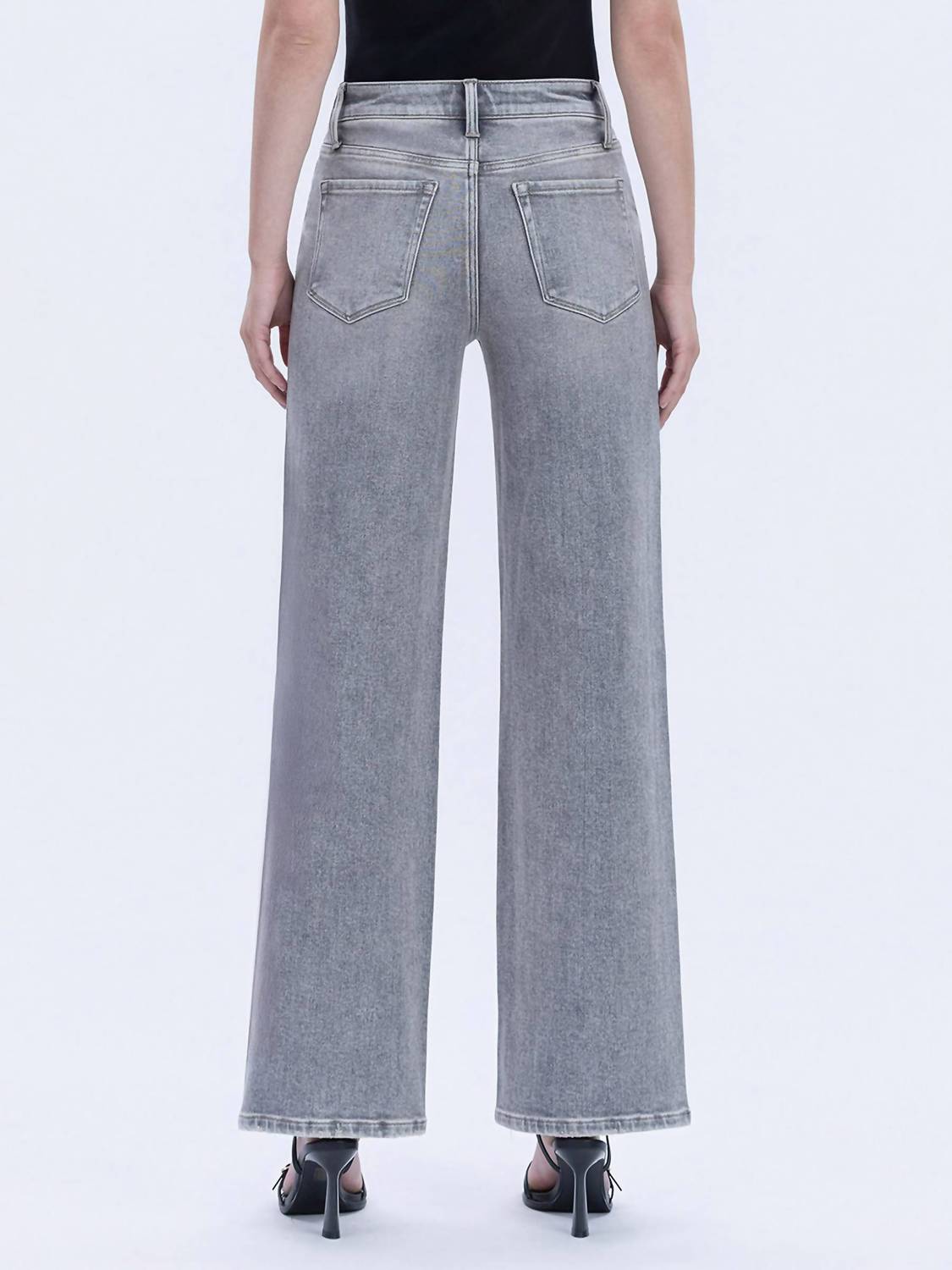Pair these wide leg jeans with mules, slides or your favorite strappy sandals. Introducing the Olivia Wide Leg Jeans by Vervet by Flying Monkey, perfect for creating a relaxed streetwear look. These full-length jeans feature a high-rise waist with a 10.5" front rise and a generous 20" leg opening for a flattering wide-leg silhouette. Crafted from comfort stretch denim in a solid grey, they offer both style and ease of movement. Closure: Button closure. Designed for women who appreciate versatile and stylish dressing, these jeans are ideal for travel and fall occasions like Thanksgiving. Model is 5'10" wearing a size 26 with a 32" inseam.