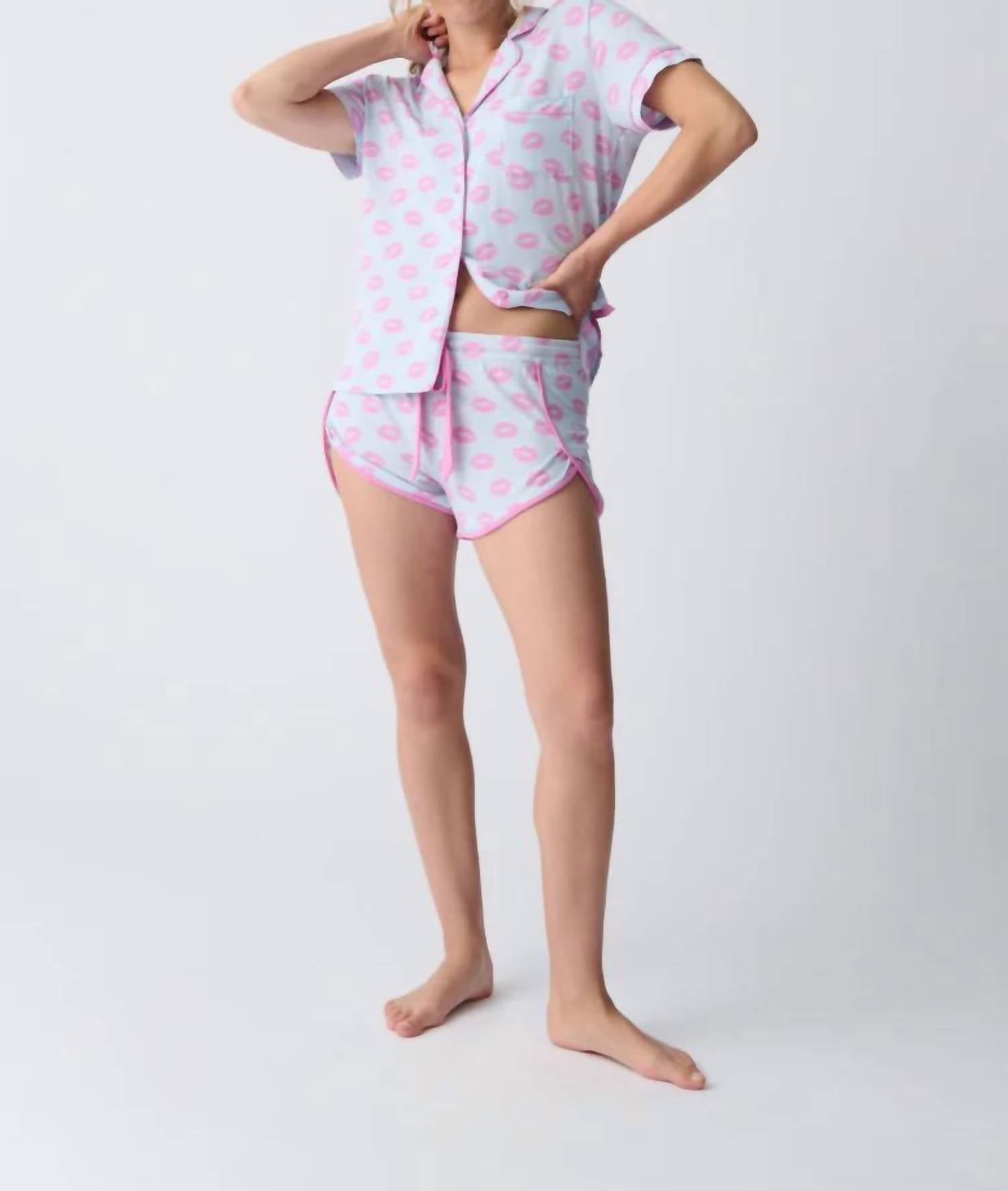 Works well with naps, zoom calls and binging your favorite series. Drift into serenity with the Lovely Dreams Pajama Set by PJ Salvage, a charming three-piece ensemble in Light Blue designed for ultimate relaxation. This imported set includes a collared short sleeve top, matching shorts, and a stylish head wrap, each adorned with a playful pink kiss pattern that adds a whimsical touch. Crafted from a soft jersey blend of 95% Modal and 5% Elastane, it promises comfort all night long. Care is simple: machine wash cold and tumble dry low, ensuring your pajama set stays in perfect condition.