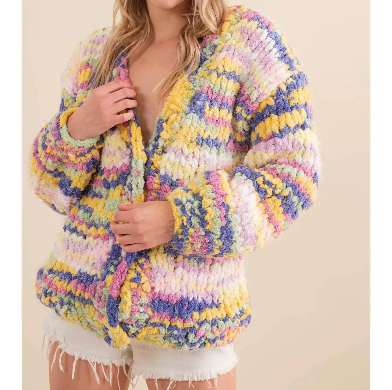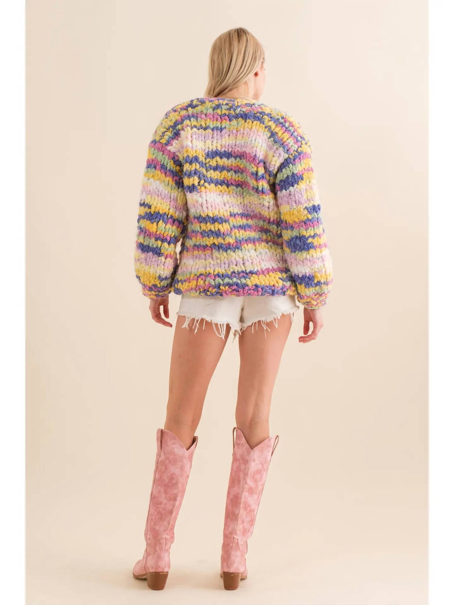 This cardigan will be a sweater-rotation favorite. Stay warm in style with the Mixed Yarn Cardigan by Blue B. This multicolored, striped cardigan is crafted from a cozy knit material, perfect for chilly days. Featuring long sleeves and a V-neck, the cardigan offers a chic and comfortable fit. Please note that this cardigan has no pockets or specific closure type. Model is wearing a size small.