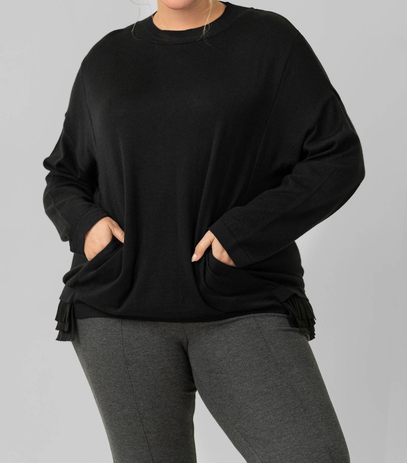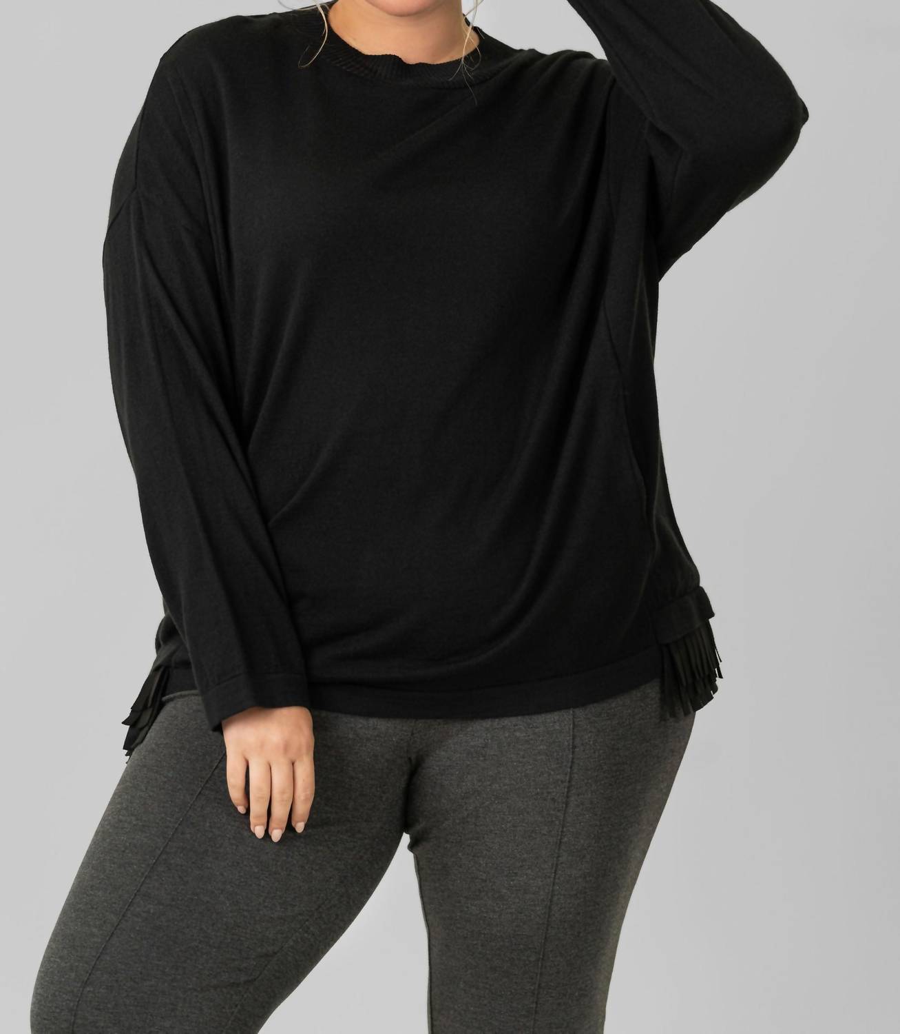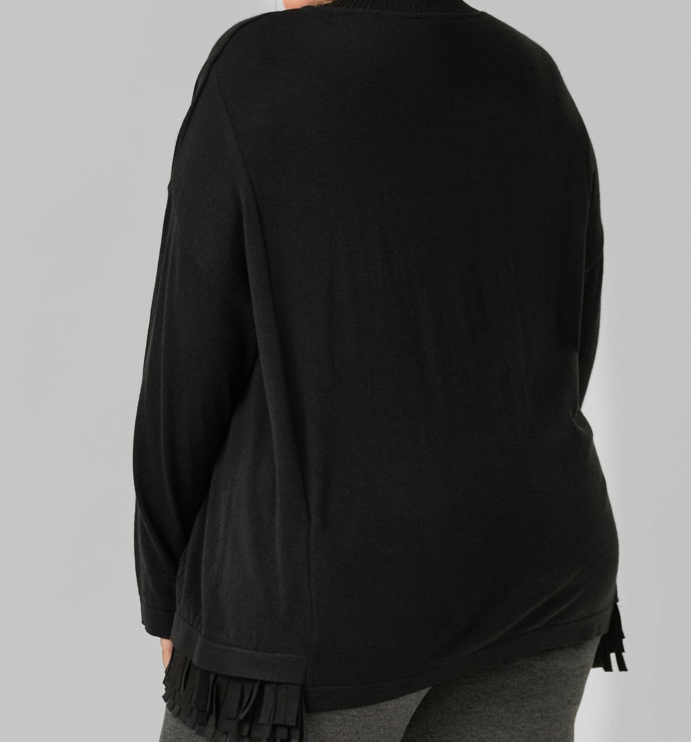 Stay warm and stylish in this versatile and effortlessly cool knitwear staple. Wear it alone or layered, it's the perfect sweater for the season and you'll wish you had it in every color. Crafted from luxurious wool, this solid black sweater features long sleeves, a crewneck, and a pull-on closure for effortless wear. The inclusion of pockets enhances its practicality, while a slight sparkle in the collar and fringe detailing add to its charm. For care, simply machine wash and line dry to maintain its pristine condition.