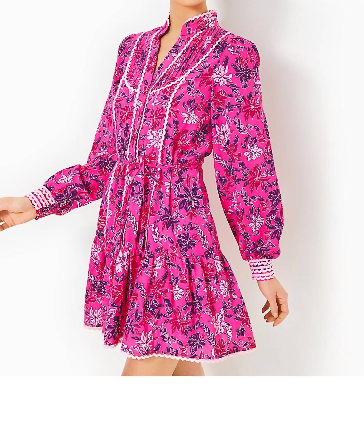 The kind of easy and flattering dress you'll be reaching for all season long. Introducing the Arletta Dress by Lilly Pulitzer in a vibrant Passion Fruit Pink Giraffic Park print, perfect for adding a pop of color to your wardrobe. This long-sleeve shirtdress, made from 100% lightweight cotton poplin, features a 35 1/2" mini length and exquisite details like a stand collar, button closure, and Lilly lace trim. The design also includes a hem ruffle, front bib with pintucks, and a removable self belt for a customizable fit. Care is easy with machine wash on a cold, delicate cycle, or choose dry cleaning for convenience. Imported.