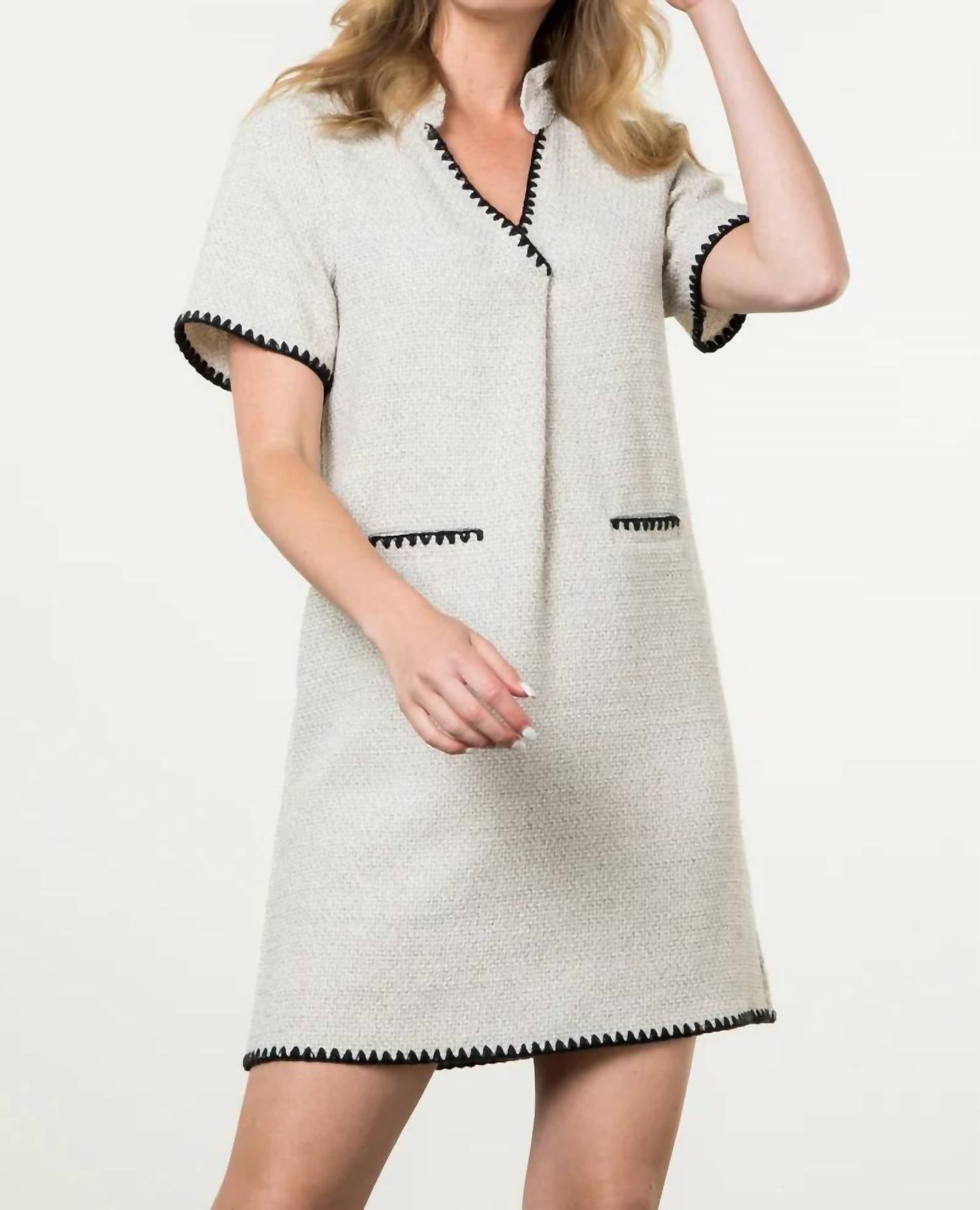 The perfect mini dress for those warmer months. The THML Short Sleeve Dress in cream offers a chic blend of elegance and modernity, ideal for the discerning fashion aficionado. Crafted with a textured finish, this shift dress features a collared V-neck and black edging details for a refined look, complete with faux pockets at the front for added style. Composition: 93% Polyester, 5% Cotton, 2% Spandex. Originating from China, this dress is a mini-length creation with a pull-on closure. Care: Hand wash.