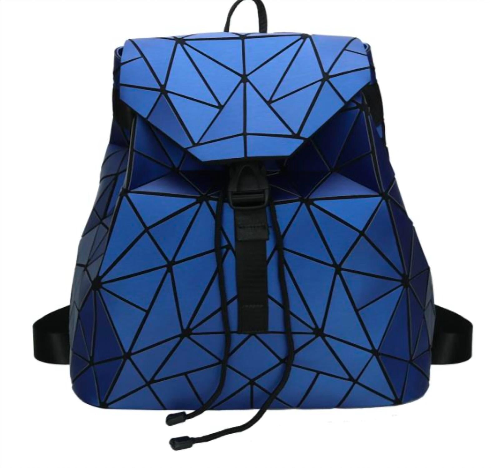 A backpack so versatile, you'll want to carry this with you everywhere. Introducing the Women's Slanted Triangle Backpack by Exclusive Thredz, perfect for those seeking functionality combined with style. Crafted in a sleek Matt Blue with a geometric design, this backpack features a top carry handle, dual adjustable backpack straps, and a handy drawcord detail. It measures 17.5" wide and 11" high, providing ample space with two interior slip pockets and one interior zip pocket for easy organization. Closure: Buckle closure.