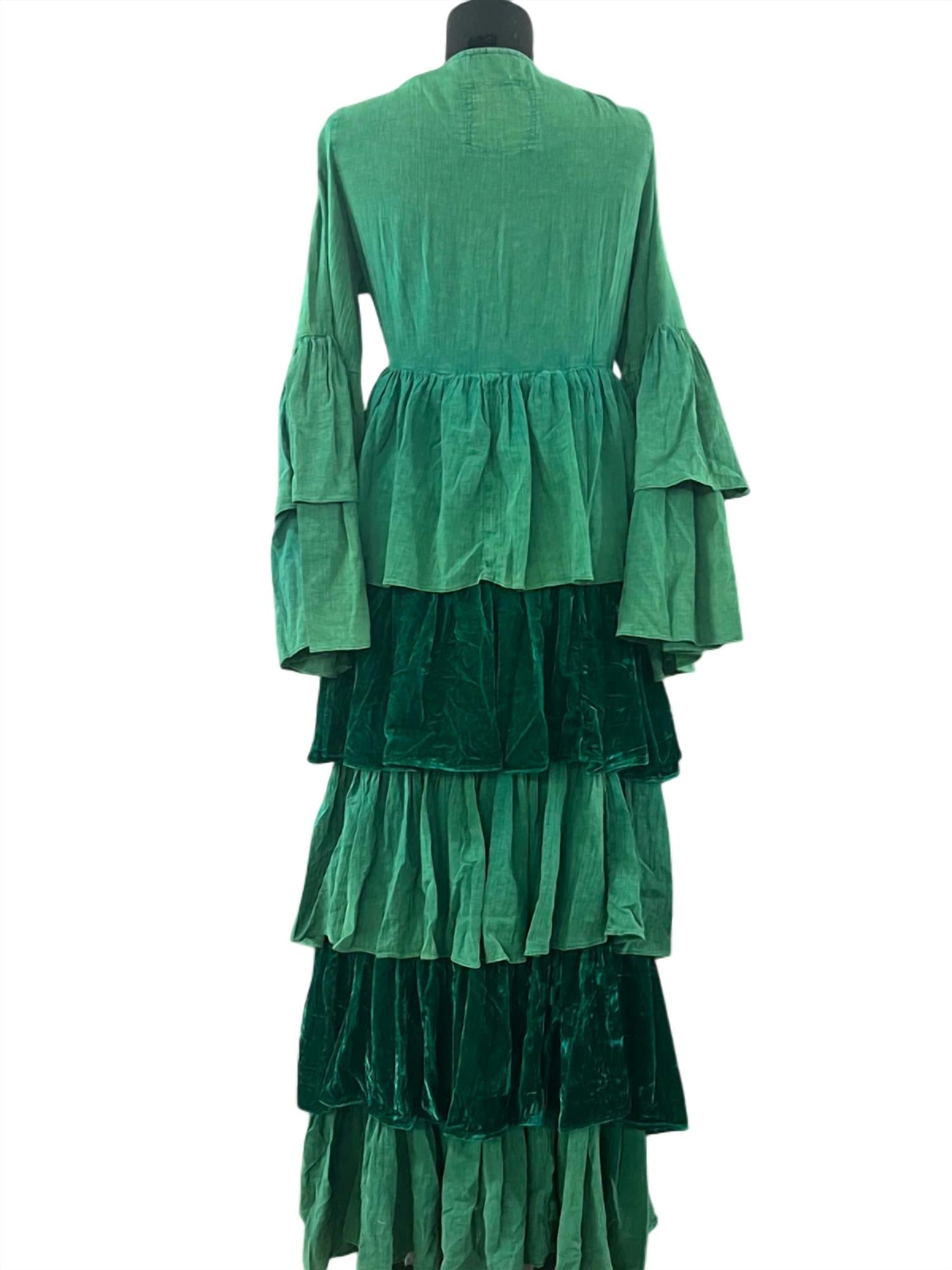 Style this maxi with your favorite statement necklace and sandals for the perfect look. Introducing the Floor Length Green Ruffled Duster by A Rare Bird, a standout piece designed to make a bold statement. This long-sleeve duster features a chic fit and flare silhouette with a scoop neckline, adorned with sophisticated ruffles that enhance its elegant appeal. Crafted in a captivating green hue, each piece varies slightly due to the dyeing process, ensuring uniqueness. Closure: Tie closure.