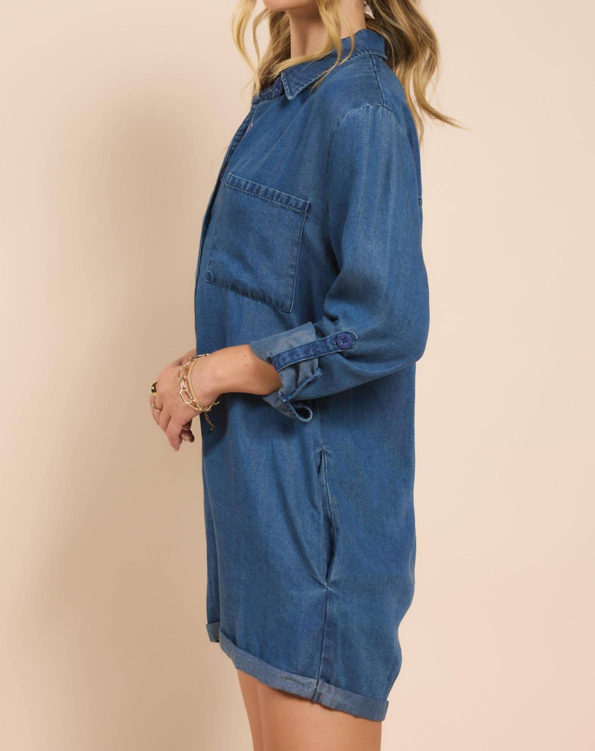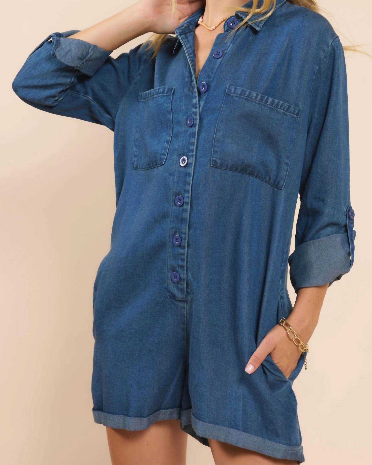 Throw it on and go! Introducing the Sadie & Sage "It's Pouring" Romper, a chic piece in Dark Chambray that's perfect for adding flair to your wardrobe. This romper showcases a buttoned long sleeve design, keeping you stylish and cozy on cooler days. Crafted from 100% Lyocell, it features functional pockets and a convenient button closure. Care for this piece by hand washing and line drying to maintain its quality.