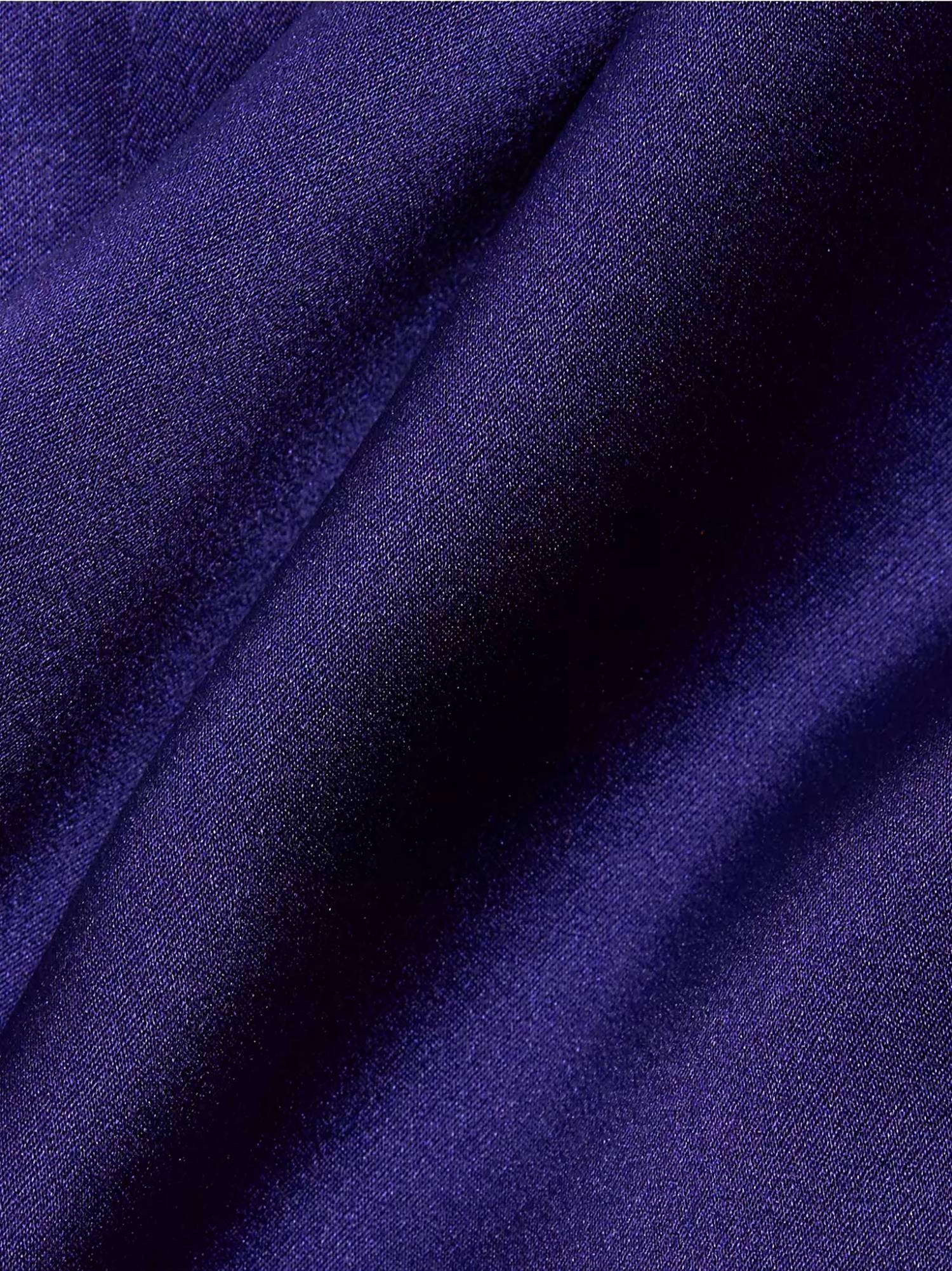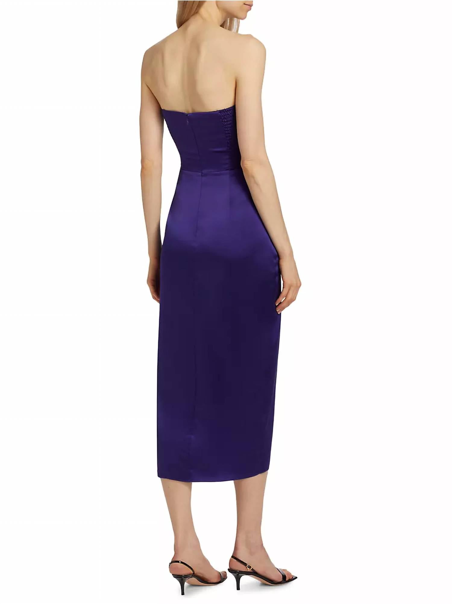 This Strapless Midi Dress features a refined sheath silhouette with an off-the-shoulder design. Made of 100% silk with a 51” length and back zipper. Dry clean only.