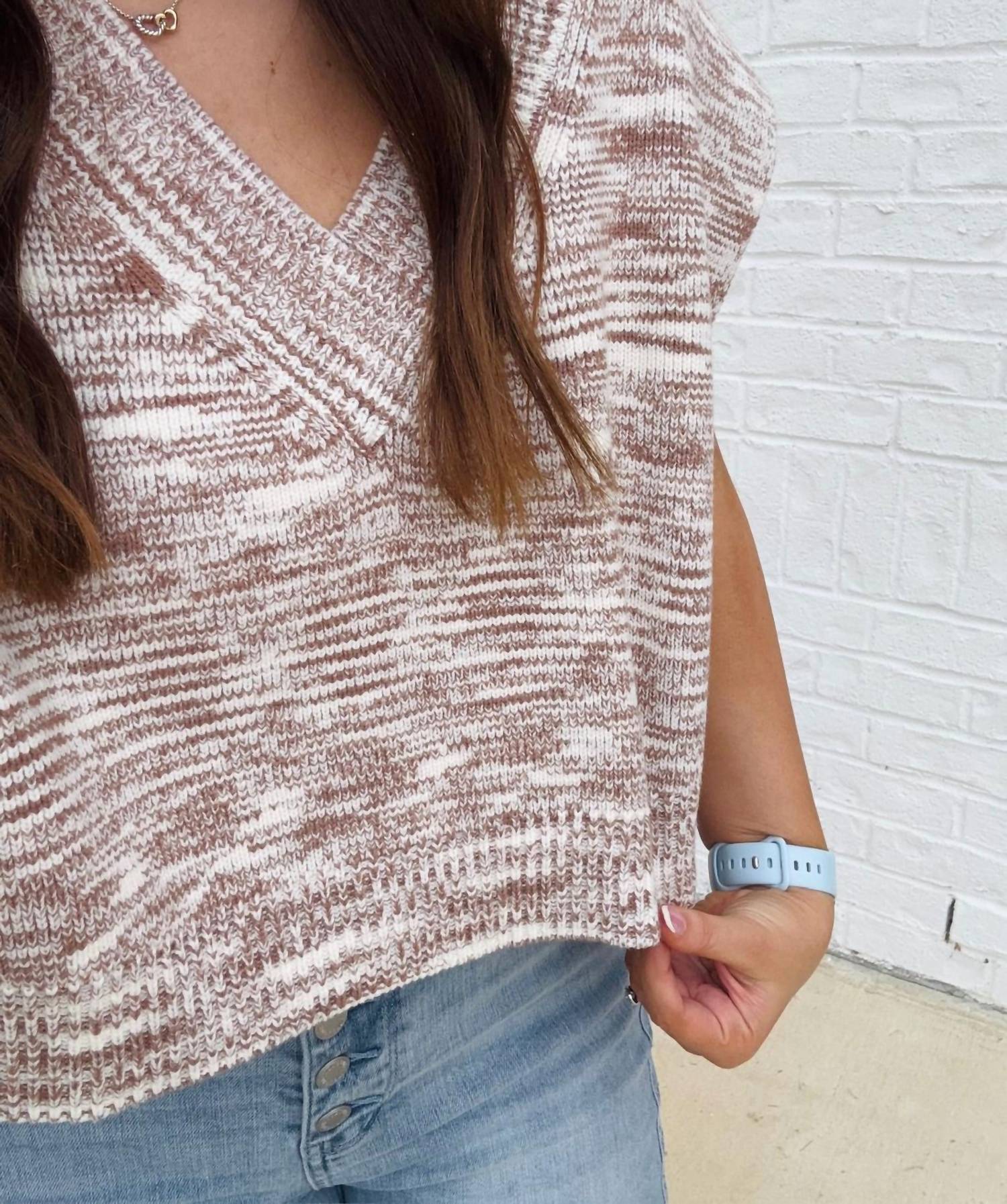 A vest so versatile you can mix and match it with almost any outfit and it will feel brand new every time. Introducing the Boxy Sweater Vest by Day + Moon, a chic addition to your wardrobe with its ivory and mocha marled pattern. This women's vest features a trendy V-neckline and cap sleeves, offering a modern twist on a classic piece. With its pull-on closure, this piece ensures effortless wear and cozy comfort throughout the day. Perfectly pair it with high-waisted pants or a skirt for a fashionable and playful look.