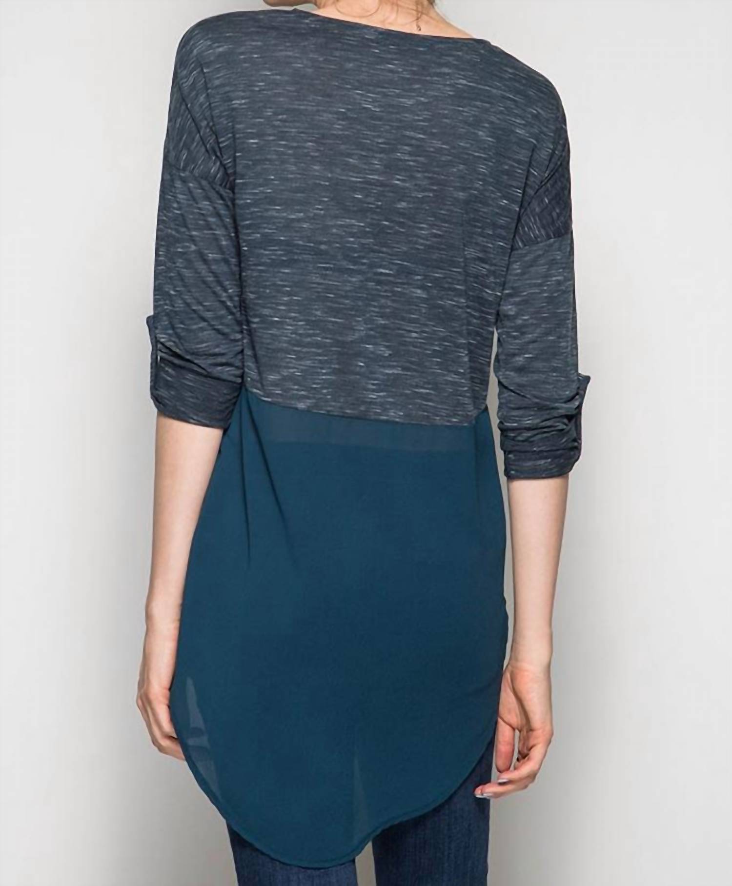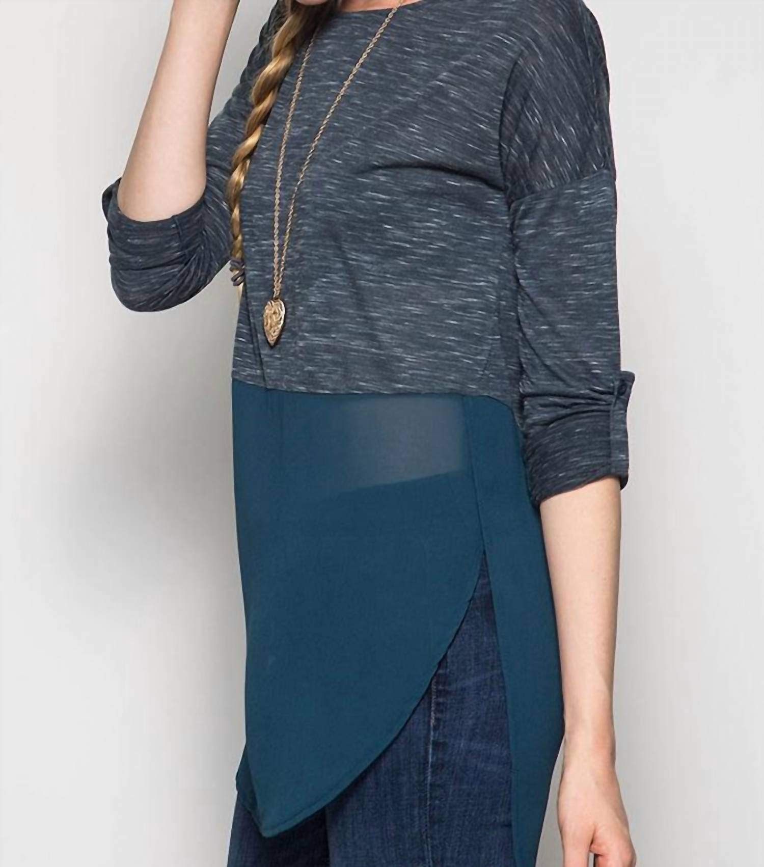 A perfect addition to any wardrobe, this classic tunic style blouse is flattering and effortless. You can easily transition from desk to dinner in this chic top. Elevate your wardrobe with the Chiffon Contrast Tunic by SHE + SKY, an elegant piece in a striking teal blue. Featuring three-quarter roll-up sleeves and a chic crewneck, this tunic blends a textured heathered fabric with a tonal chiffon panel at the curved hi-low hem for a refined look. Designed for women, it offers a seamless pull-on closure for easy wear. This stylish tunic is perfect for adding a touch of sophistication to your everyday outfit.