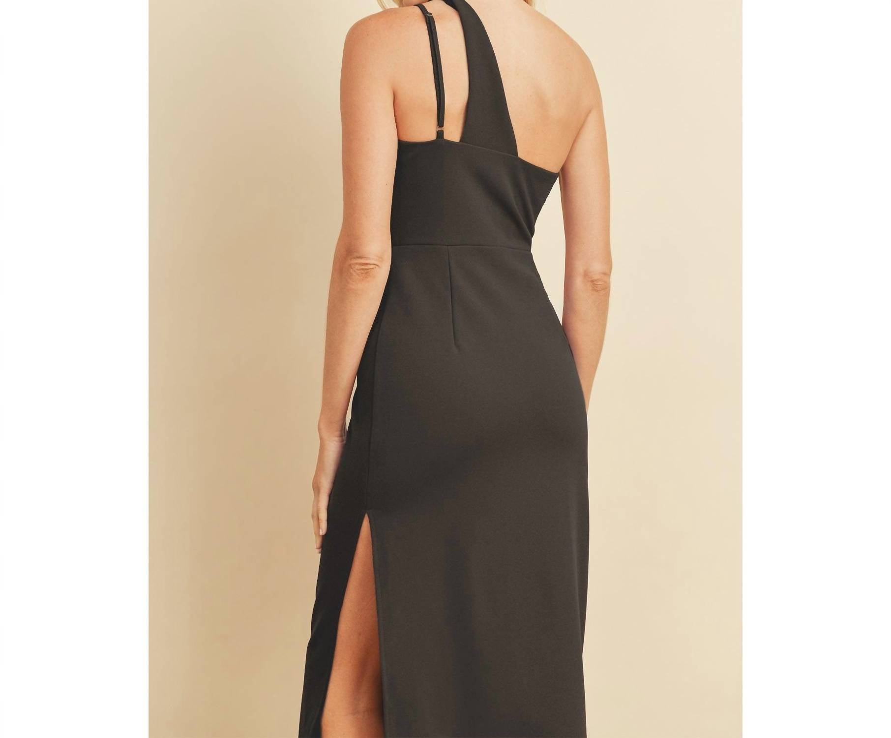 Perfectly tailored and fit to perfection. Introducing the One Way Or Another Midi Dress by DRESS FORUM, a chic addition to any wardrobe. This sleeveless, off-the-shoulder silhouette is crafted from a stretch knit blend of 95% Polyester and 5% Spandex, promising both comfort and a flattering fit. The side zipper closure ensures ease of wear, while the unique one shoulder design with two different straps adds a stylish edge. Available in classic black, this dress also features a left side slit for a touch of femininity and allure.