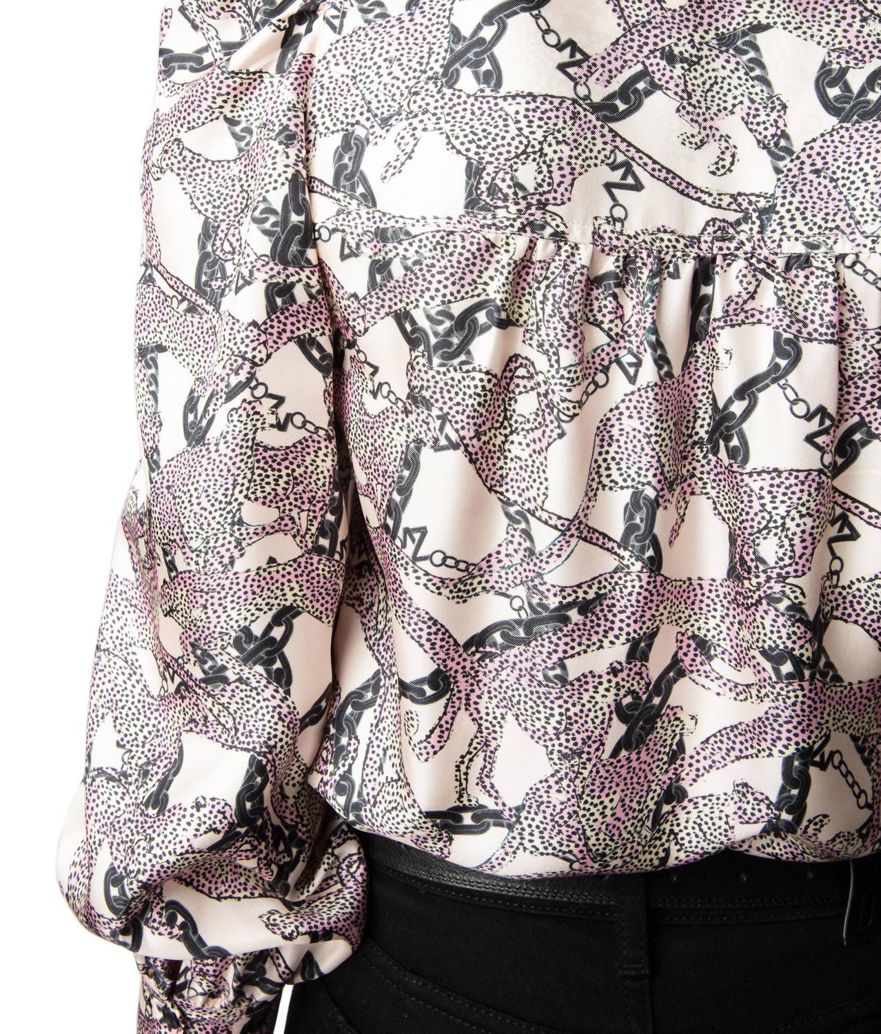 Pair this with your favorite jeans and slides for your next girls night out. Elevate your wardrobe with the Telia Silk Tunic Blouse by Zadig & Voltaire, a stunning piece in ecru adorned with a blush and black leopard and chain print. This V-neck blouse features long puffed sleeves with buttoned cuffs and measures about 25 inches from shoulder to hem. Crafted from 100% silk, offering a luxurious feel, this tunic is imported and designed for style and comfort. Closure: Pull-on. Care Instructions: Hand wash and lay flat to dry. Model is wearing a US size Small (5'10" tall).