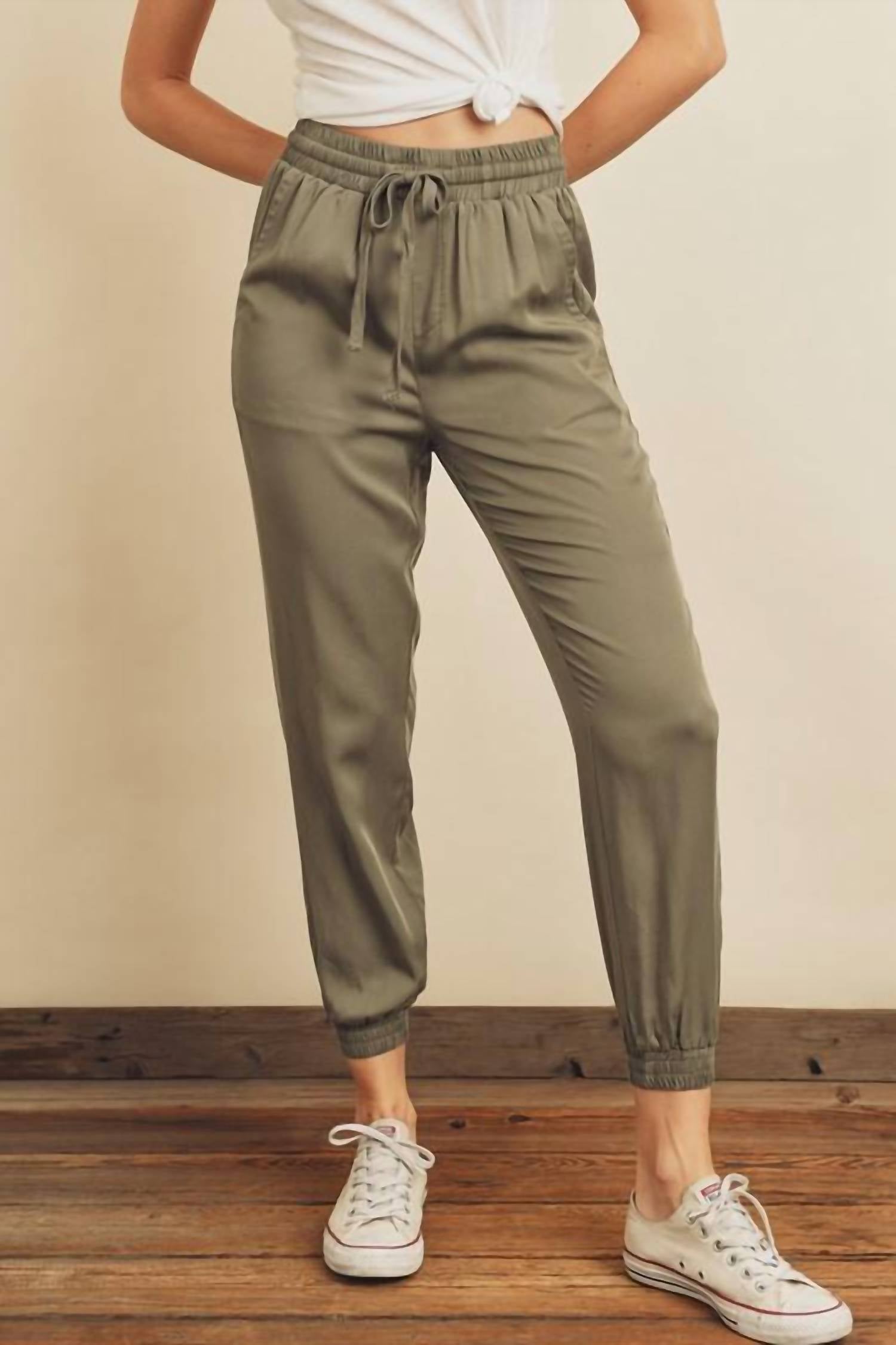 No gym necessary for these cool-girl joggers. Experience ultimate comfort with the Comfy Cozy Joggers by DRESS FORUM, crafted in Lyocell Tencel material for a natural feel. These Lt Olive joggers offer a high-rise, comfort fit with a tapered leg, ideal for stylish lounging or casual outings. With practical pockets and a convenient pull-on closure, these joggers seamlessly combine functionality with a sleek solid pattern. Perfect for any wardrobe, these joggers make a versatile and sustainable addition to your casual wear collection.