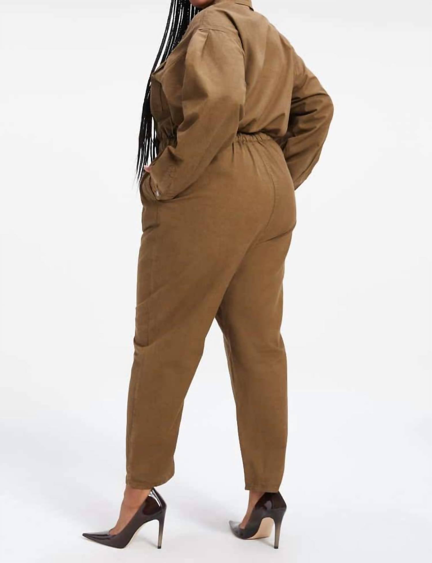Throw it on and go! GOOD AMERICAN CINCHED JUMPSUIT FOG The Good American Cinched Jumpsuit Fog is done with one. Featuring pouch breast pockets and a belt to highlight the waist, this structured yet seductive outfit is giving utilitarian vibes. Featuring body pockets down the front in a gorgeous dark olive green colour. Tie waist Soft twill belt Button down 42% Tencel 58% Cotton Machine wash cold