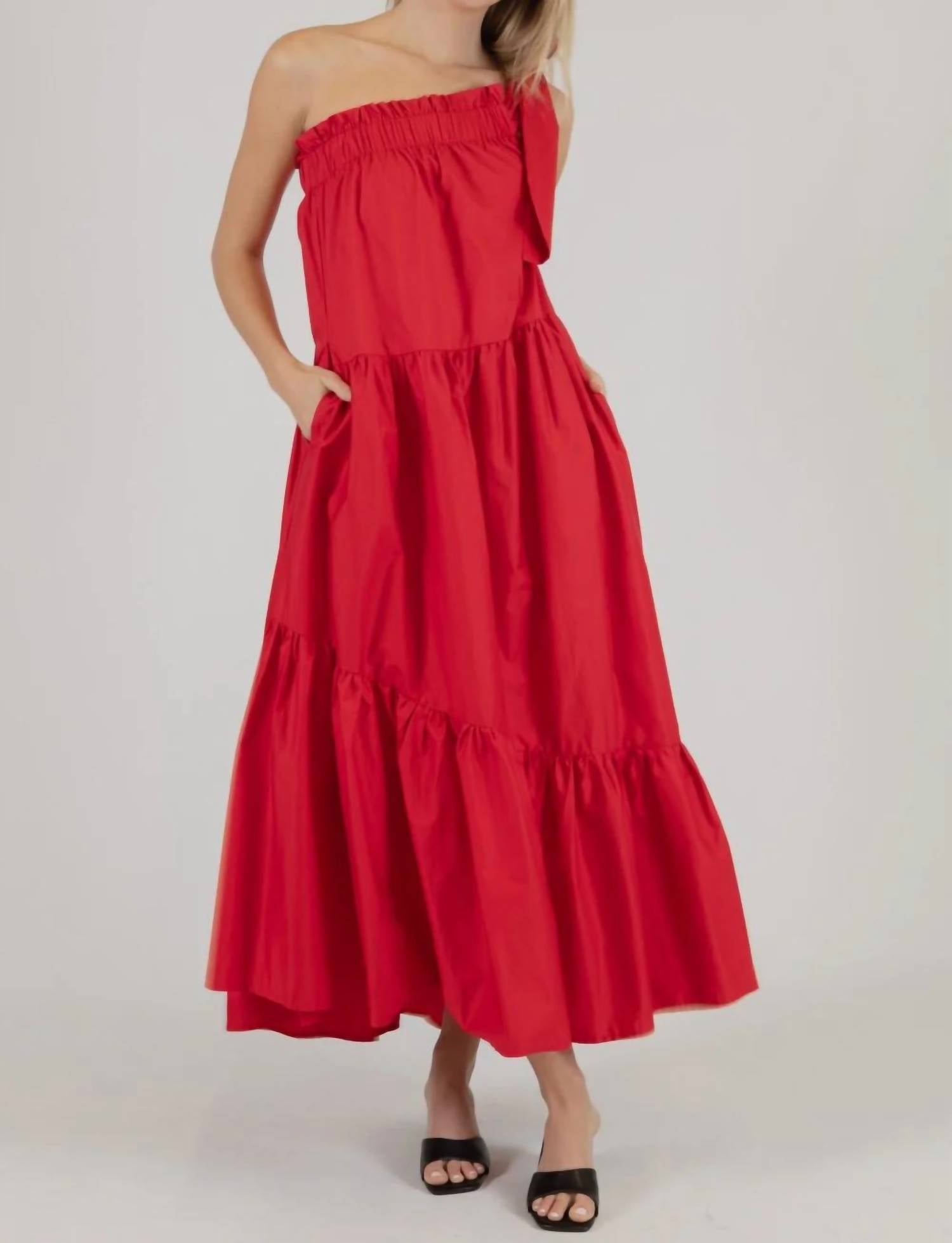 Show just the right amount of skin in this one-shoulder dress. Introducing the Poplin One Shoulder Maxi Dress by Before You Collection, a striking piece in vibrant red for any special occasion. This sleeveless dress is crafted from 100% Cotton, featuring elegant ruffle bottom details and a chic ribbon element. Designed in a flattering A-line silhouette with a tie closure for added convenience, it was made in China. Care: Hand wash recommended to maintain its shape and vivid color.