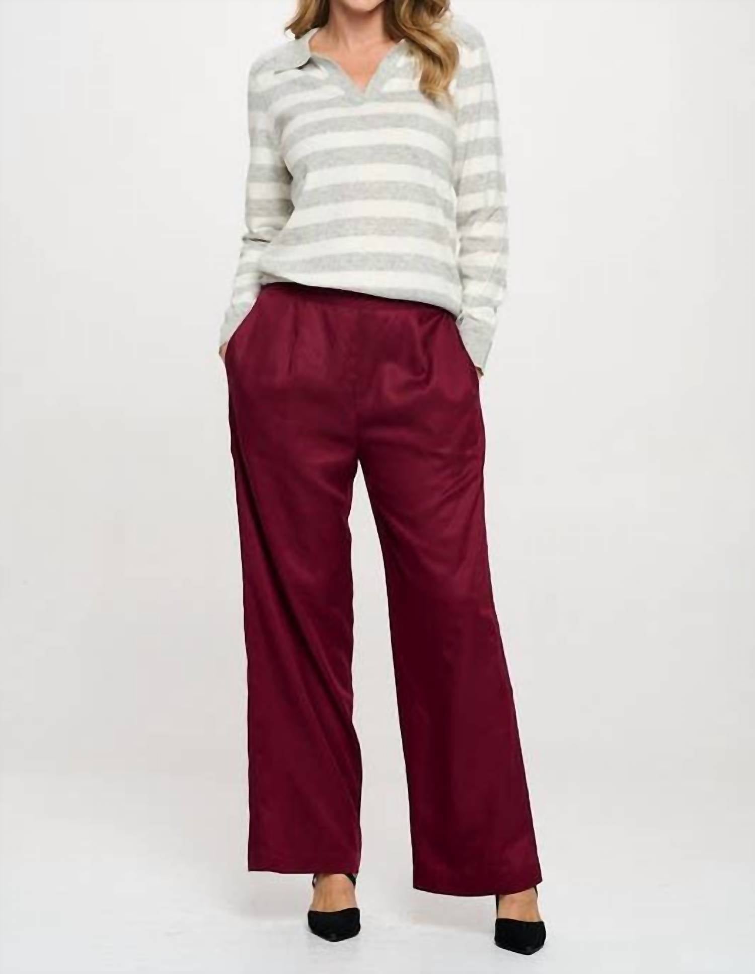 This straightleg pant is both stylish and comfortable. Did we mention the fit is perfection? Discover the Solid Straight Leg Pants With Pockets by reneec., an elegant choice for women seeking comfort and style in burgundy. Featuring a relaxed fit with a high-rise waist, these pants are perfect for effortless sophistication. Crafted from 100% Lyocell for a luxurious feel, they boast a pull-on closure and practical pockets, exemplifying both fashion and functionality. Proudly made in the USA, they are a straight-leg staple in any wardrobe.