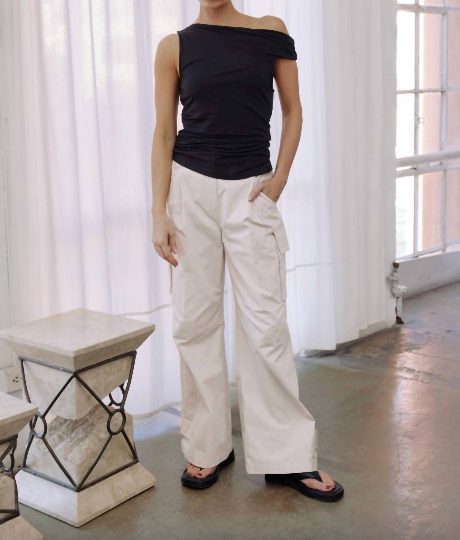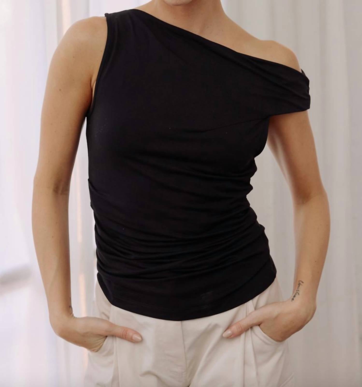 Fit, fabric and functionality. This tank top checks all the boxes. This sleeveless top, crafted from a soft blend of 72% Modal, 24% Polyester, and 4% Spandex, features an elegant asymmetrical twist shoulder with ruching at the waist, offering a flattering fit. With a convenient pull-on closure, it effortlessly combines comfort with sophistication. Perfect for pairing with your favorite summer staples, this solid tank top exudes effortless elegance.