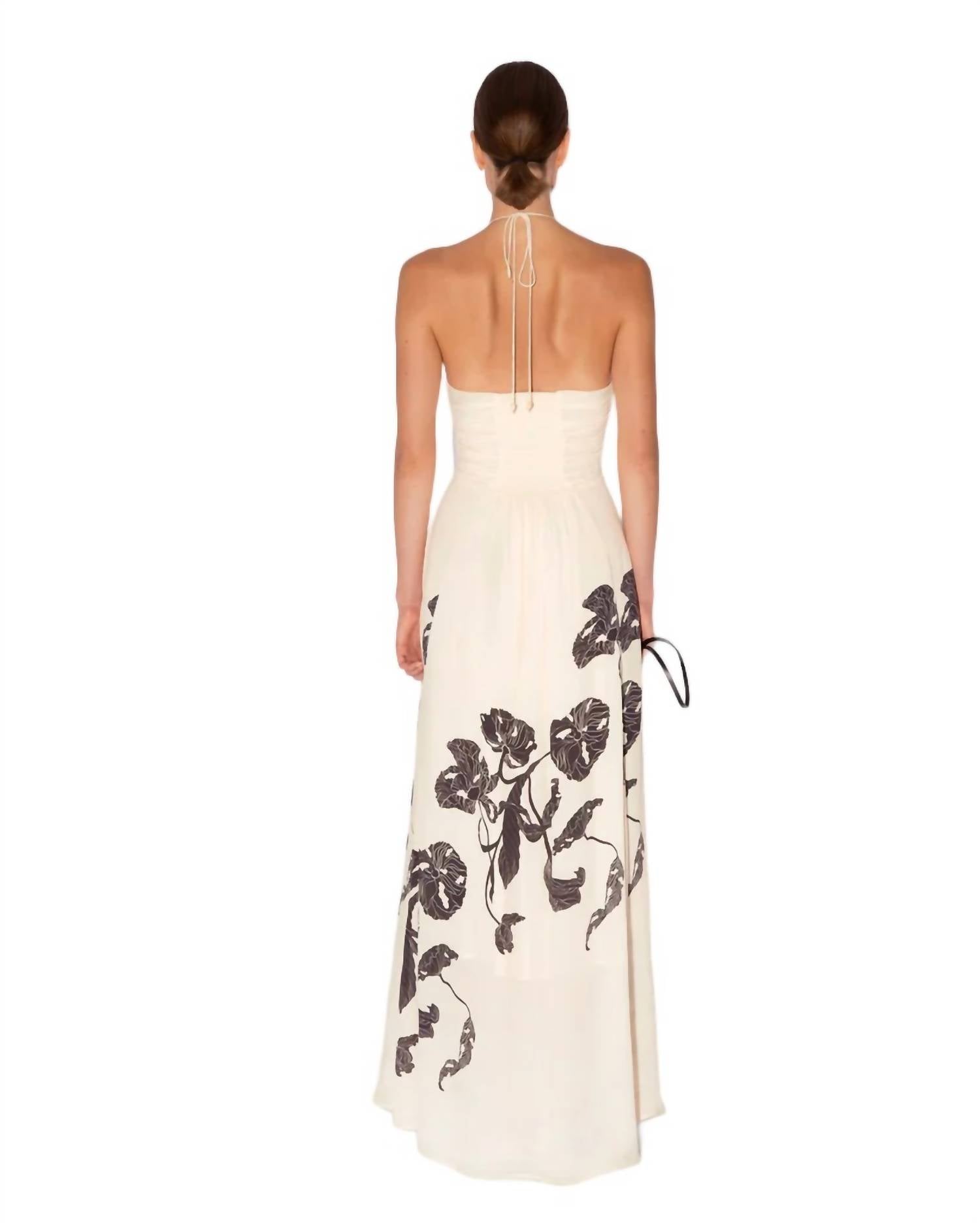 This Dress is made from a silk rayon crepe blend with an A-line silhouette, gathered details, a chest cut-out with beading, and a halter-neck style. It features a maxi length and a tie closure, suitable for garden parties and evening events.