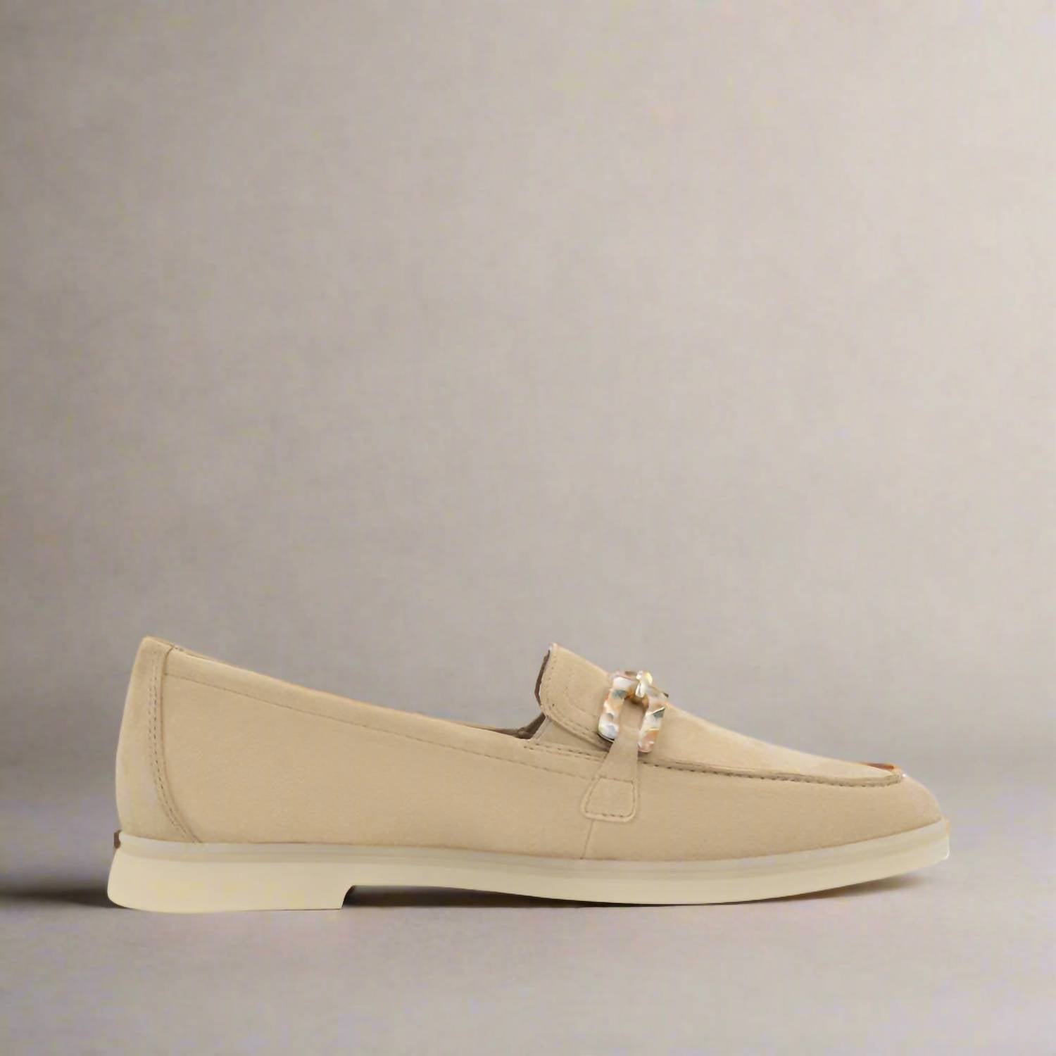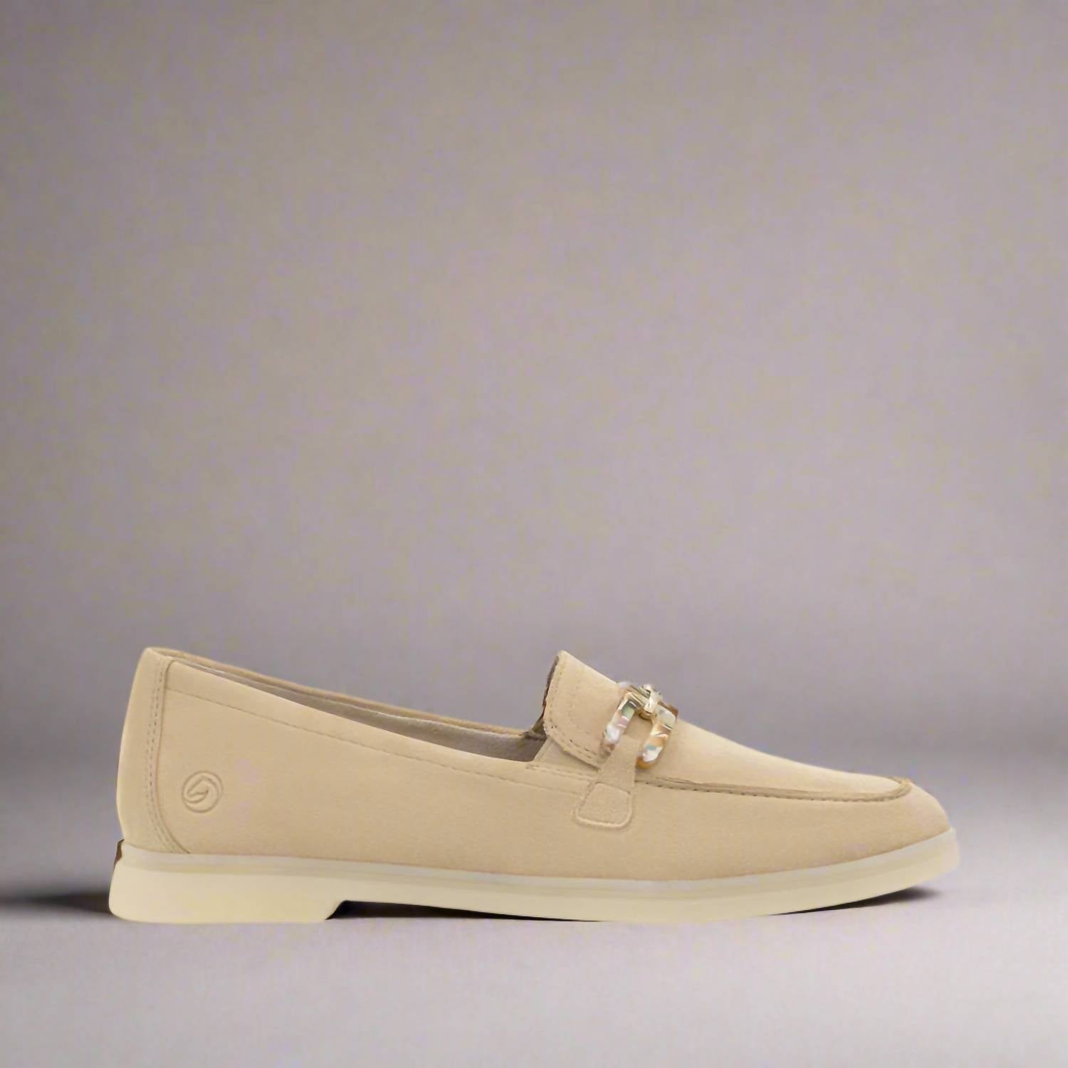 Loafers so versatile you can wear them with just about anything. Introducing the Women's Loafers by Remonte, a chic addition to any wardrobe with a vintage flair. These loafers are crafted from soft beige nubuck suede, featuring a resin chain detail that adds a touch of elegance. Designed for comfort, these shoes have a round toe and flat heel, making them perfect for vacations or spring outings. Shoe width is medium, ideal for those seeking a stylish yet practical choice.