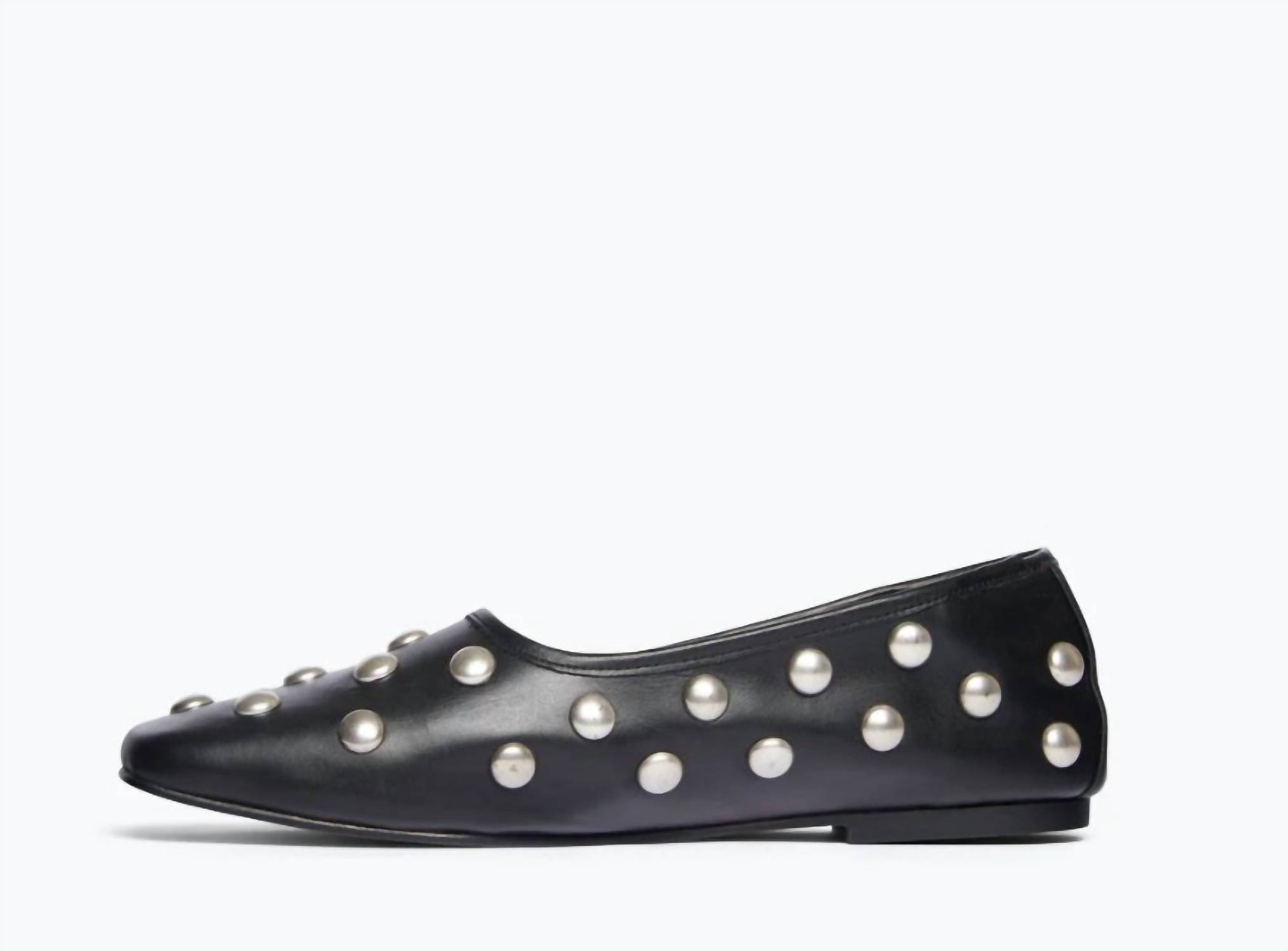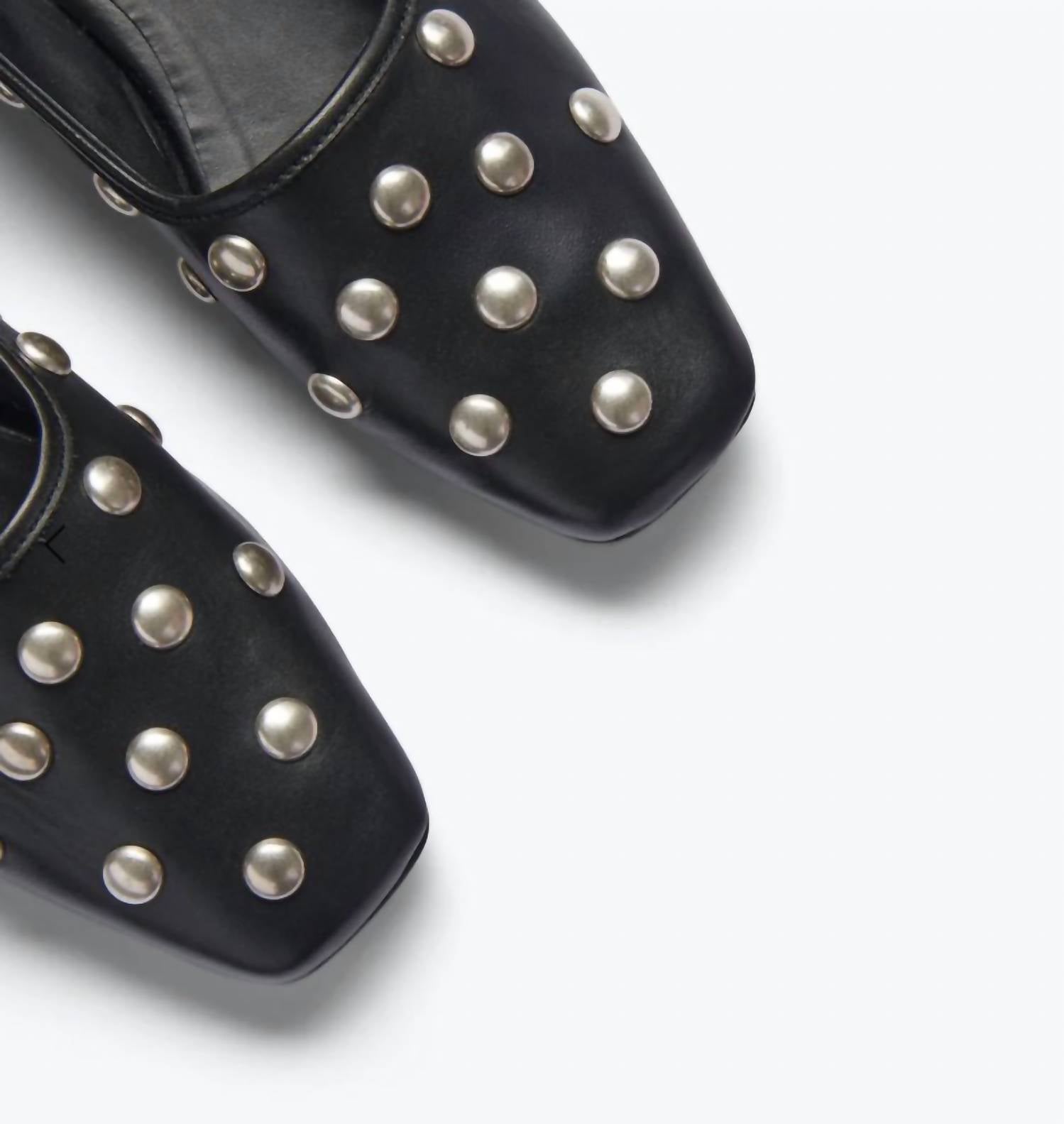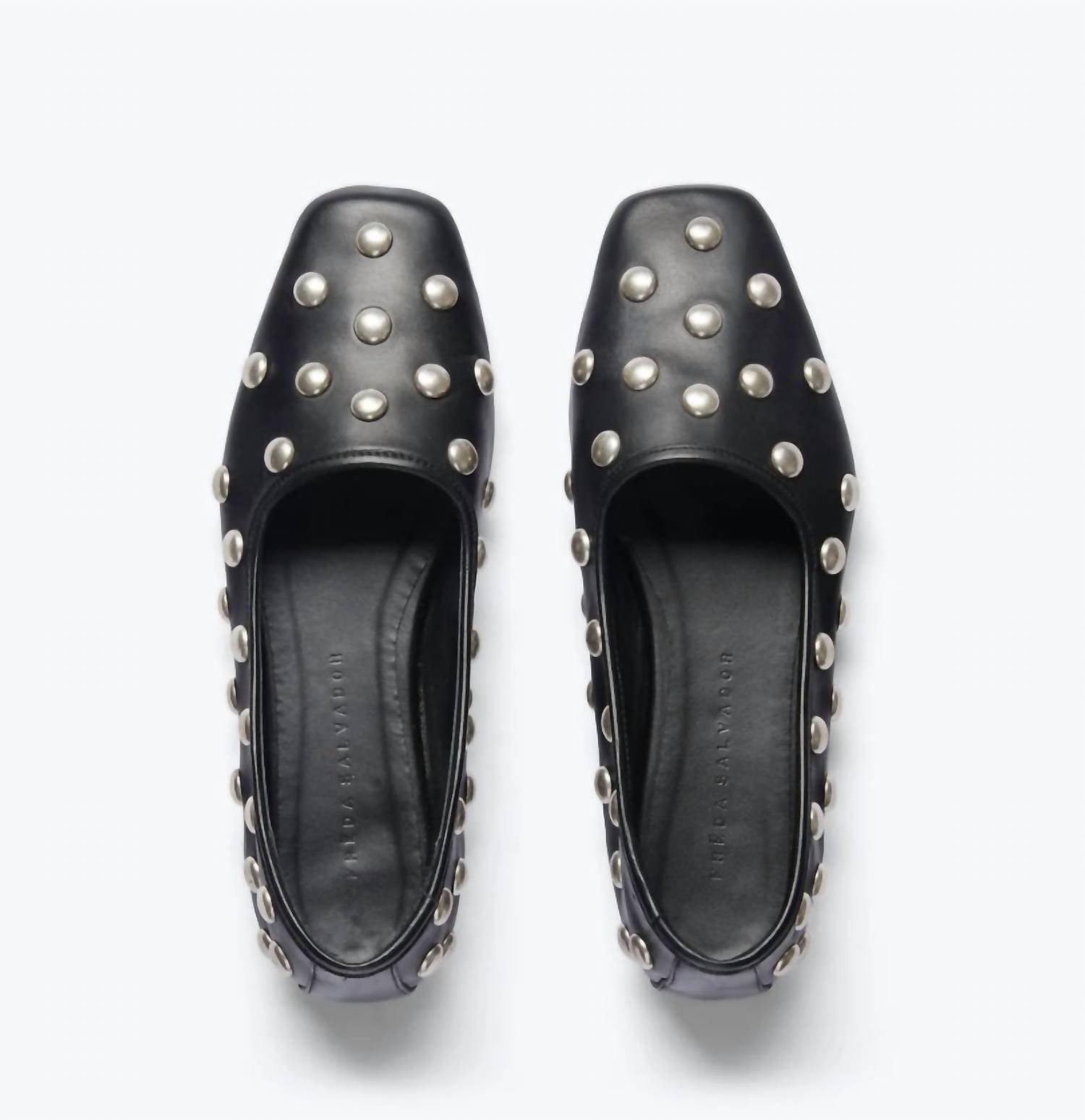 A preppy yet feminine take on the classic loafer. Introducing the Women's Jessie Ballet Flat Shoes by FREDA SALVADOR, a chic blend of style and comfort. Handcrafted with 100% Spanish leather in black calf, these flats are lined with the same premium material from a Leather Working Group Approved Trader. Featuring Spanish silver-plated metal studs and a modern squared toe, this versatile flat is perfect for any engagement occasion. The sueded leather sole with a 0.25" rubber heel ensures a comfortable fit, making it a must-have for your spring workwear collection.