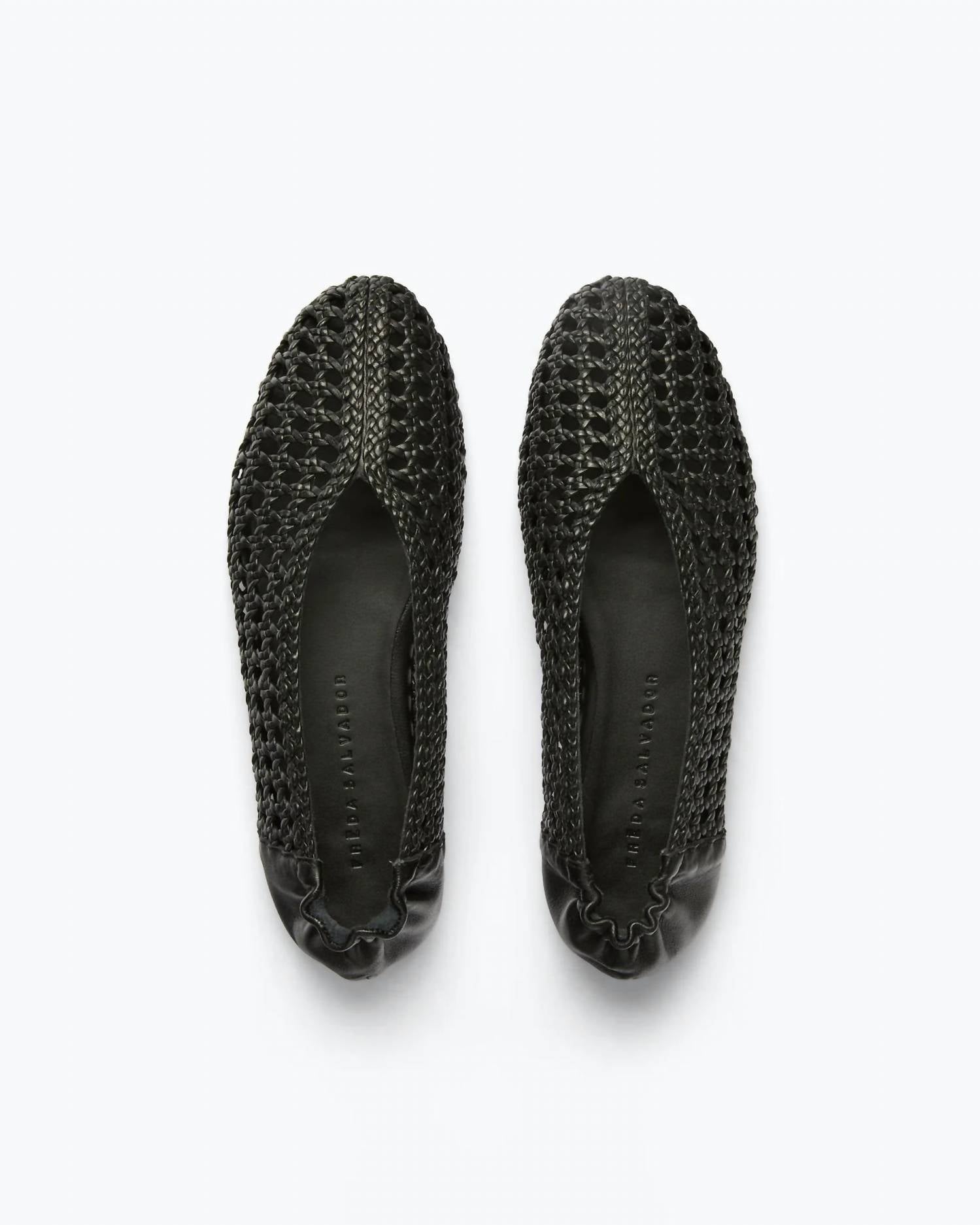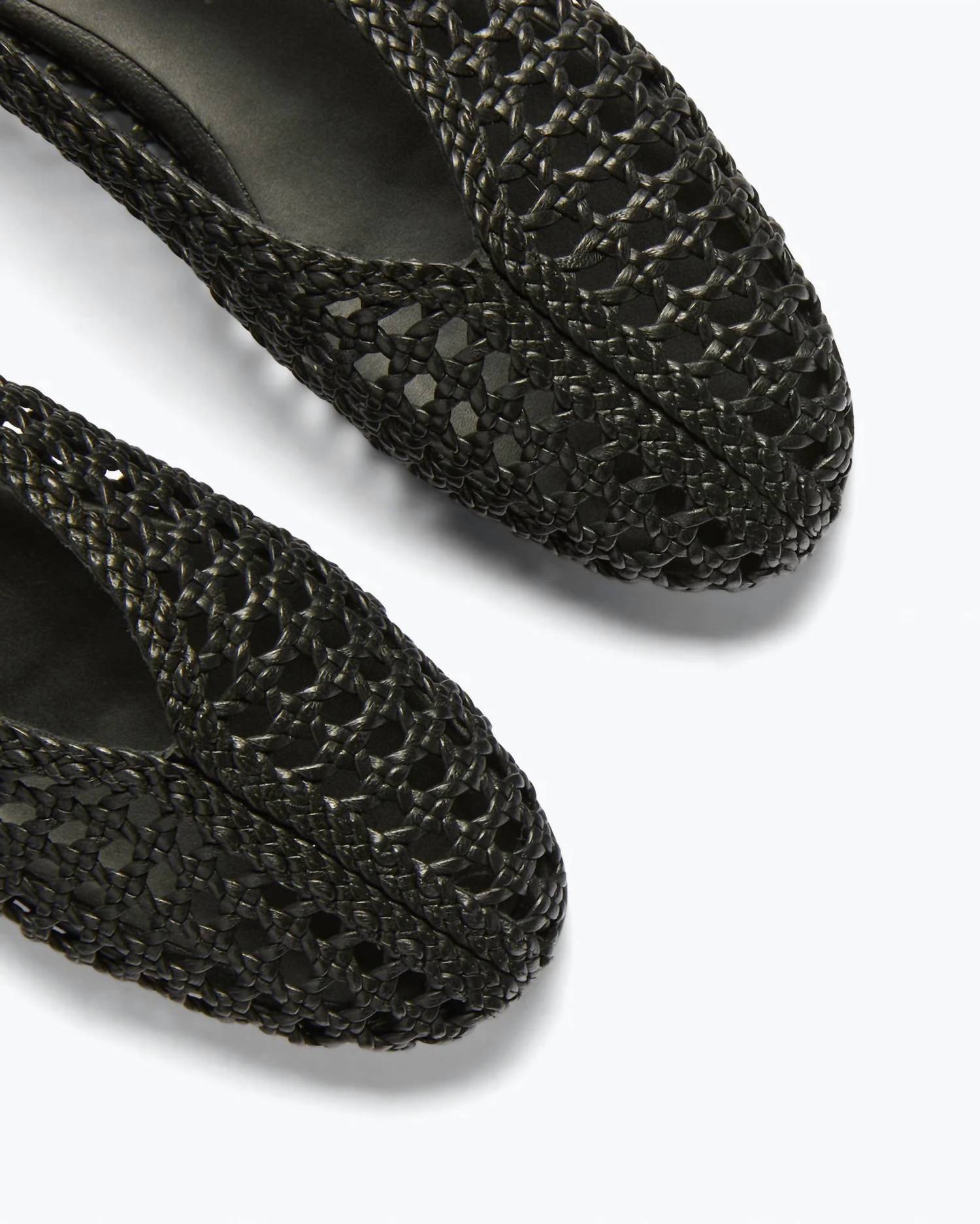 A classic loafer that is both comfortable and polished. The Women's Riley Open Weave Flat by FREDA SALVADOR embodies a modern take on a timeless classic. Crafted artisanally in black calf leather, this ballet flat features an almond toe and elasticized heel for a comfortable fit. The flexible, unlined design is complemented by a padded leather footbed and a 0.25" rubber heel, ensuring both style and practicality. Perfect for any minimalist wardrobe, these flats are ideal for pairing with jeans or trousers, seamlessly transitioning from casual outings to more formal occasions.
