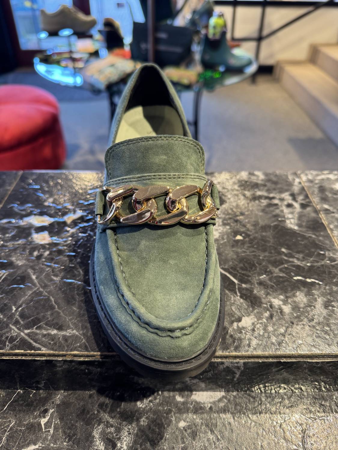 A preppy yet feminine take on the classic loafer. Introducing the Women's Monte Loafer by Salvia in a sophisticated hue, crafted in premium suede. These slip-on loafers feature a luxurious gold chainlink bit detail, elevating any outfit. Designed with a round toe and block heel, they offer a chic silhouette and the low heel height ensures comfort throughout the day. Perfect for adults seeking both style and ease in any setting.