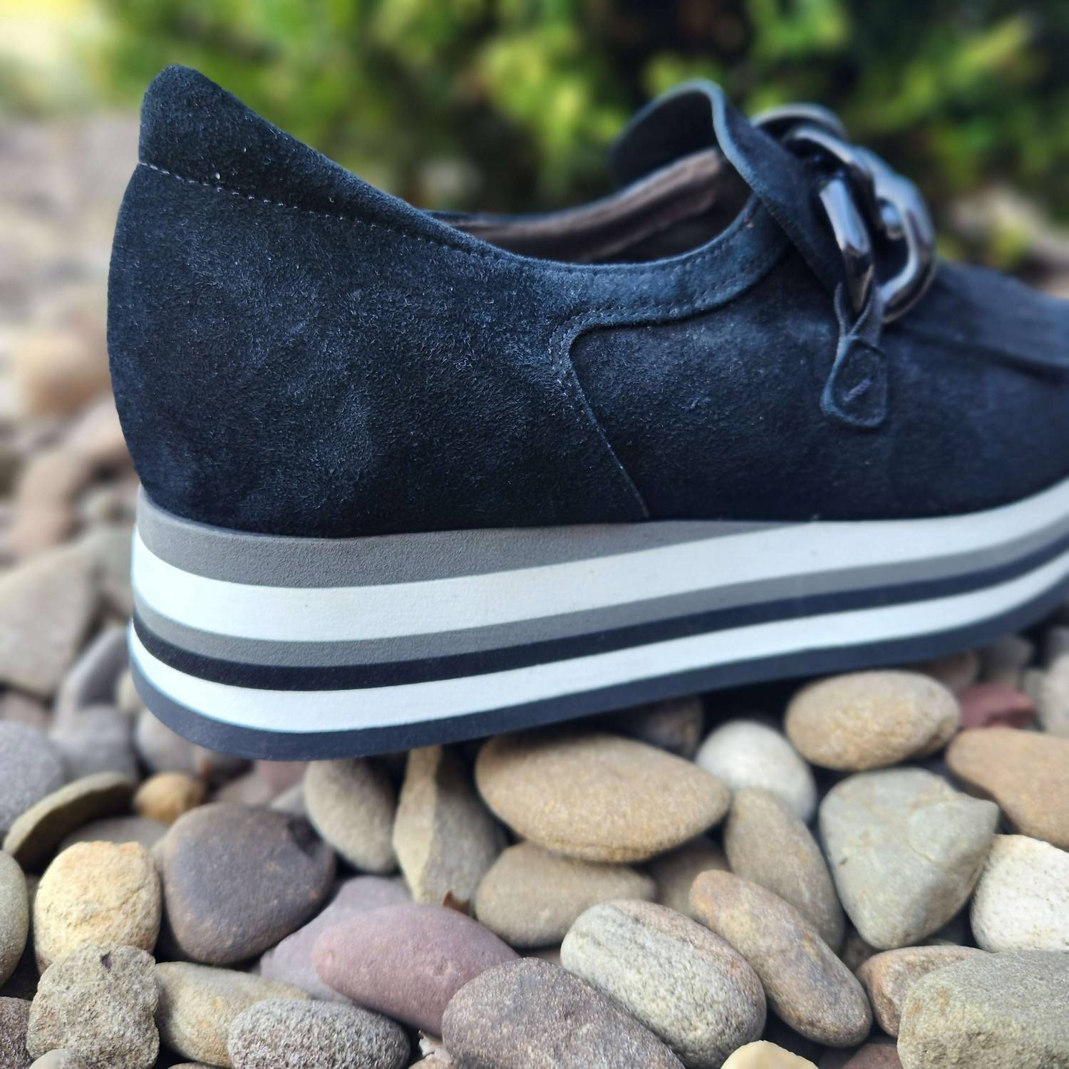 A classic loafer that is both comfortable and polished. Step into the summer trend of athleisure with the Women's Cadie Platform Sneakers by Softwaves in striking black. These versatile flatforms offer the perfect blend of style and comfort with a perforated loafer-style upper and removable insoles for customized arch support. The unique chain and fringe front accents add flair, making them ideal for travel. Constructed with a round toe and flat 1" platform heel, these sneakers offer both style and substantial comfort, fluently transitioning from casual to chic.