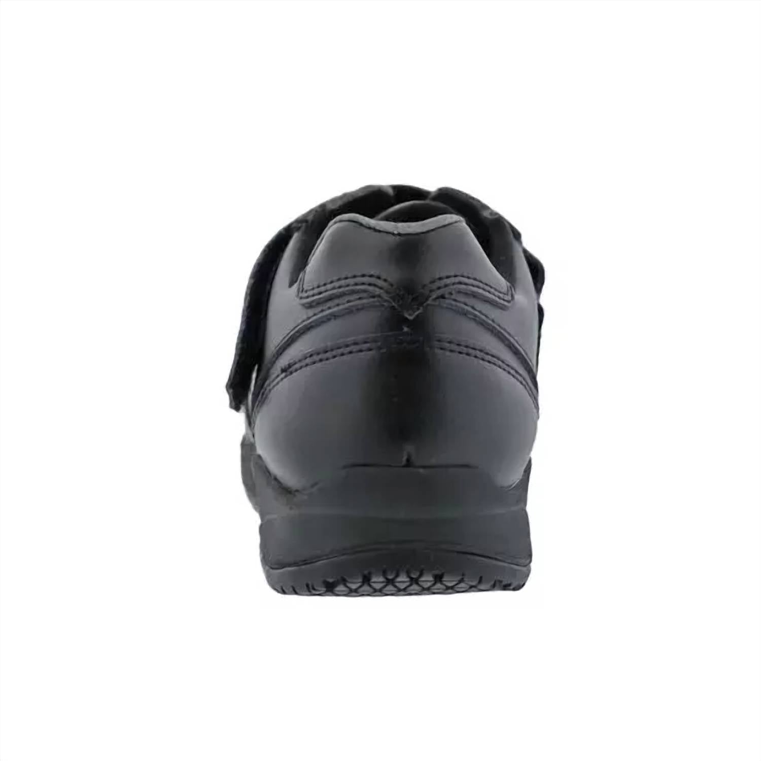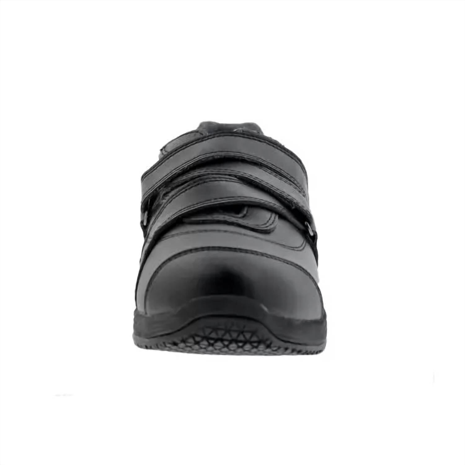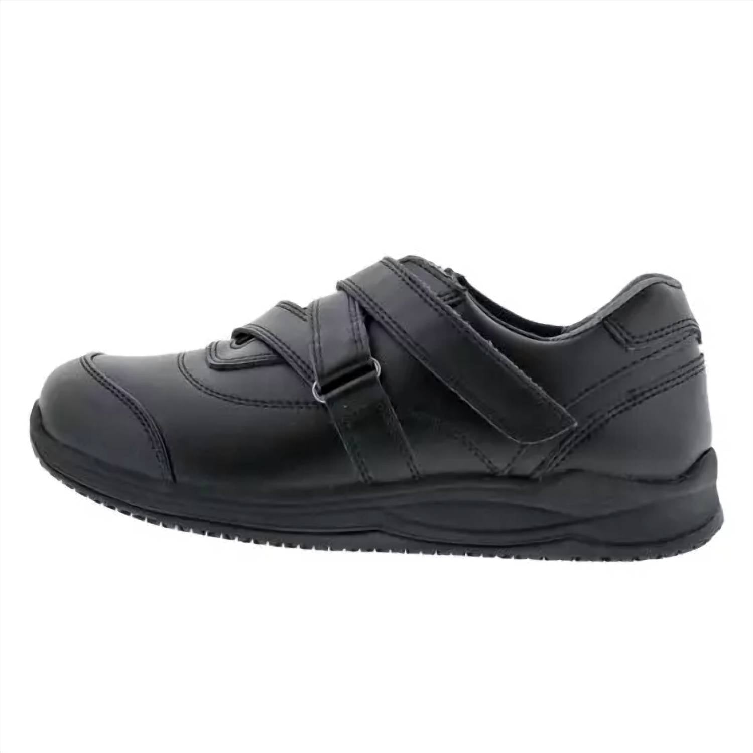 A classic loafer that is both comfortable and polished. Meet the Women's Pepper Casual Shoes by Drew Shoes, a perfect blend of comfort and functionality in sleek black leather. These shoes feature a unique one-piece criss-cross closure and a firm heel counter to reduce slippage and provide superior support. Designed with the Plus Fitting System®, they offer two removable insoles allowing for added or double depth, ideal for accommodating prescribed orthotics. The restaurant-grade Grip Lock® sole is slip-resistant, oil-resistant, and non-marking, ensuring reliable traction with a lab-tested co-efficiency rating of 0.63 dry and 0.61 wet.