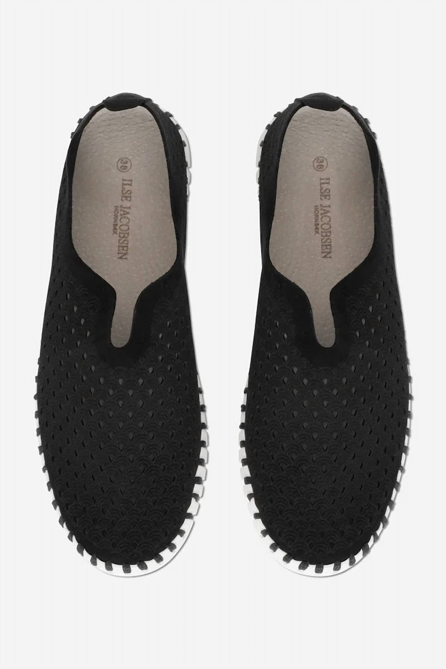 A classic loafer that is both comfortable and polished. Step into comfort with the Women's Tulip Shoes by Ilse Jacobsen, crafted in sleek black for a touch of Scandinavian flair. These shoes feature a durable, fully flexible sole made from 75% natural rubber and 25% recycled rubber, paired with a sustainable recycled microfiber upper. Designed with a flat heel under 1", a round toe, and a decorative laser-cut pattern, they ensure both style and comfort. Perfect for summer, the insole is lined with pig suede for added softness and support.