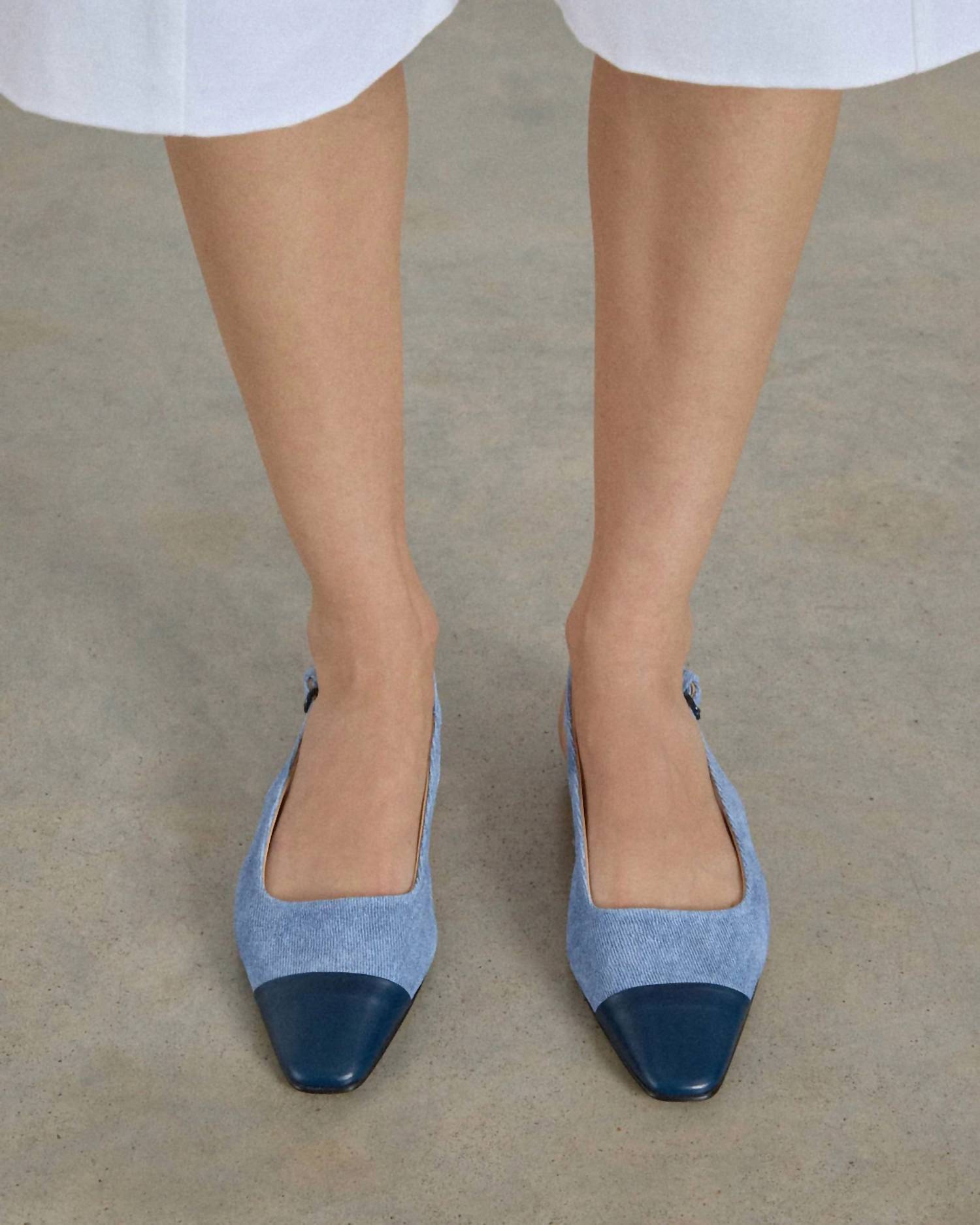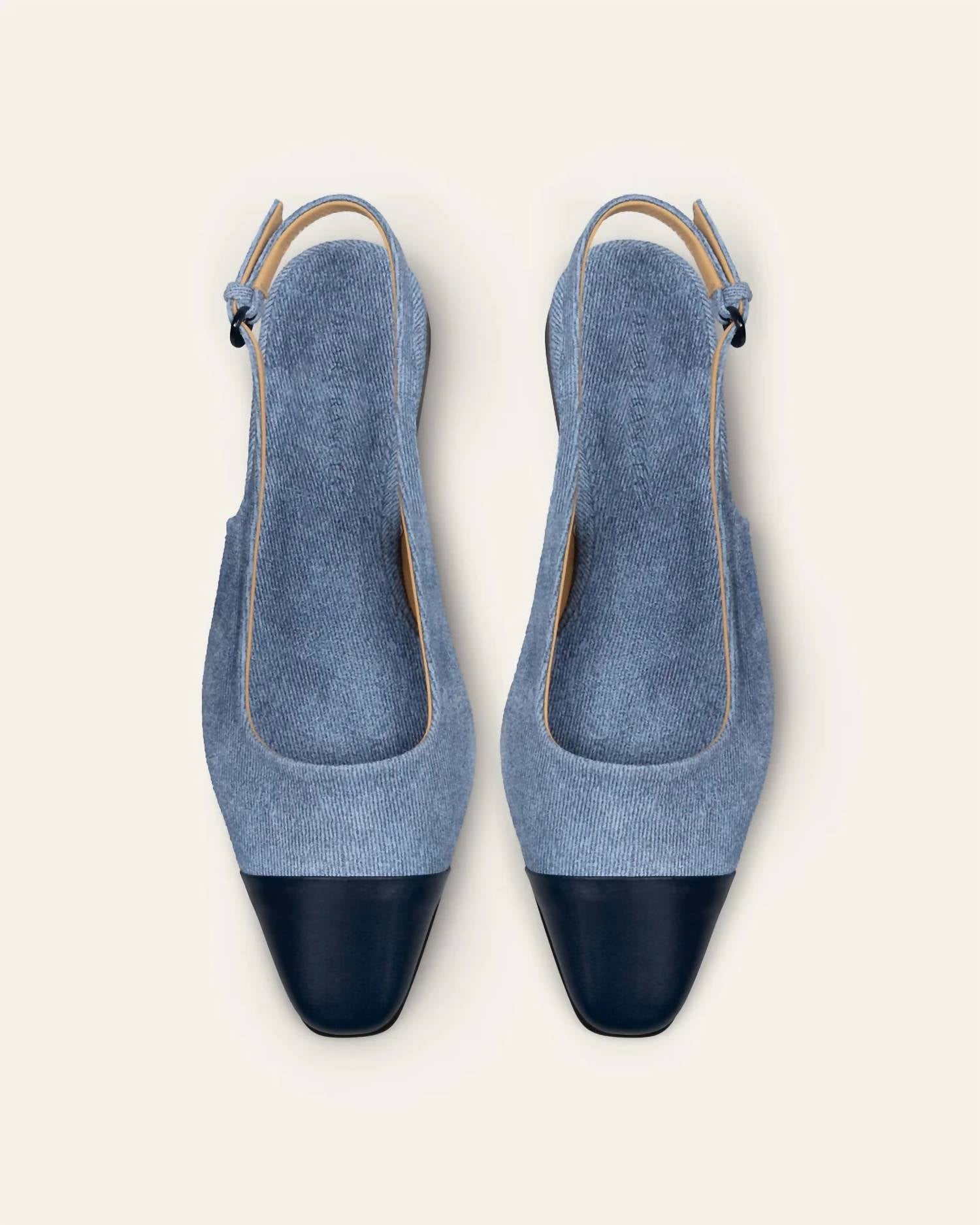 A preppy yet feminine take on the classic loafer. Step into timeless style, expertly crafted in Italy. Feature a modern slingback silhouette in exclusive denim-effect suede with a sophisticated leather toe cap. Almond toe shape and flat cuoio heel provide comfort and elegance, making them perfect for travel and 90s-inspired looks. Designed with high-quality leather insole wrap, lining, and outsole. Emphasize long-lasting quality and sustainable fashion choices.